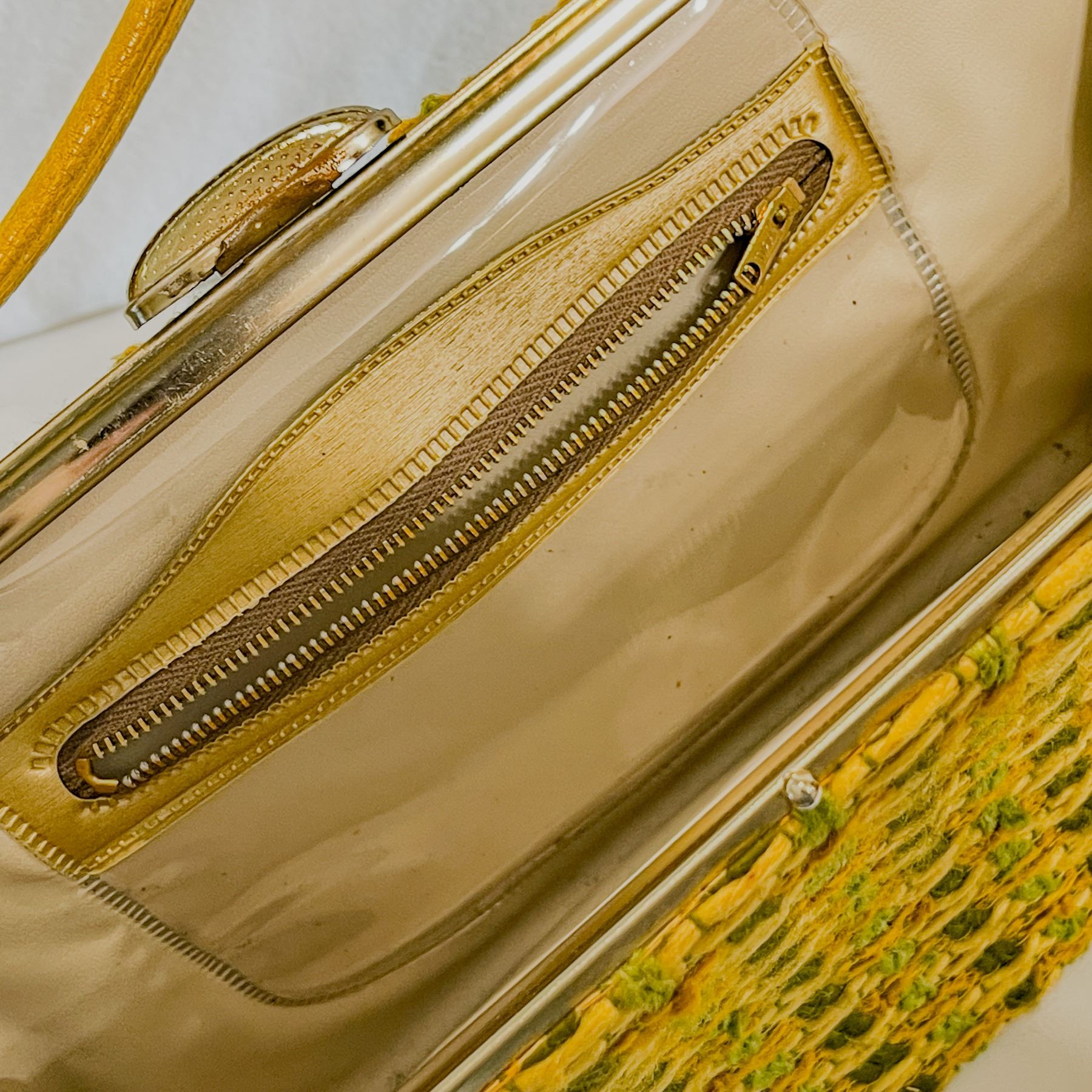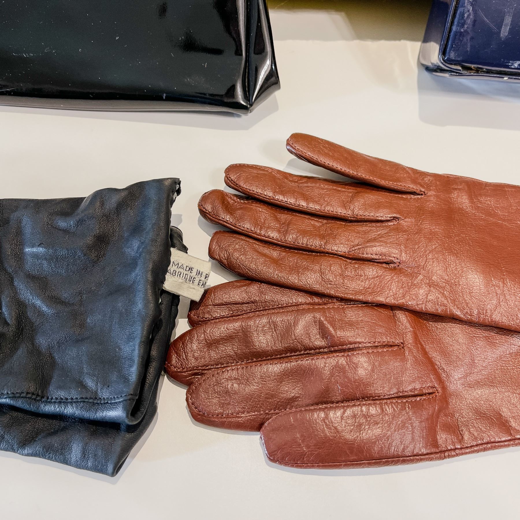 Collection of mid-century handbags and gloves including a yellow-green woven purse with leather handle, black patent clutch, navy structured patent bag, and two pairs of soft leather gloves in brown and black. All vintage pieces in good condition with light age wear.