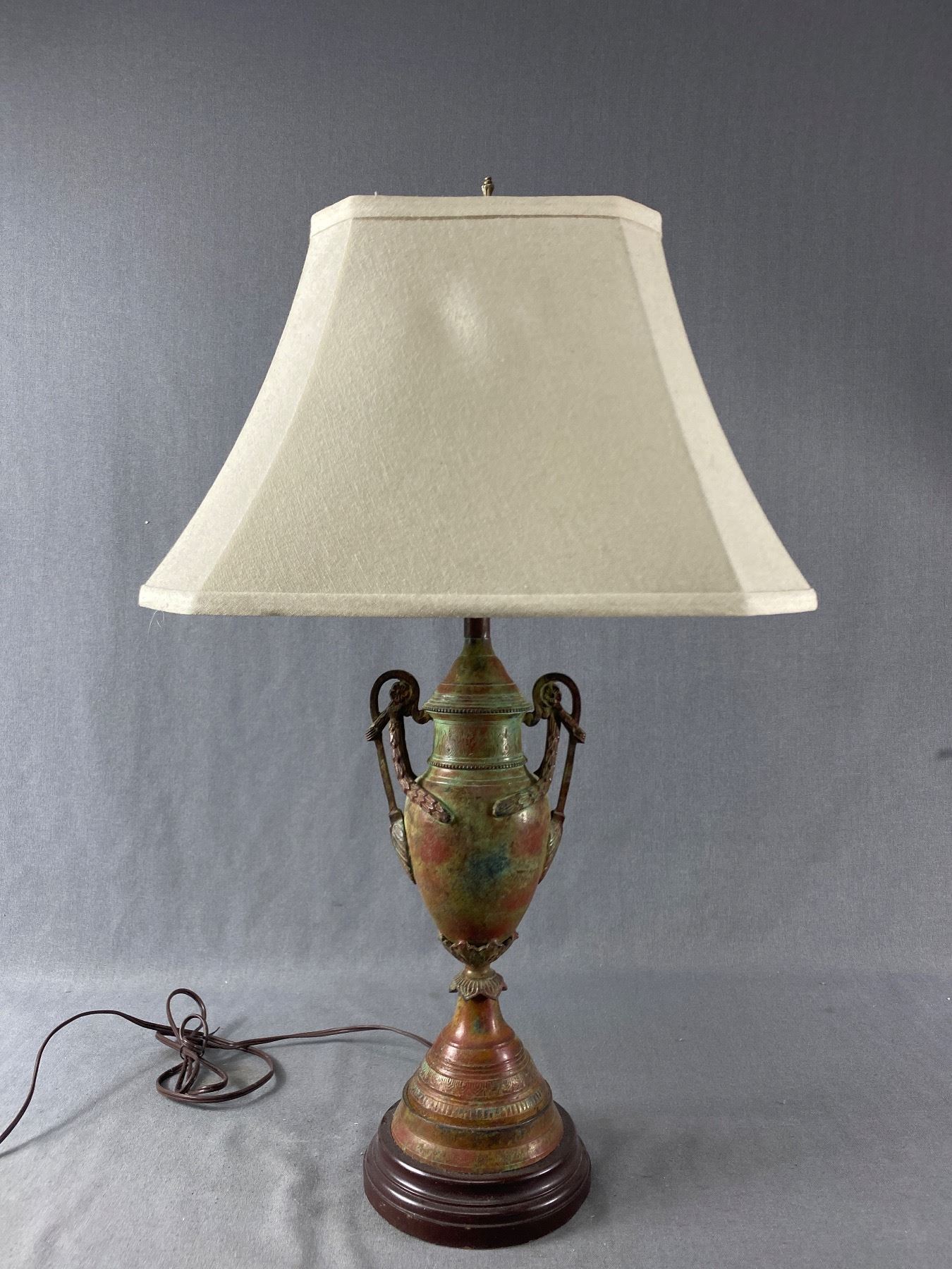 Vintage Heavy Metal "Vase" Lamp w/Shade. NO SHIPPING. Approx. 28" H w/Finial