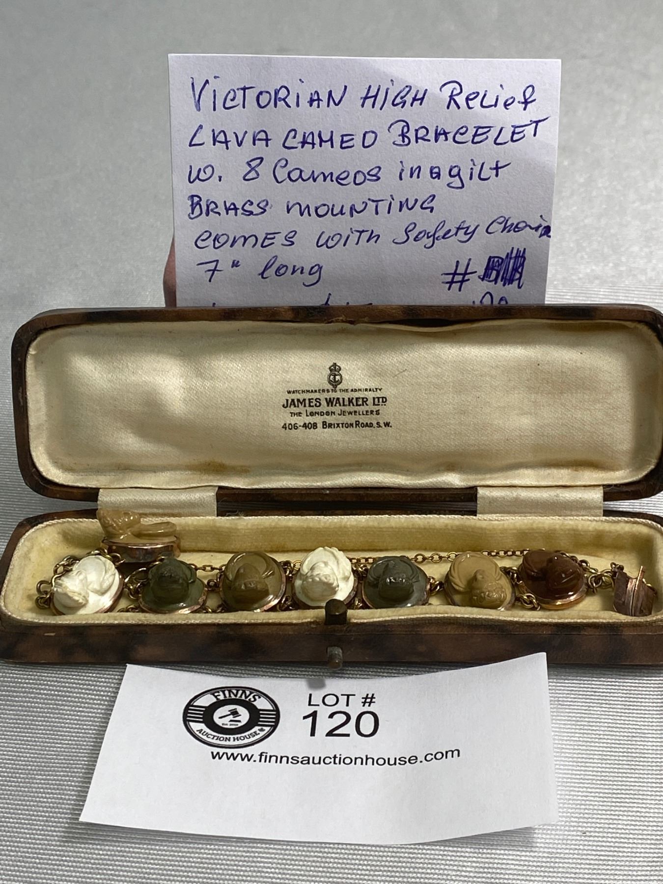Vintage High Relief Lava Cameo Bracelet with 8 Cameos In a gilt Brass Moutning. Comes with Safety Chain