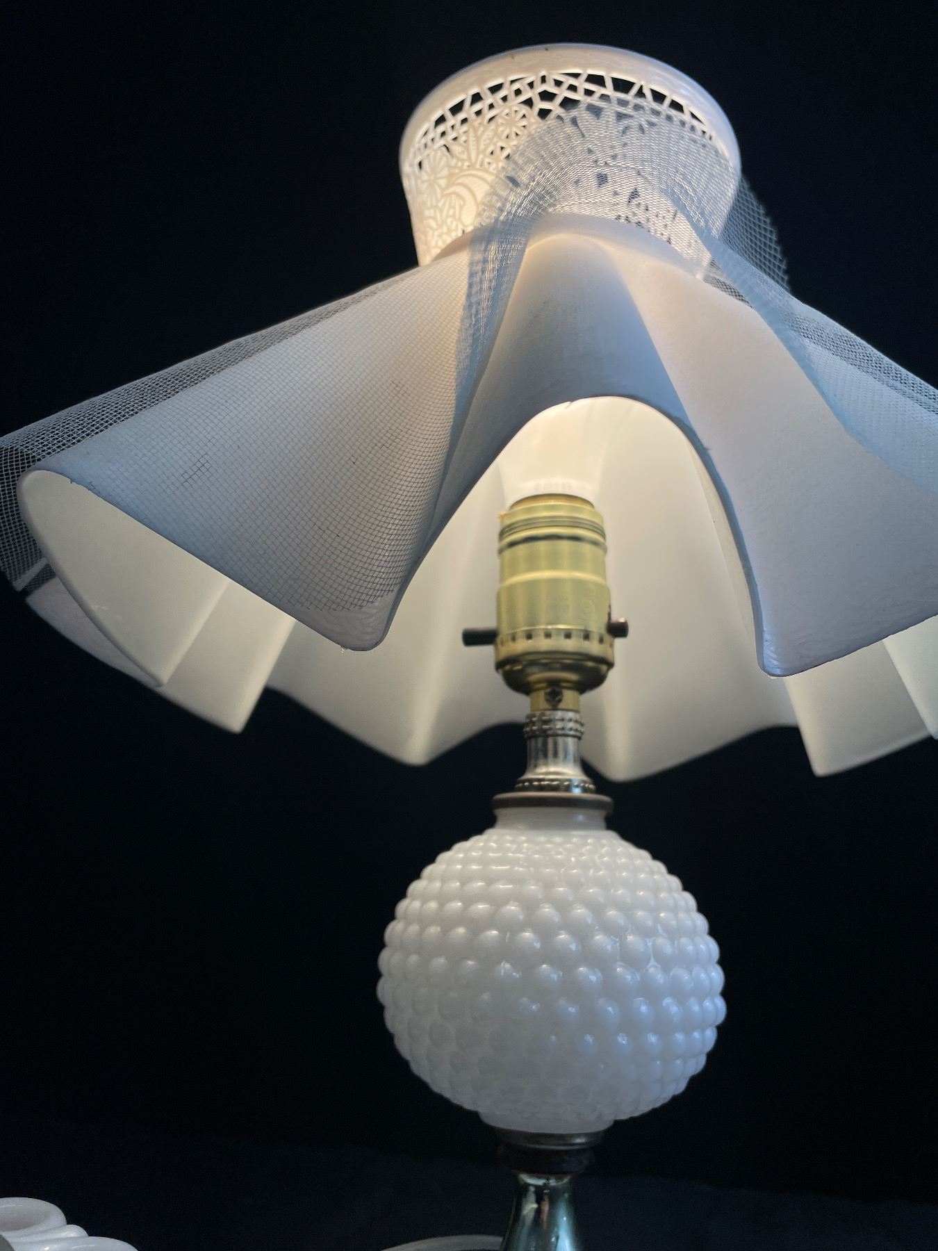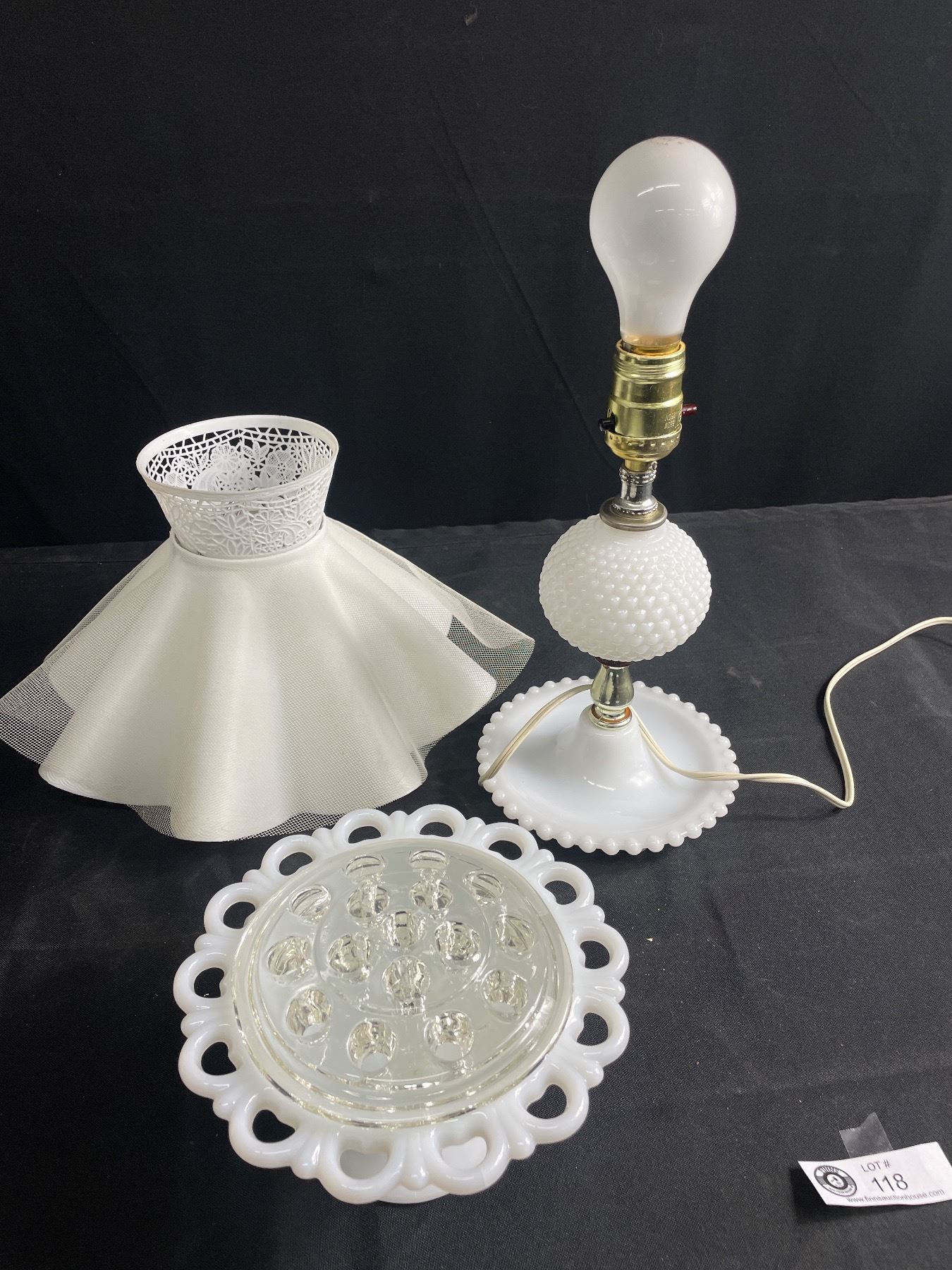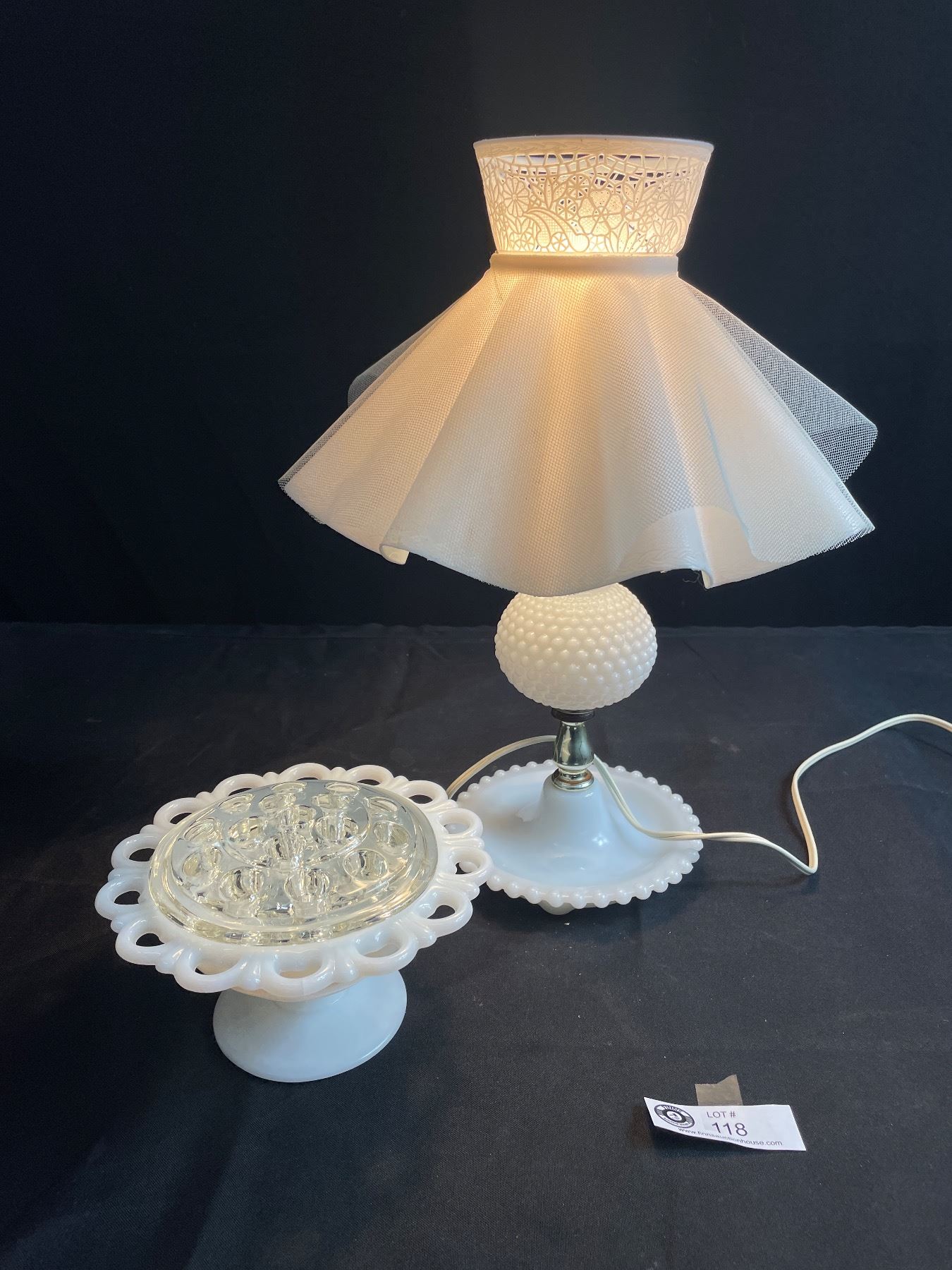Vintage Hobnail Milk Glass Boudoir Lamp and Pedestal Flower Bowl w/ Glass Frog