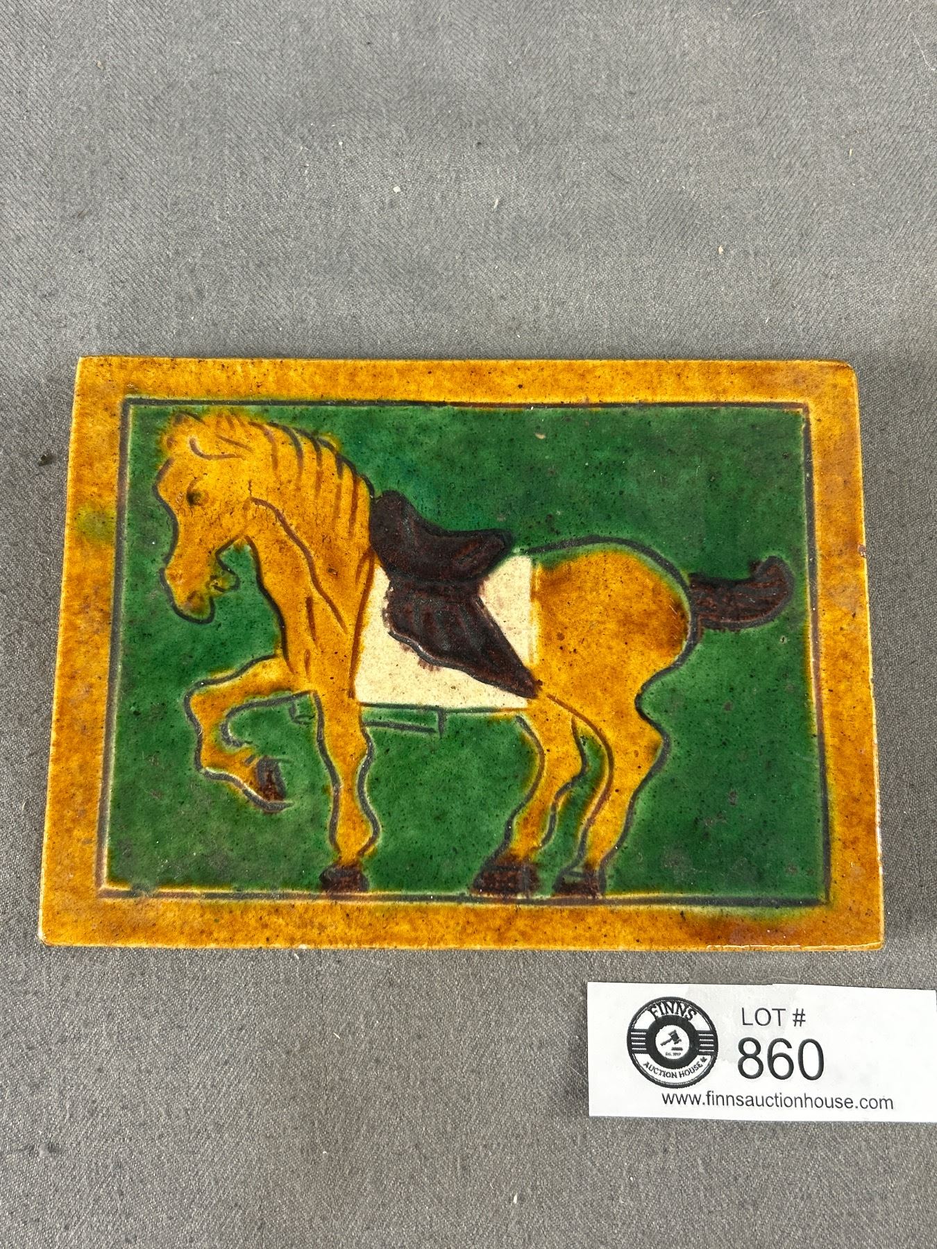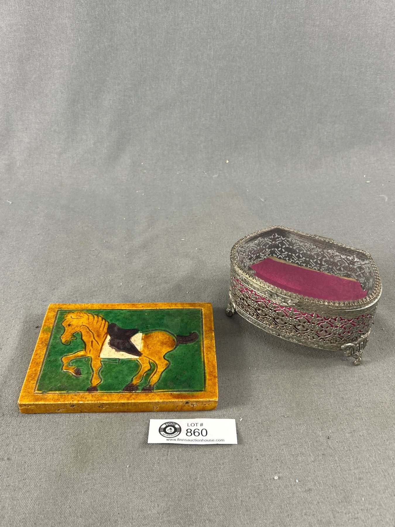 Vintage Horse Tile Art Approx. 6" x 4.5" x .5" & Ornate Design Metal Trinket Box