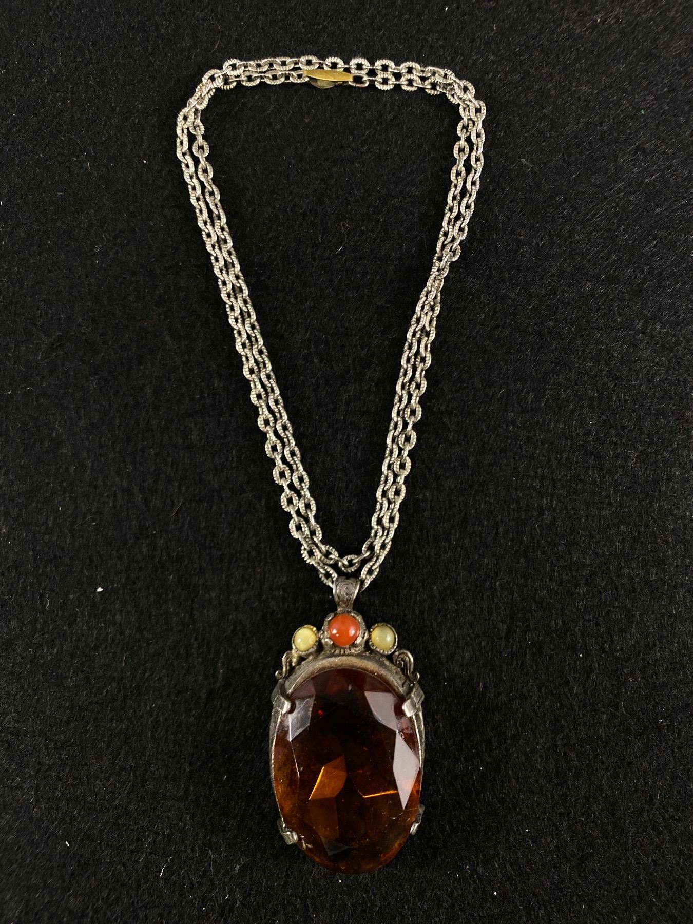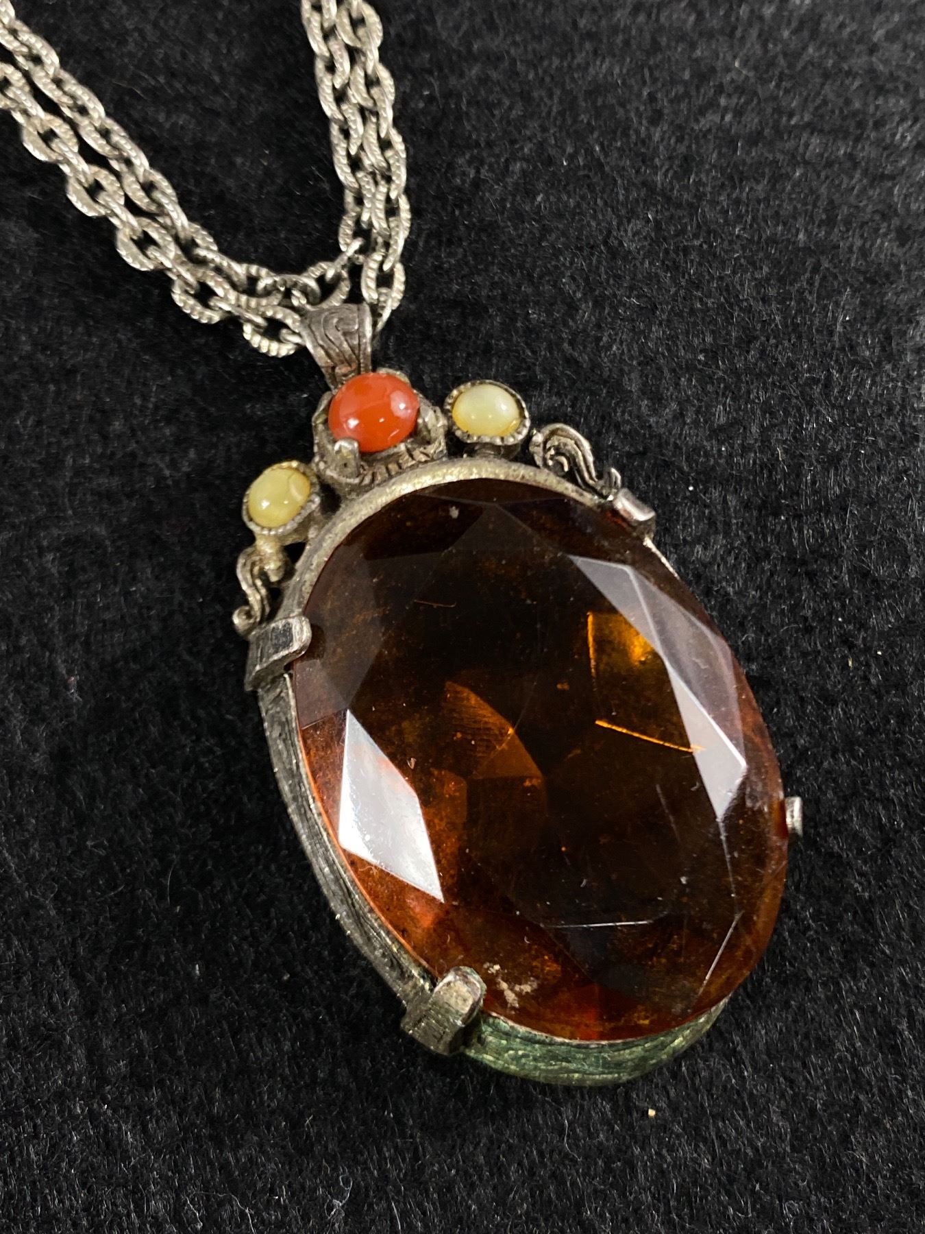 Vintage Huge Amber Color Glass Pendant w/ Chain Necklace