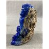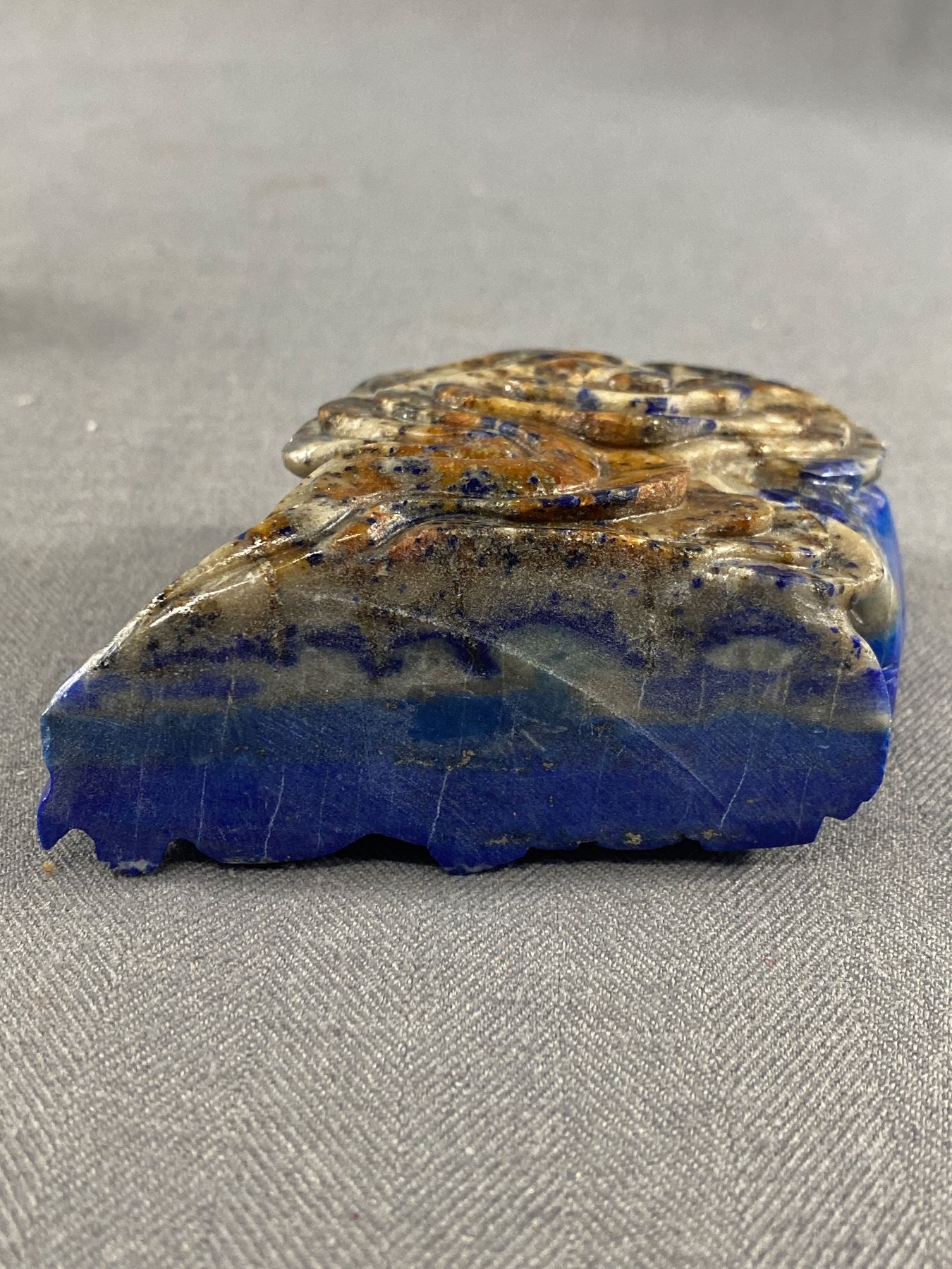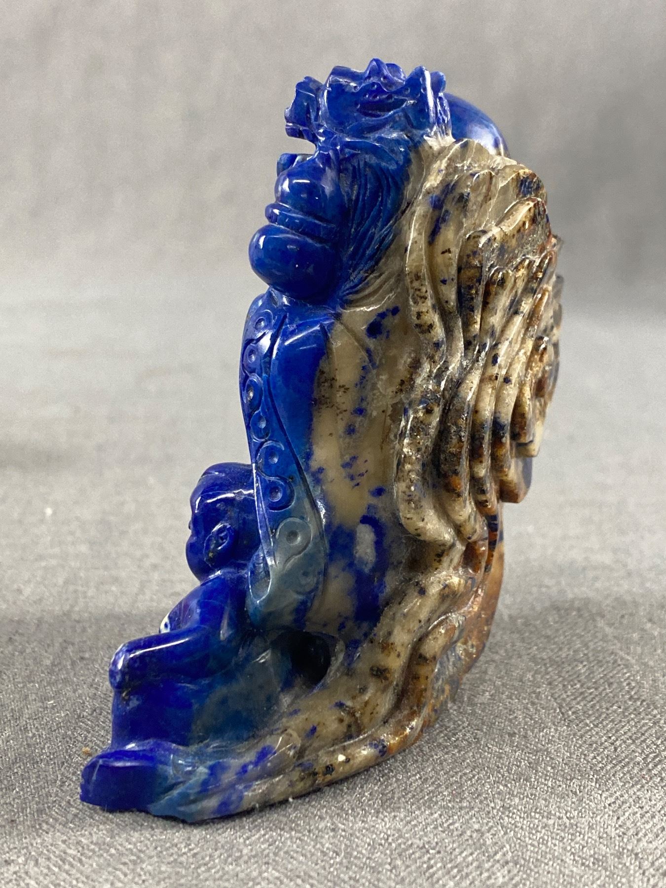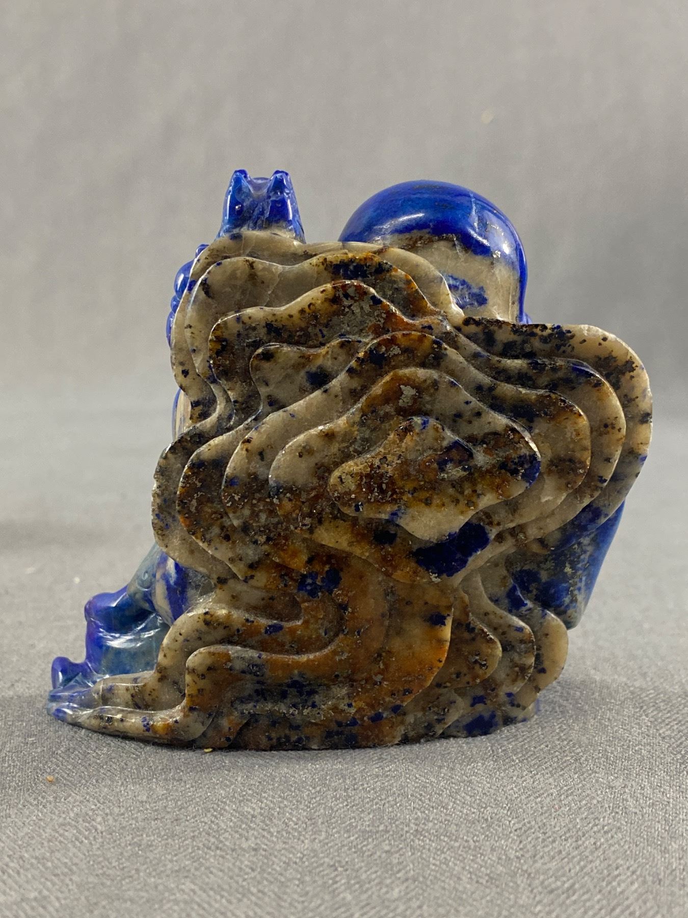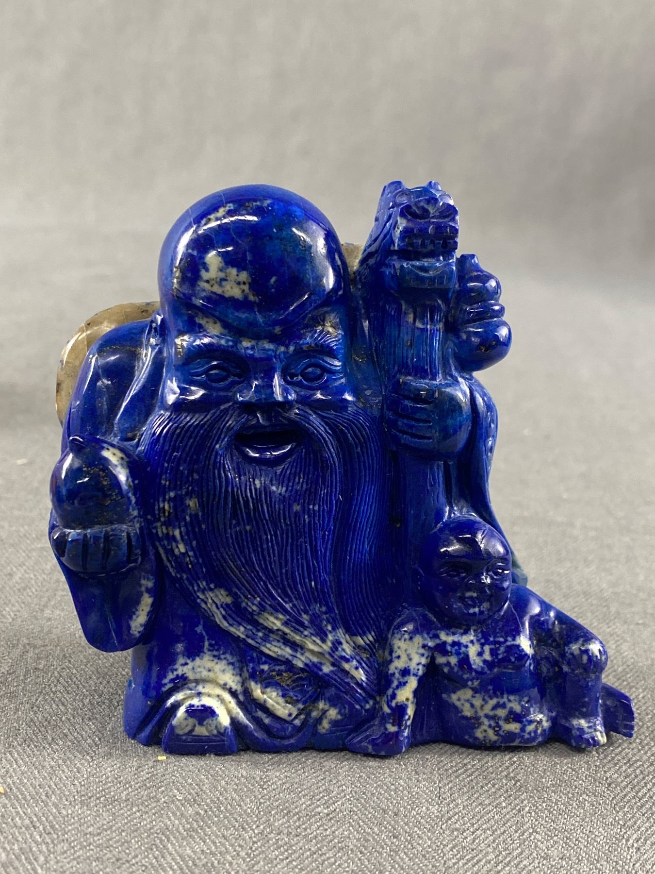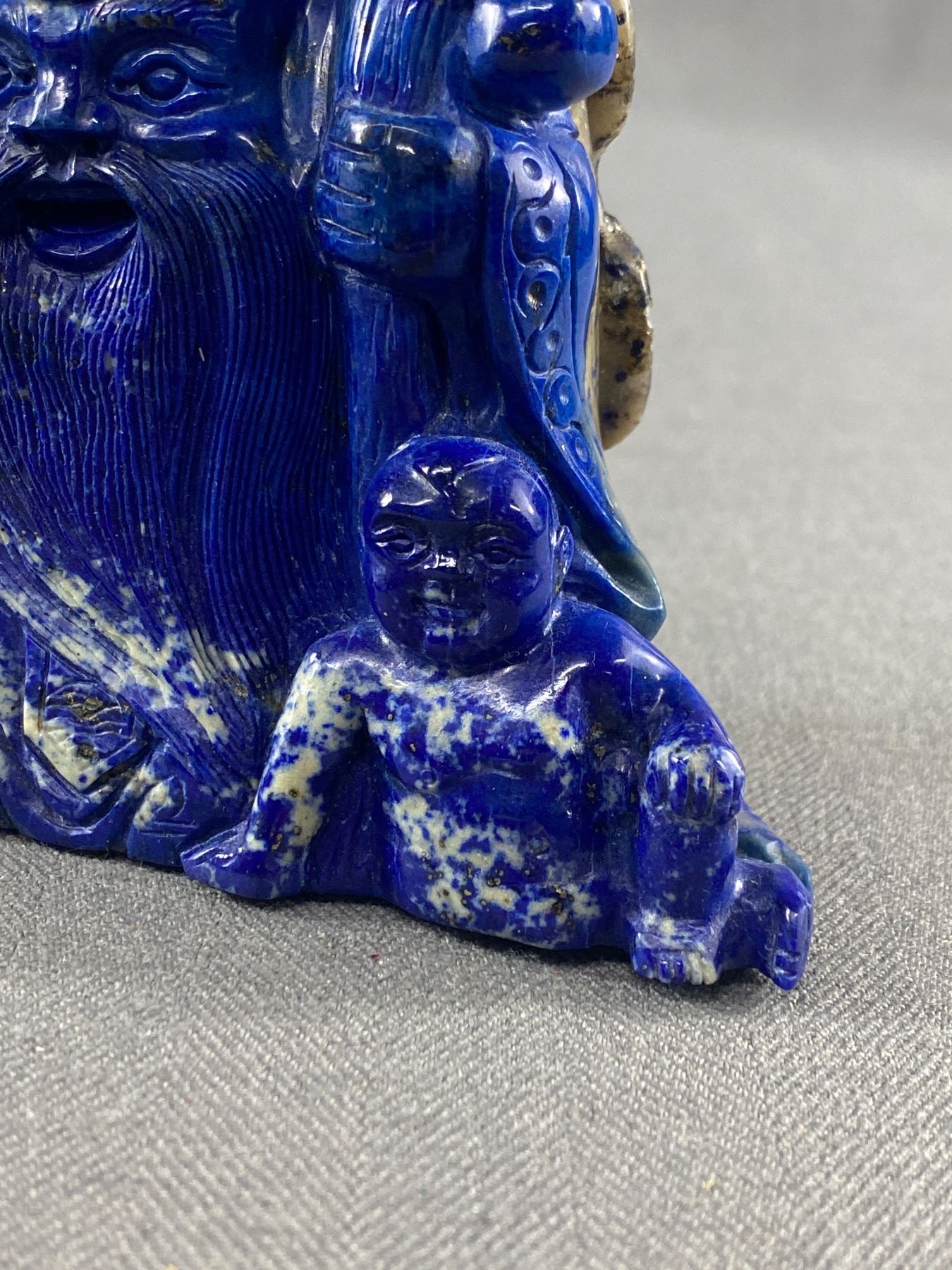 Vintage Intricately Carved Lapis Lazuli God Of Longevity Holding Foo Dog And Peach, & Laughing Buddha - 3.5" X 3.5" 394.5 Grams