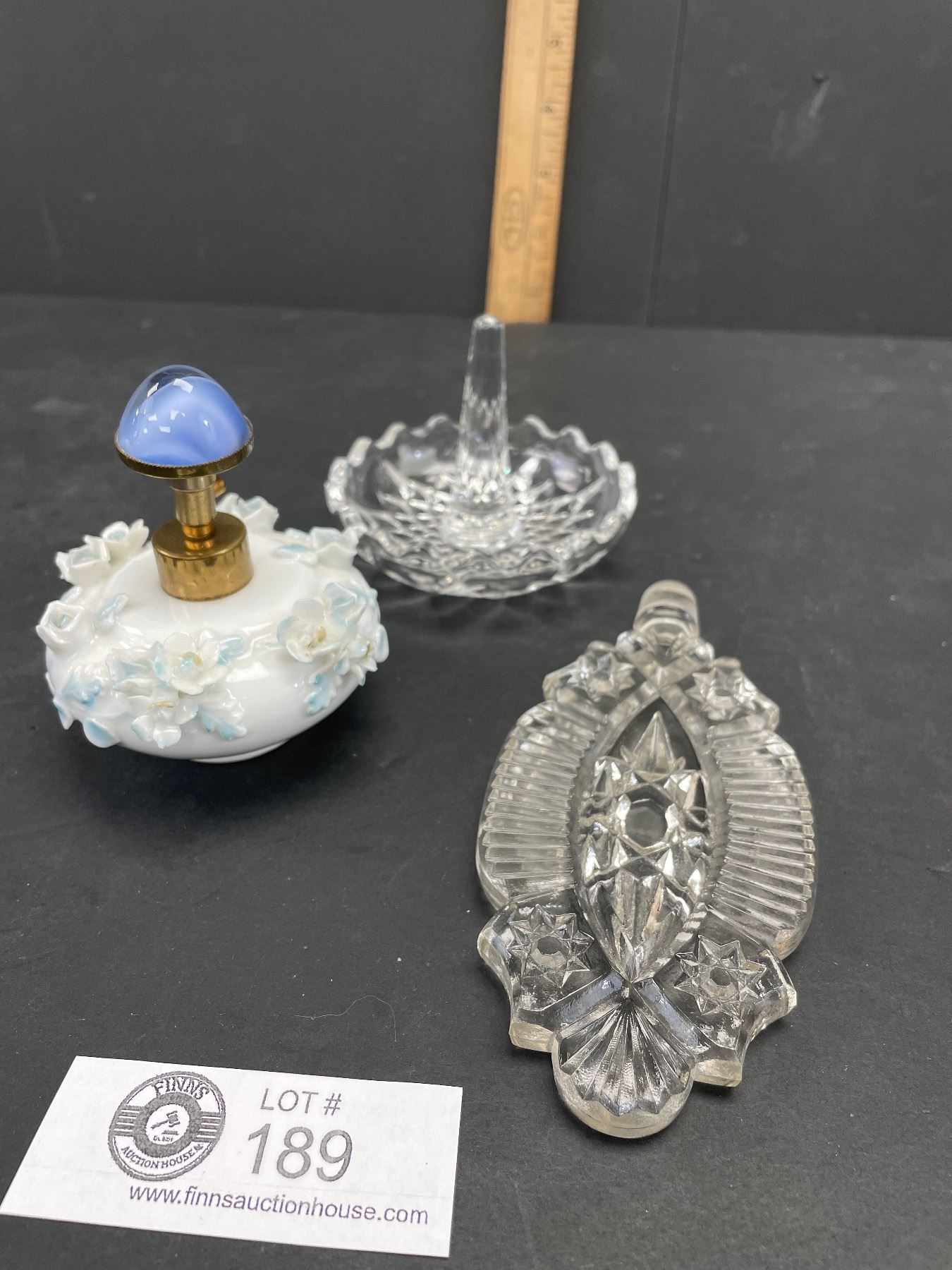 Vintage Irice Hand Painted Perfume Bottle, Crystal Ring Holder & Stopper