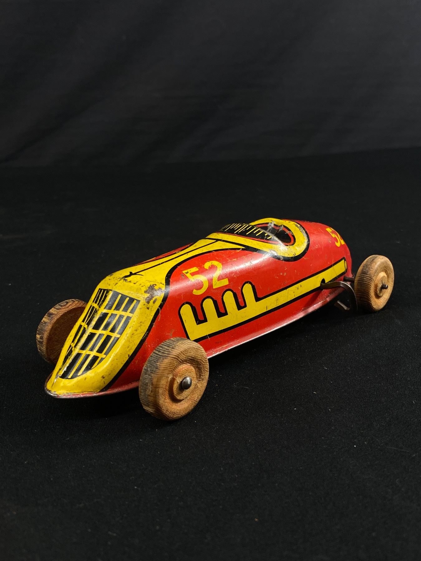 Vintage J. Chein & Co. Wind-Up Tin Race Car w/ Wood Wheels. Made In The USA
