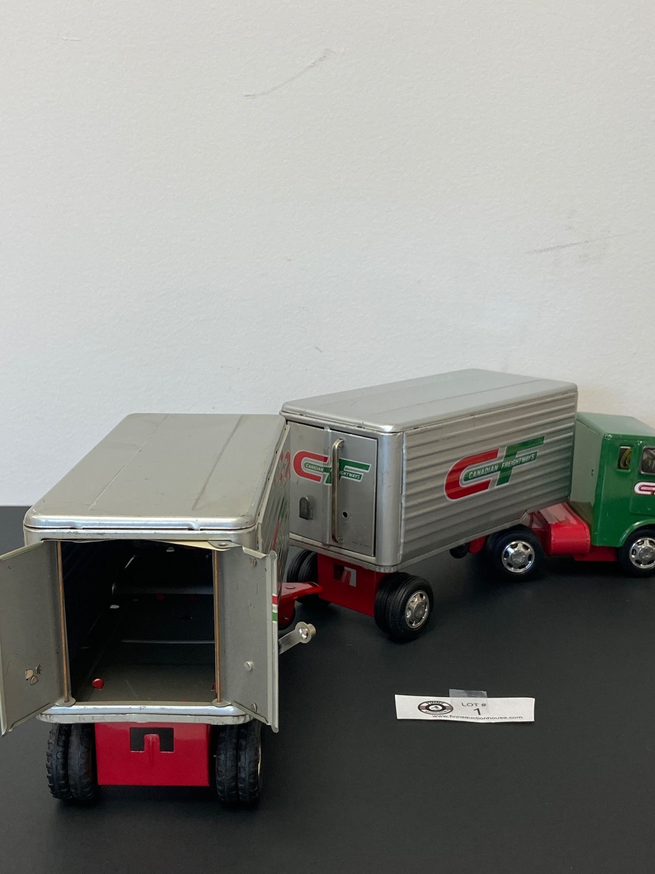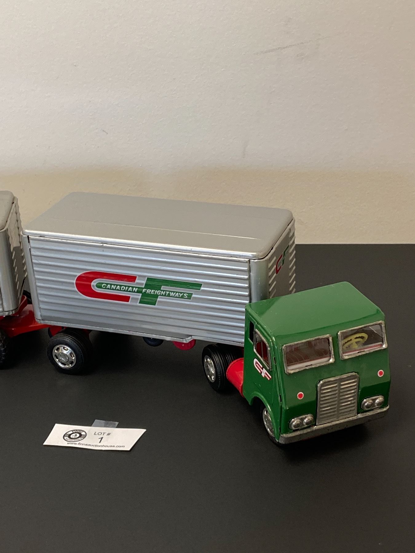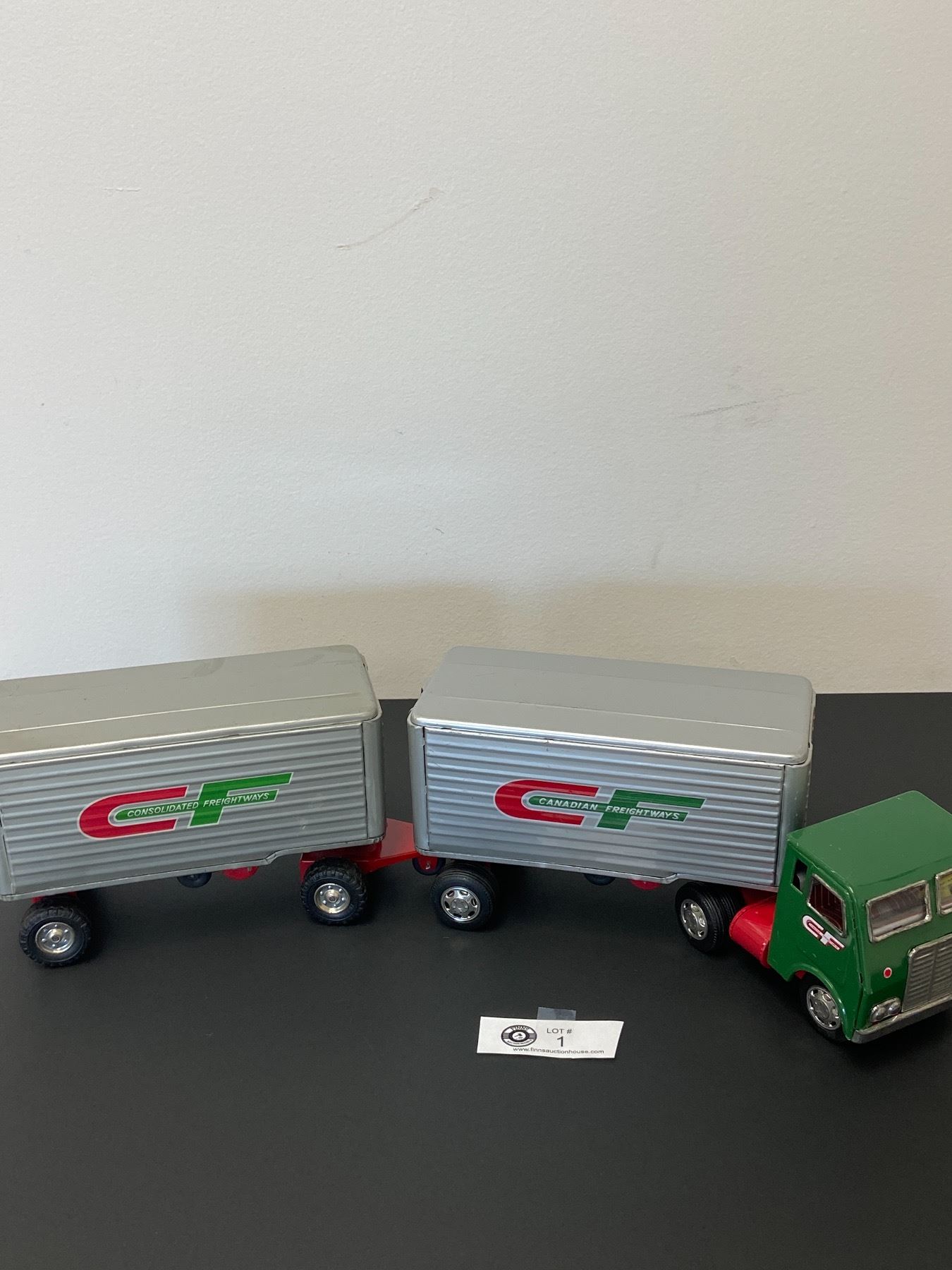 Vintage Japan Tin Friction Consolodated Frieghtways,Semi Truck with 2 Trailers Very Good Condition