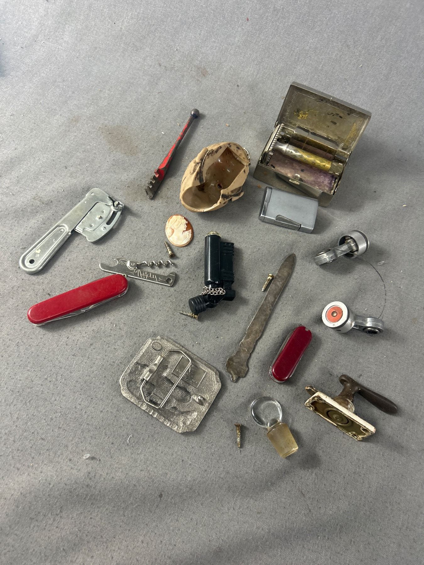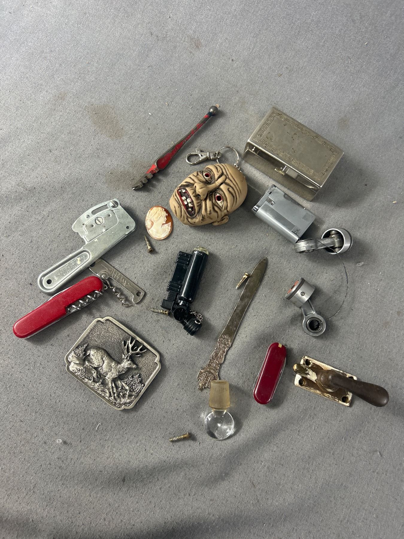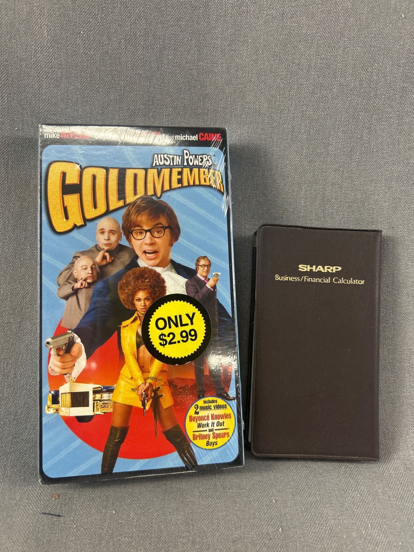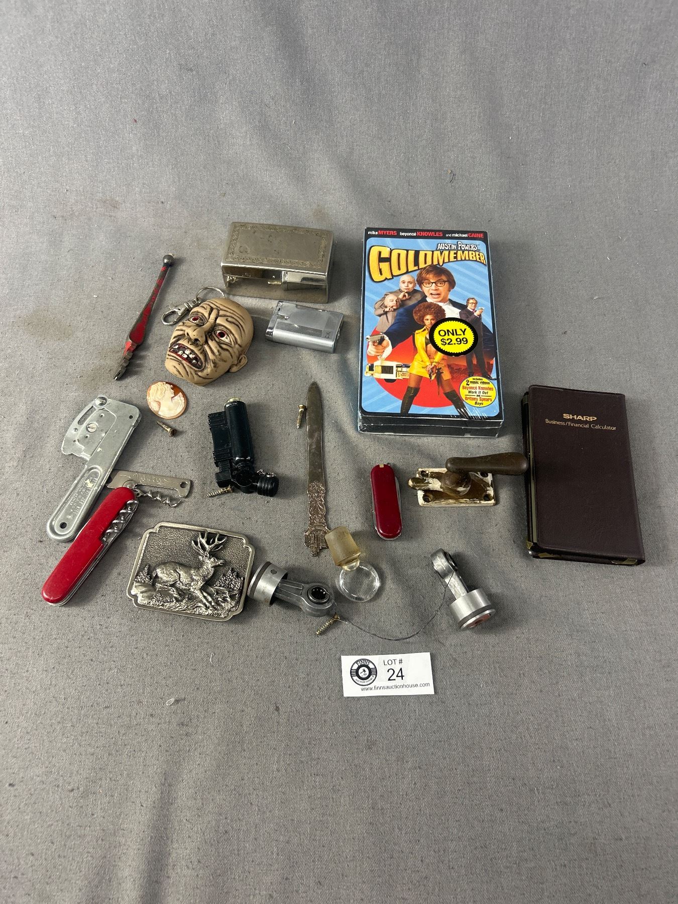 Vintage Junk Drawer Lot - Pocket Knifes, Belt Buckle, Shaving Kit & More Plus SEALED Austin Powers Goldmember" VHS Tape