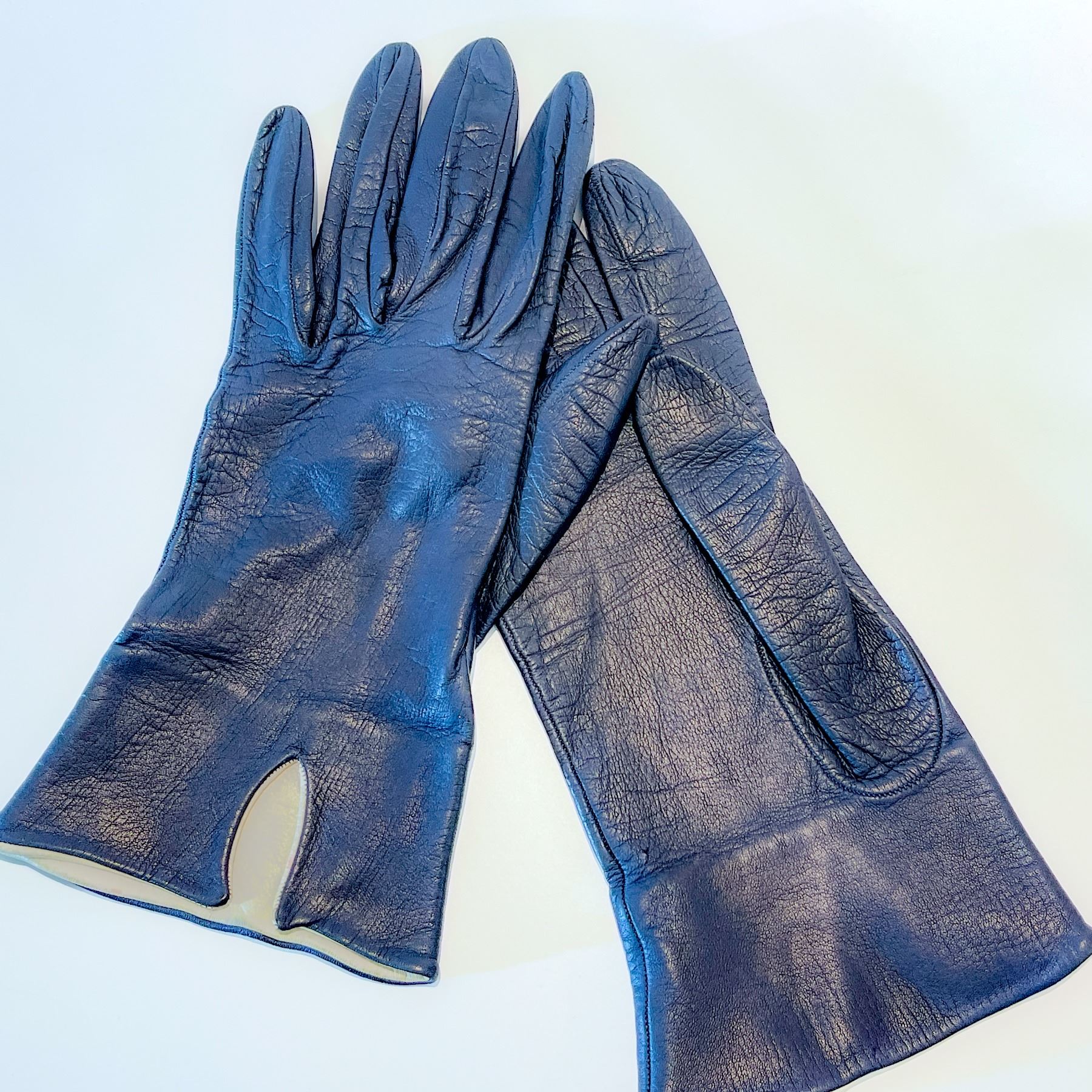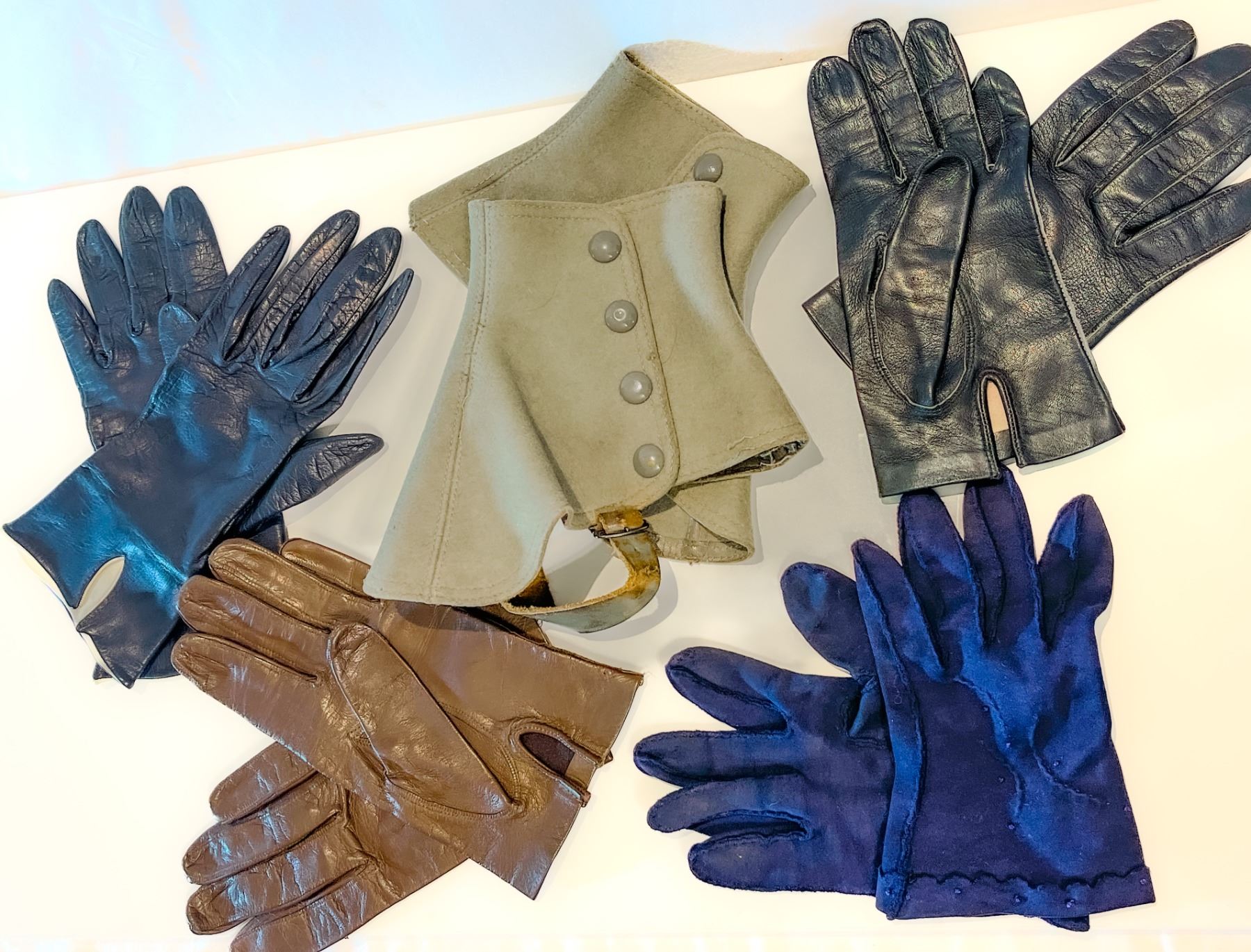 Collection of vintage accessories including fine kid leather gloves in navy, brown, and black, along with a pair of beige wool spats with button closures. Some gloves are marked “Czechoslovakia,” indicating quality European craftsmanship. All pieces show gentle age wear consistent with early to mid-20th century fashion.