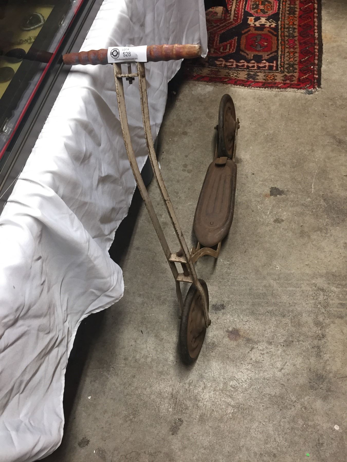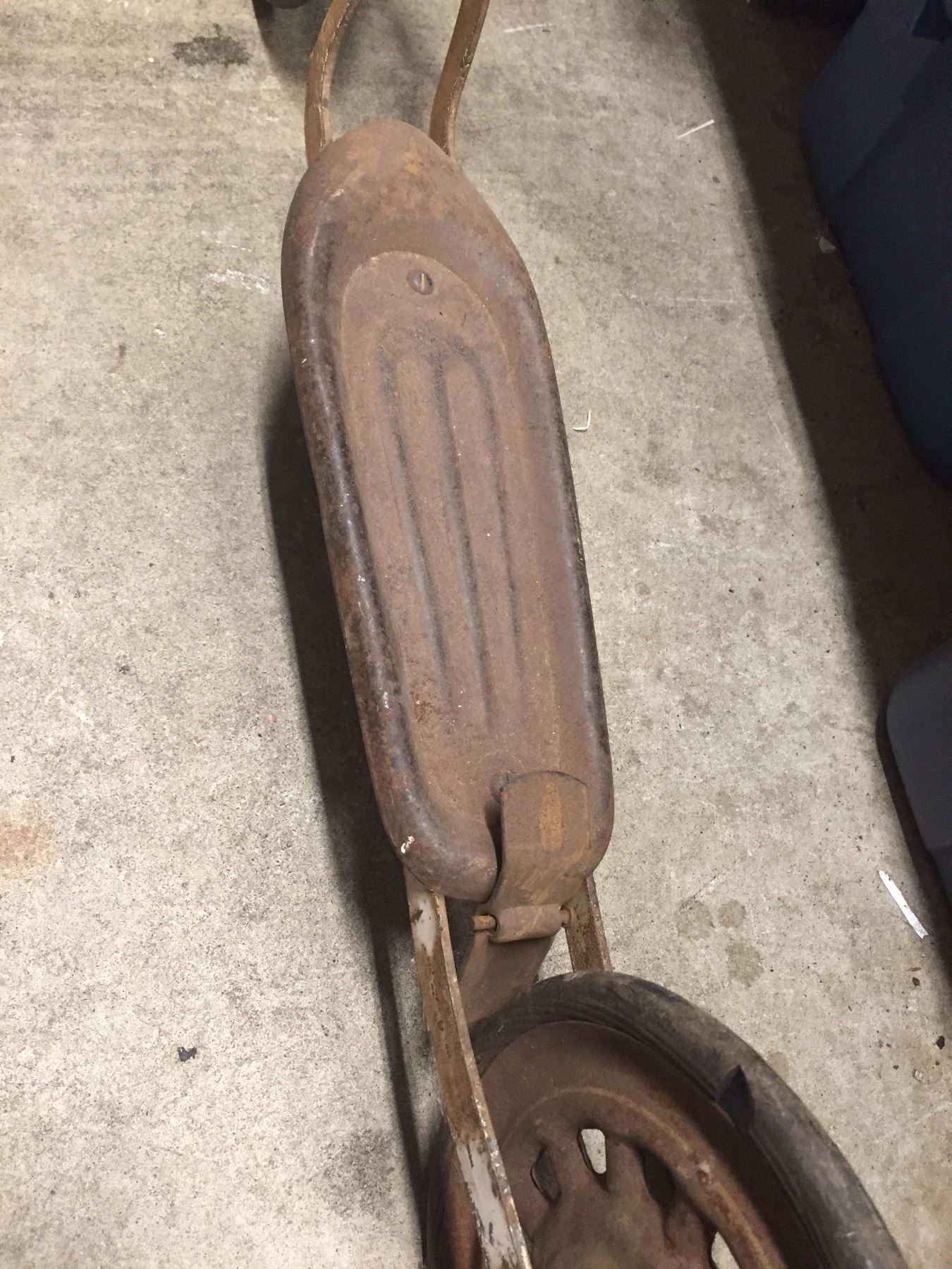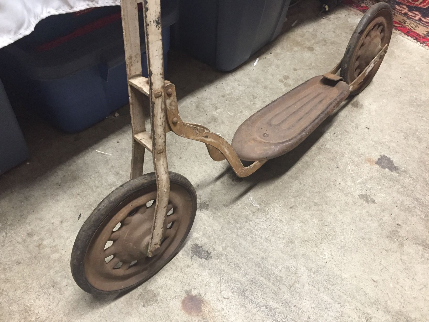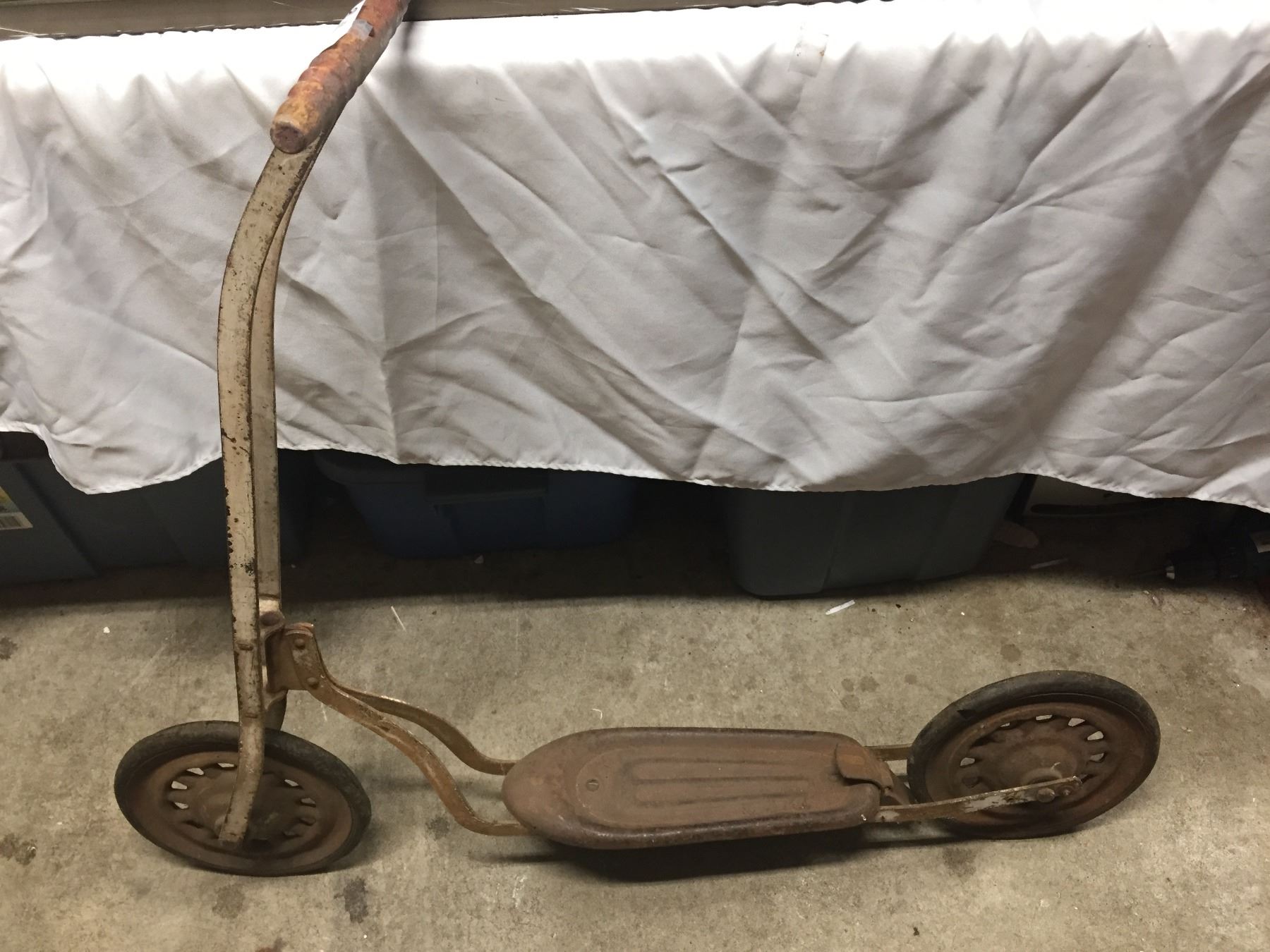 Vintage Kids Push/ Kick Scooter 1940s 33" Tall and it is approximately 40" Long. Has Wooden Handles. Rolls Nicely
