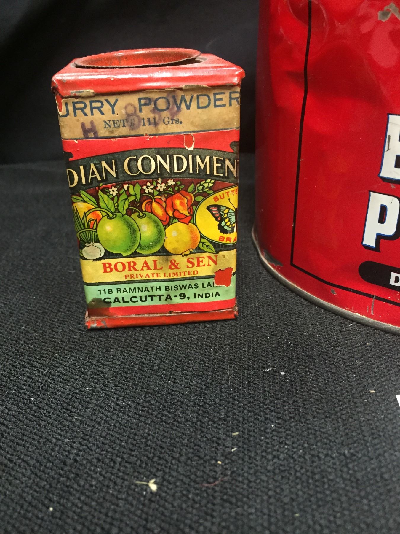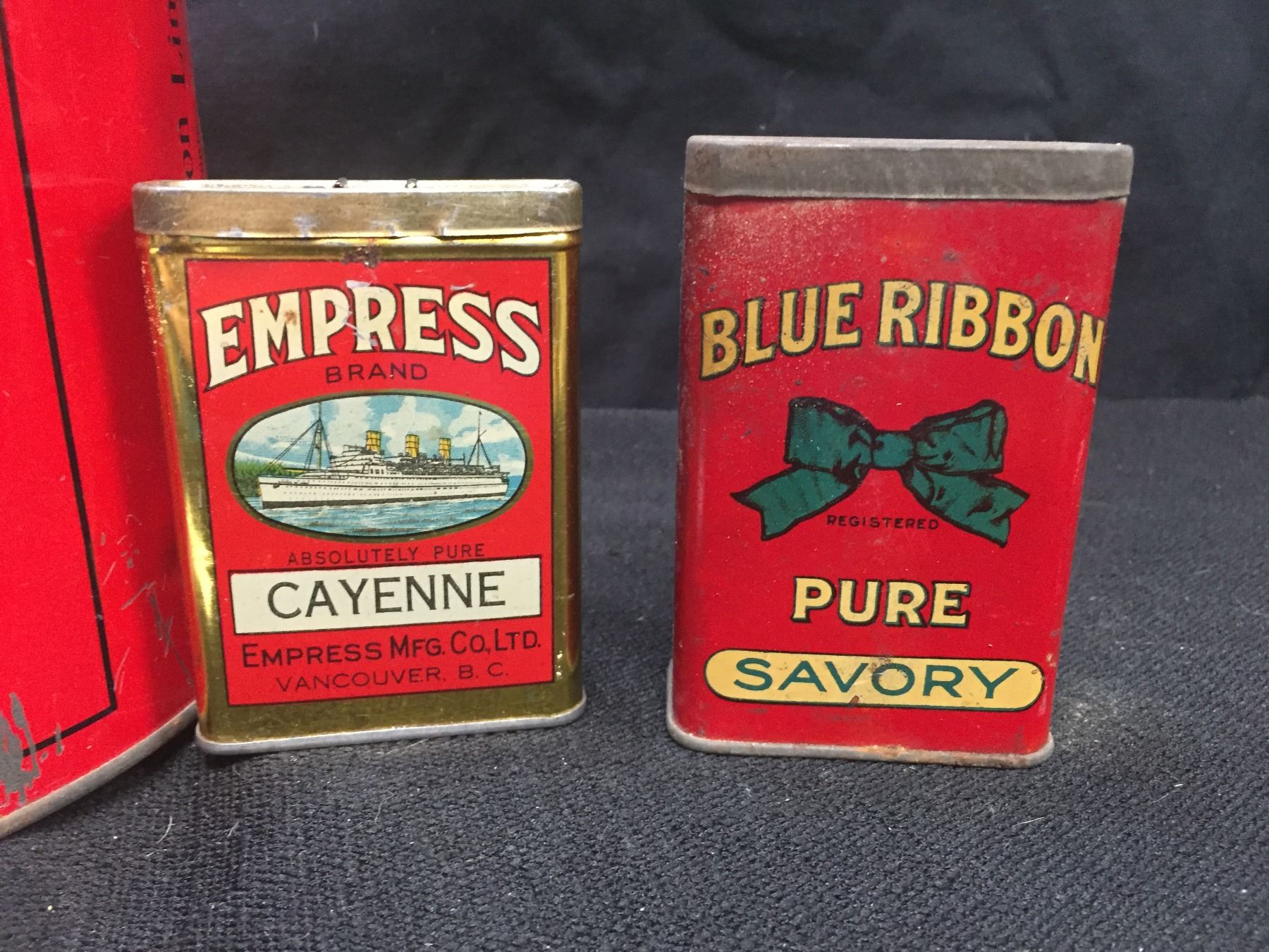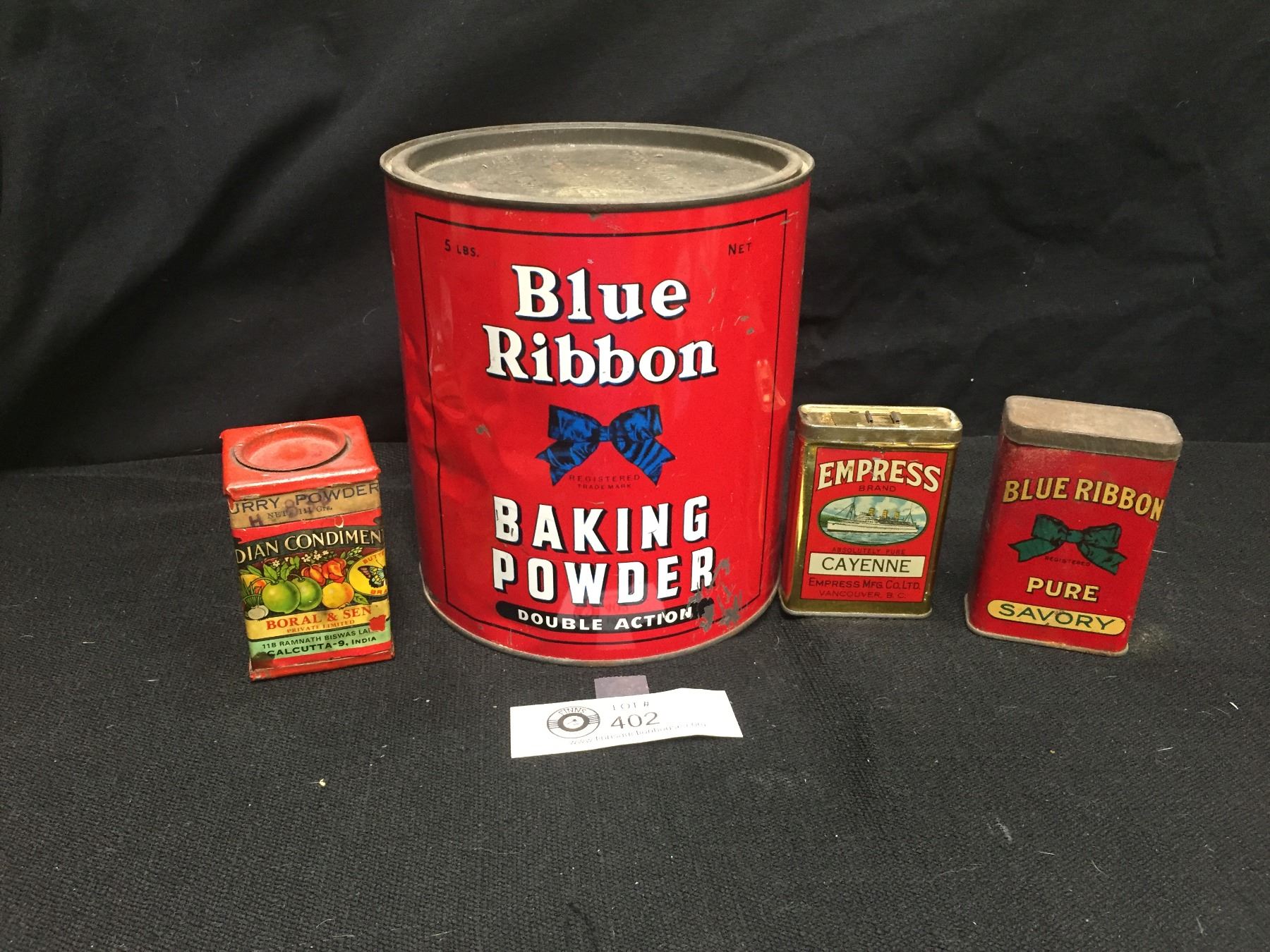 Vintage Kitchen Lot Blue Ribbon Baking Powder, Blue Ribbon Sobroso Spice Tin,Empress Tin Cayenne and an Indian Condiment Curry Powder Tin. Nice Lot.