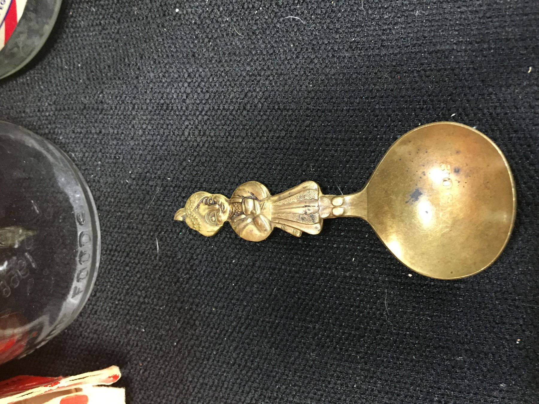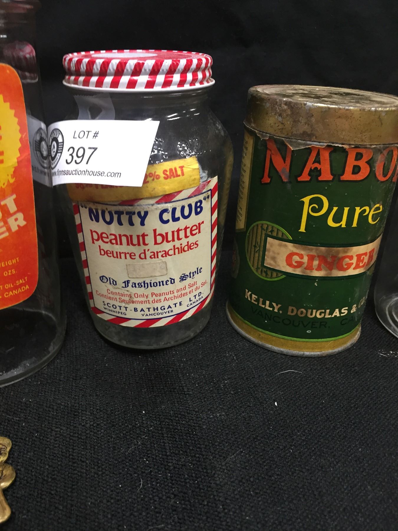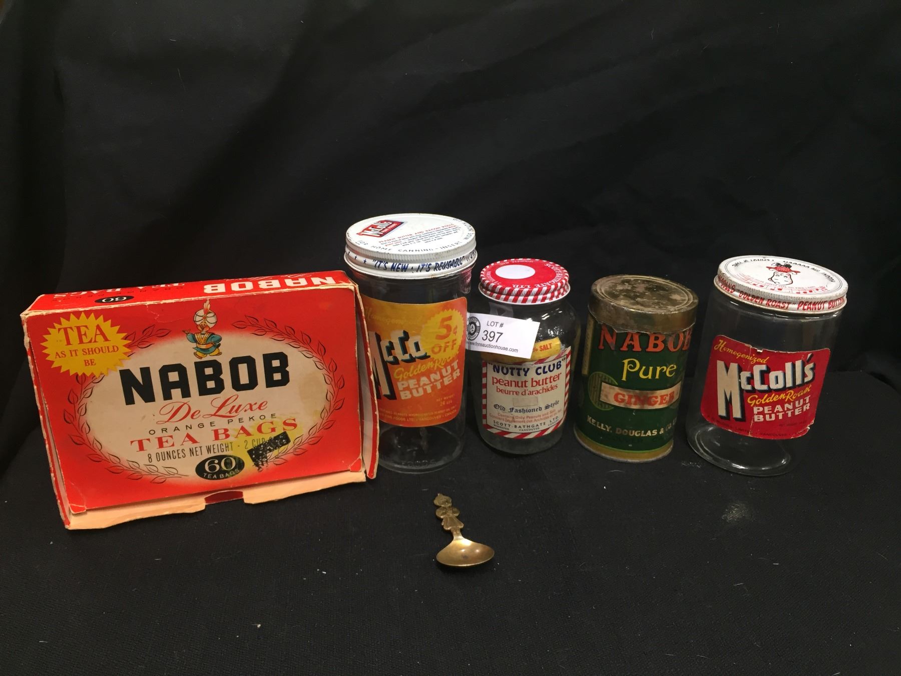 Vintage Kitchen Lot. Nabob Pure Ginger Tin an Old Maid, Nabob Tea Box, Nabob Spoon + 3 glass Peanut Butter Jars. All Nice Graphics