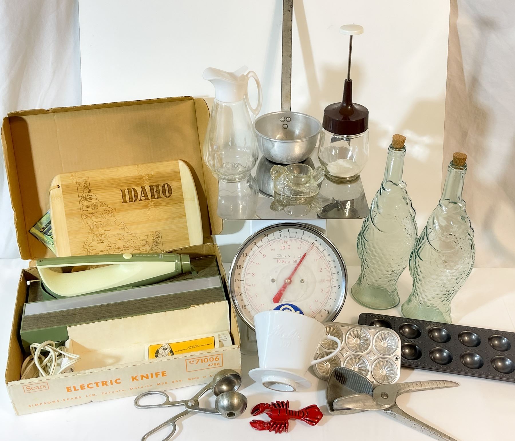 Vintage Kitchen Lot with Italian Fish Bottles, Sears Electric Knife in Box, and Metal Scale [x=#8211