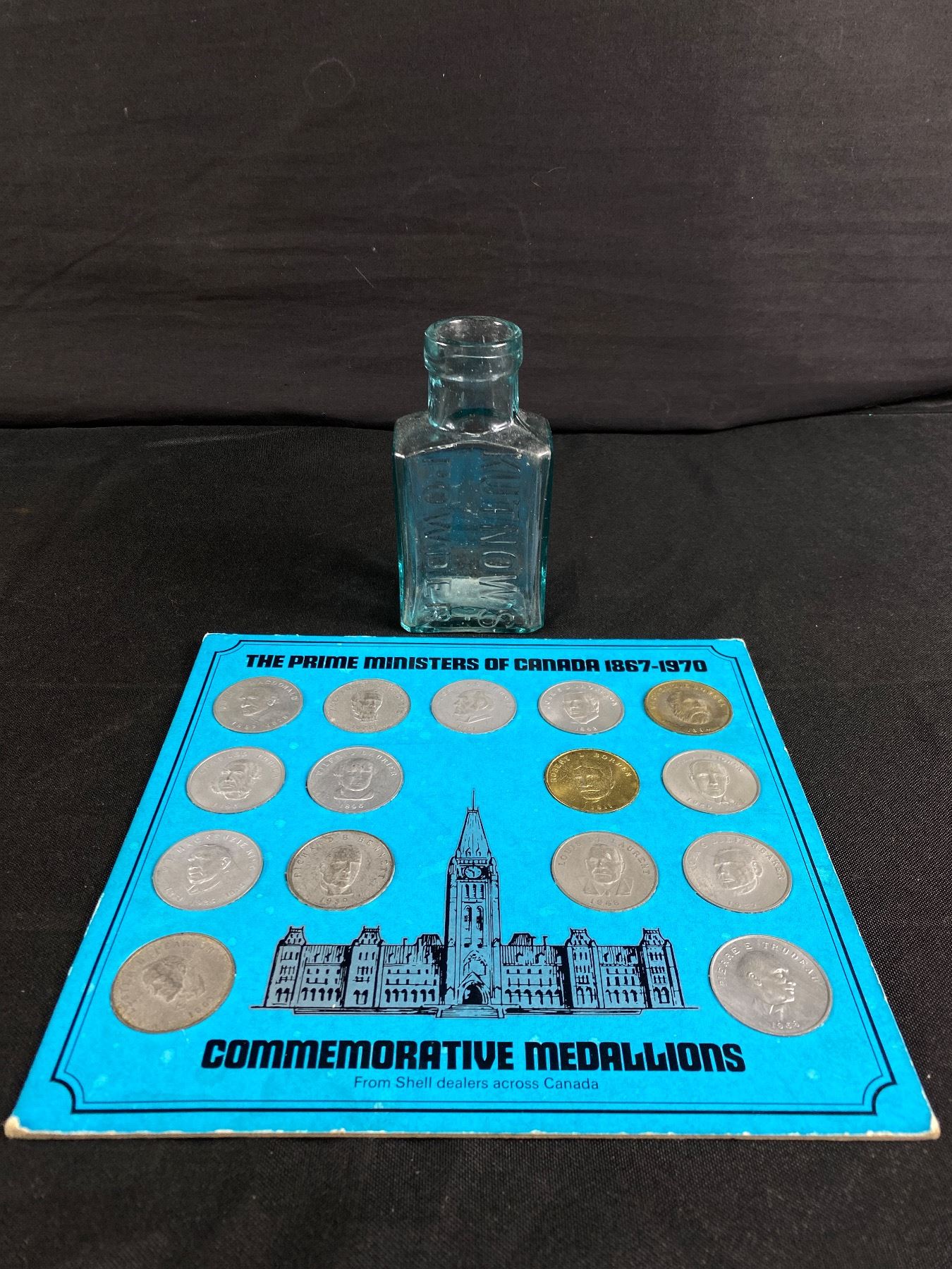 Vintage Kutnow's Powder Bottle & 1867-1970 Prime Ministers Of Canada Commemorative Medallions