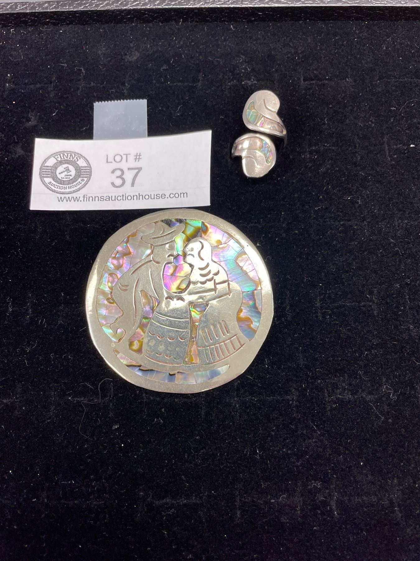 Vintage Large 925 Silver Pin with Abalone Inlay and Sterling Ring with Abalone Inlay