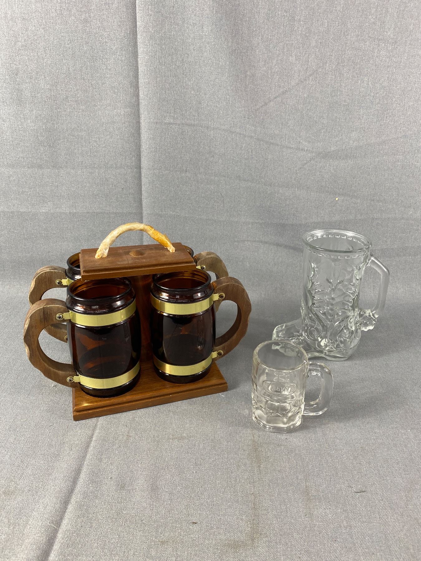 Vintage Libby Canada Glass Cowboy Boot. A&W Mini Mug, & Barrel Mugs w/Tray