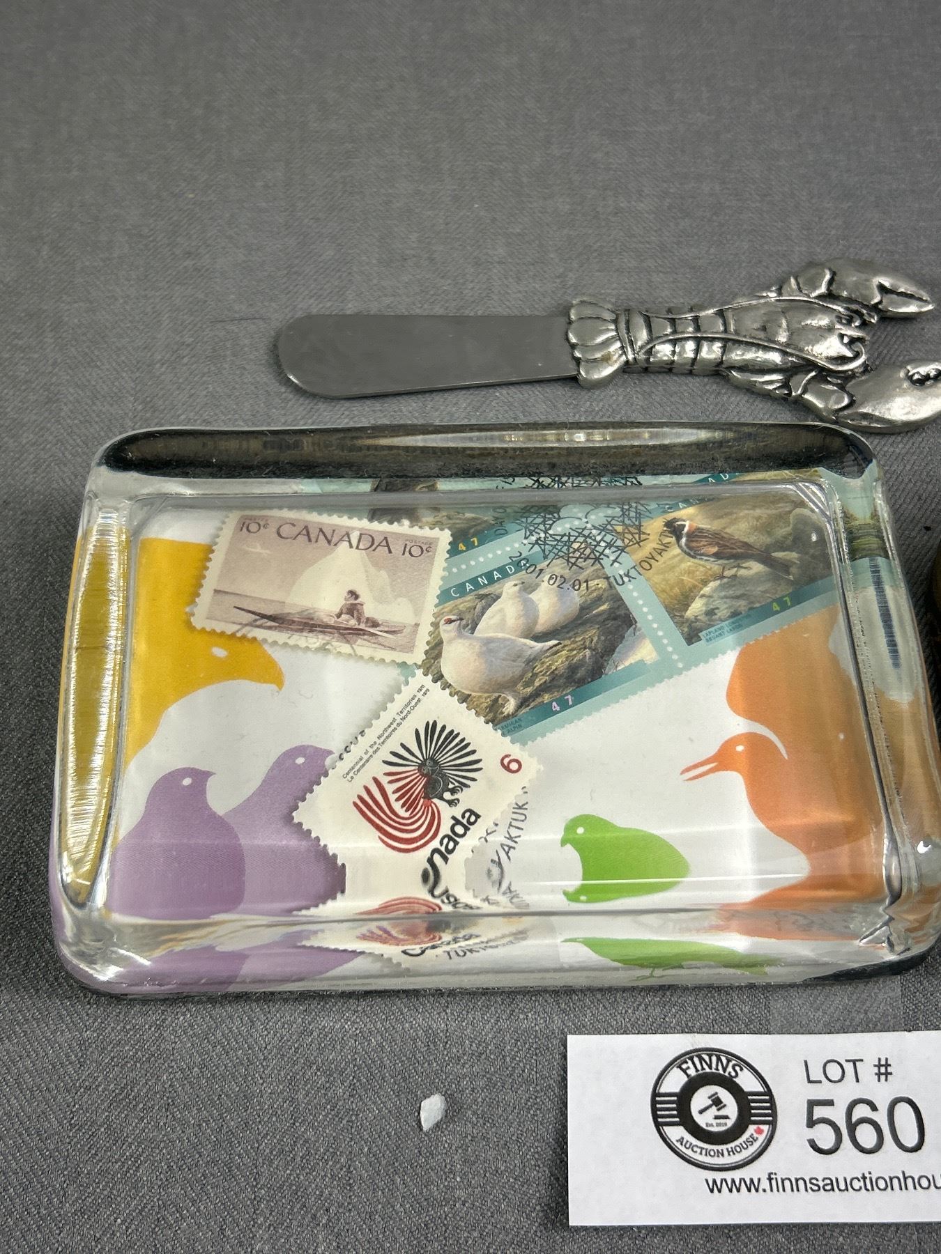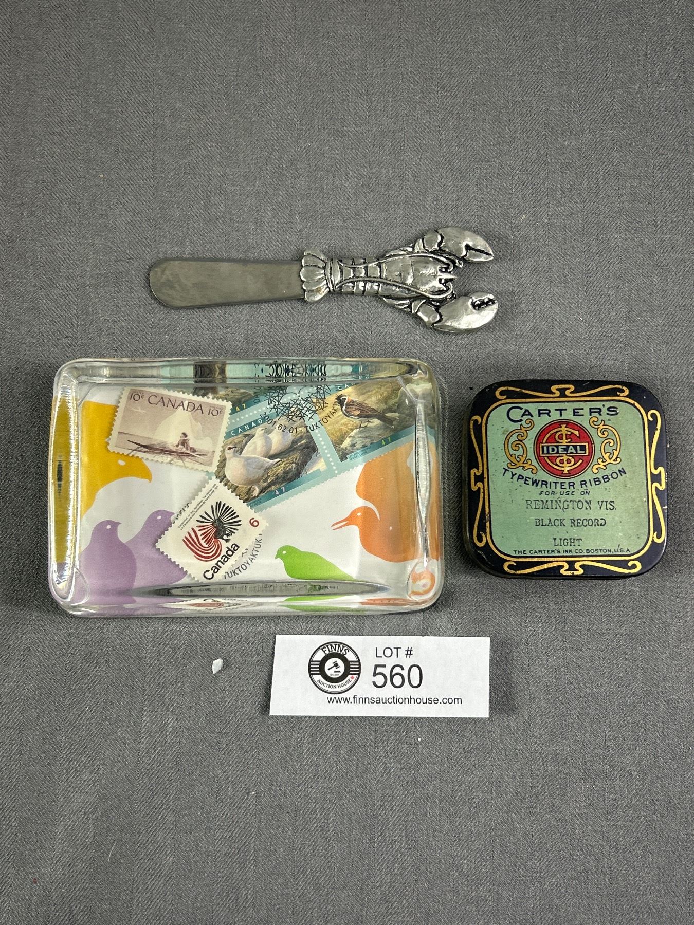 Vintage Lot - Carter's Ribbon 2.5" Tin, 5" x 3" Stamps Paperweight & 5" L "Lobster" Butter Knife