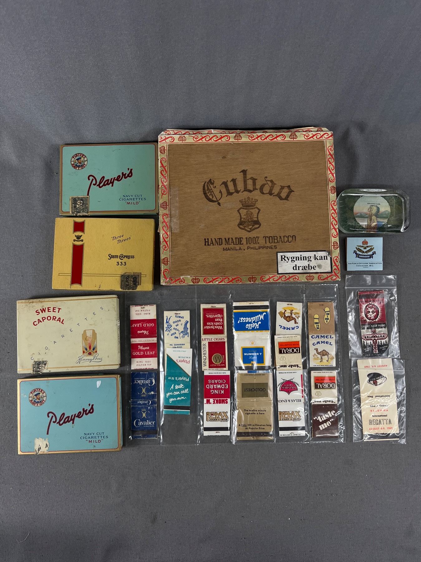Vintage Lot - Grants Pass Paper Weight, Assorted Match Books & Cigarette Tins In Wood Cigar Box