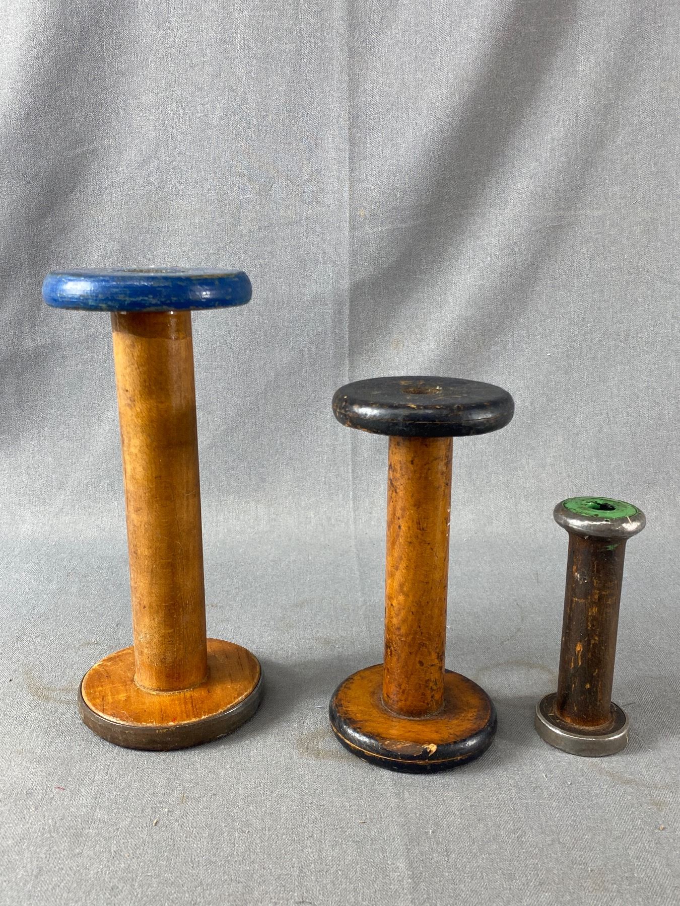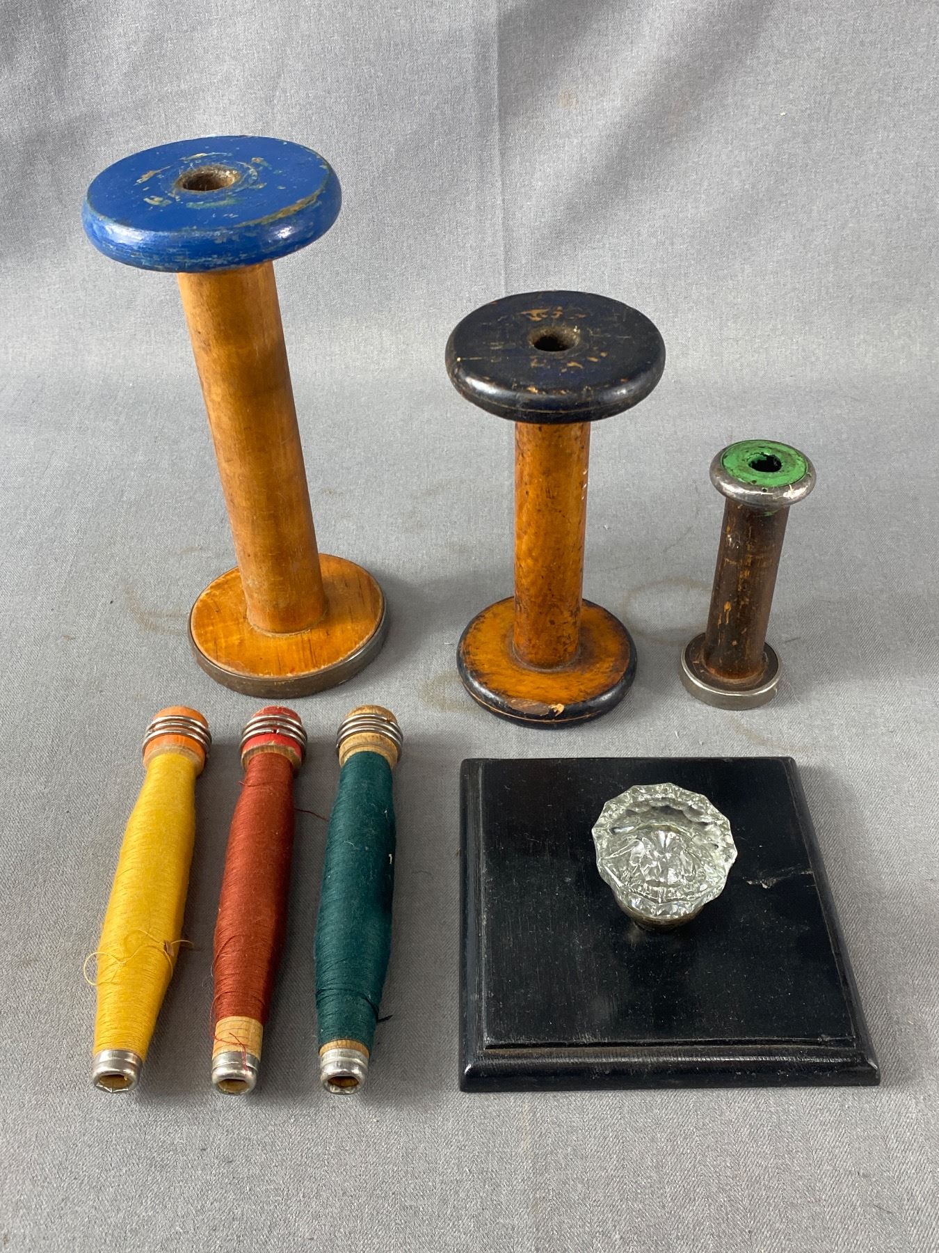 Vintage Lot Of Thread Bobbins/Spools. Approx. 5"-9" & Glass Door Knob On Wood