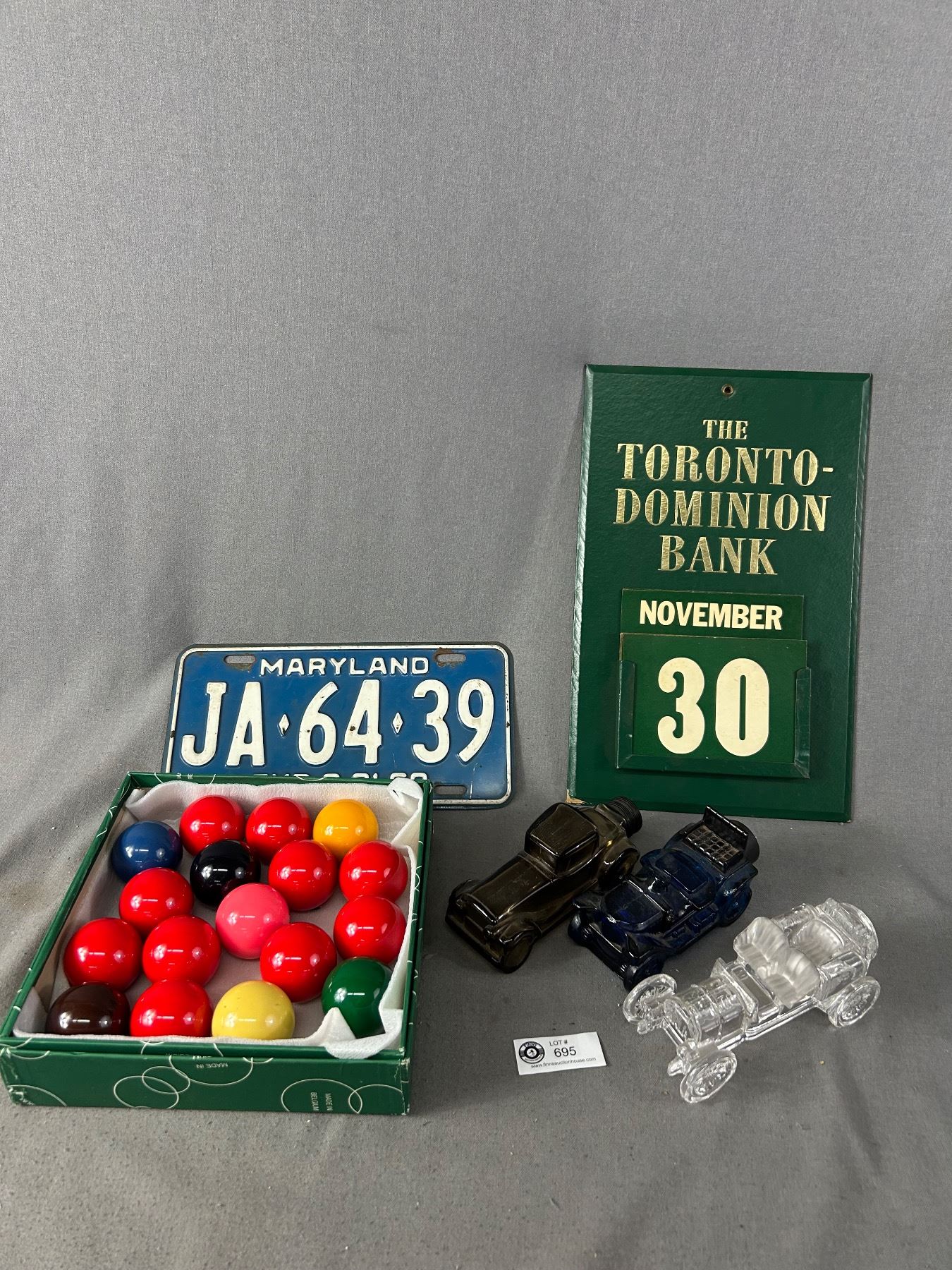 Vintage Lot - TD Bank Calendar, Maryland License Plate, Glass Cars & Snooker Balls Made In Belgium