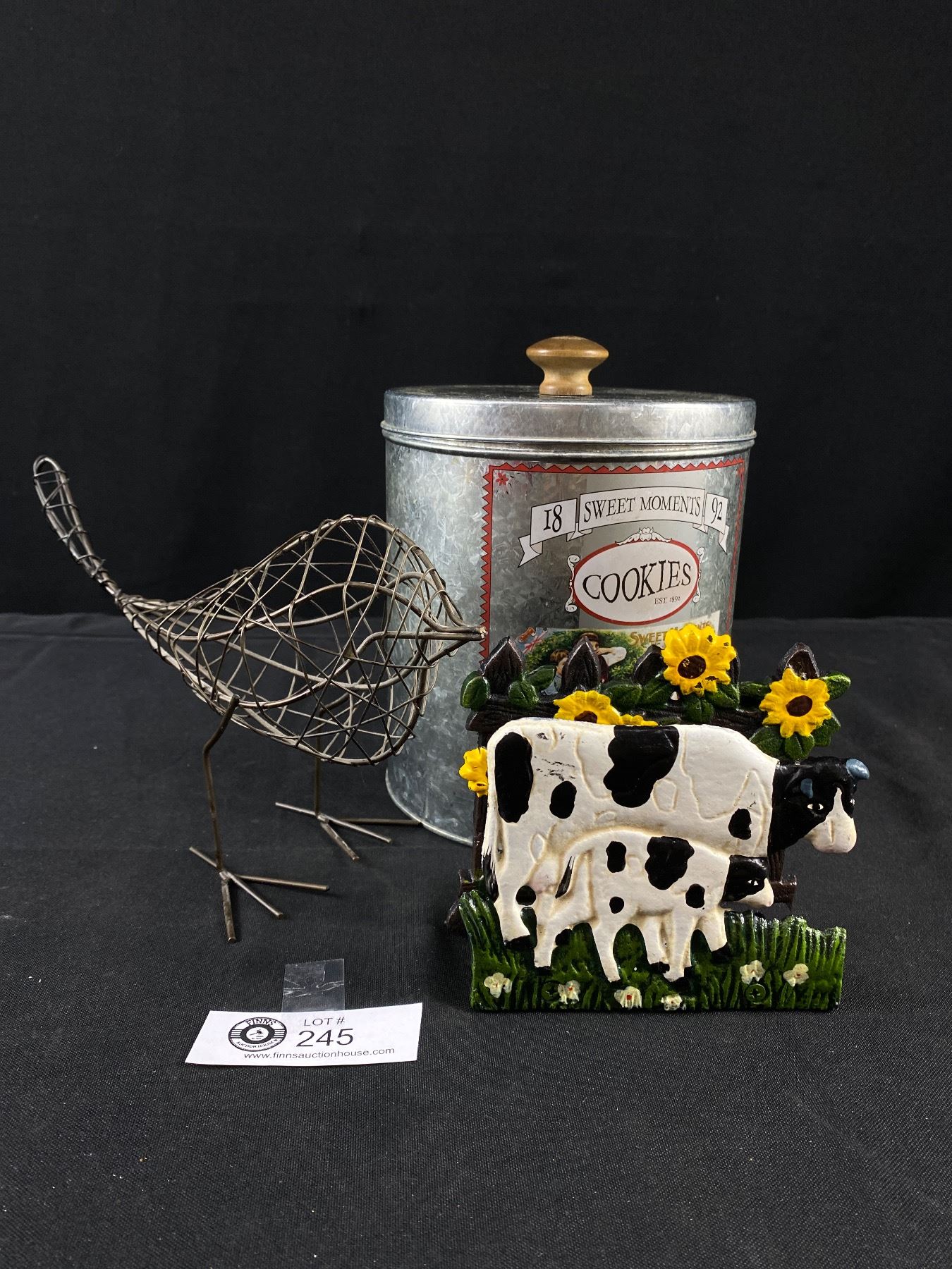 Vintage Lot - Tin Cookie Jar, Wire Bird & Heavy Napkin Holder