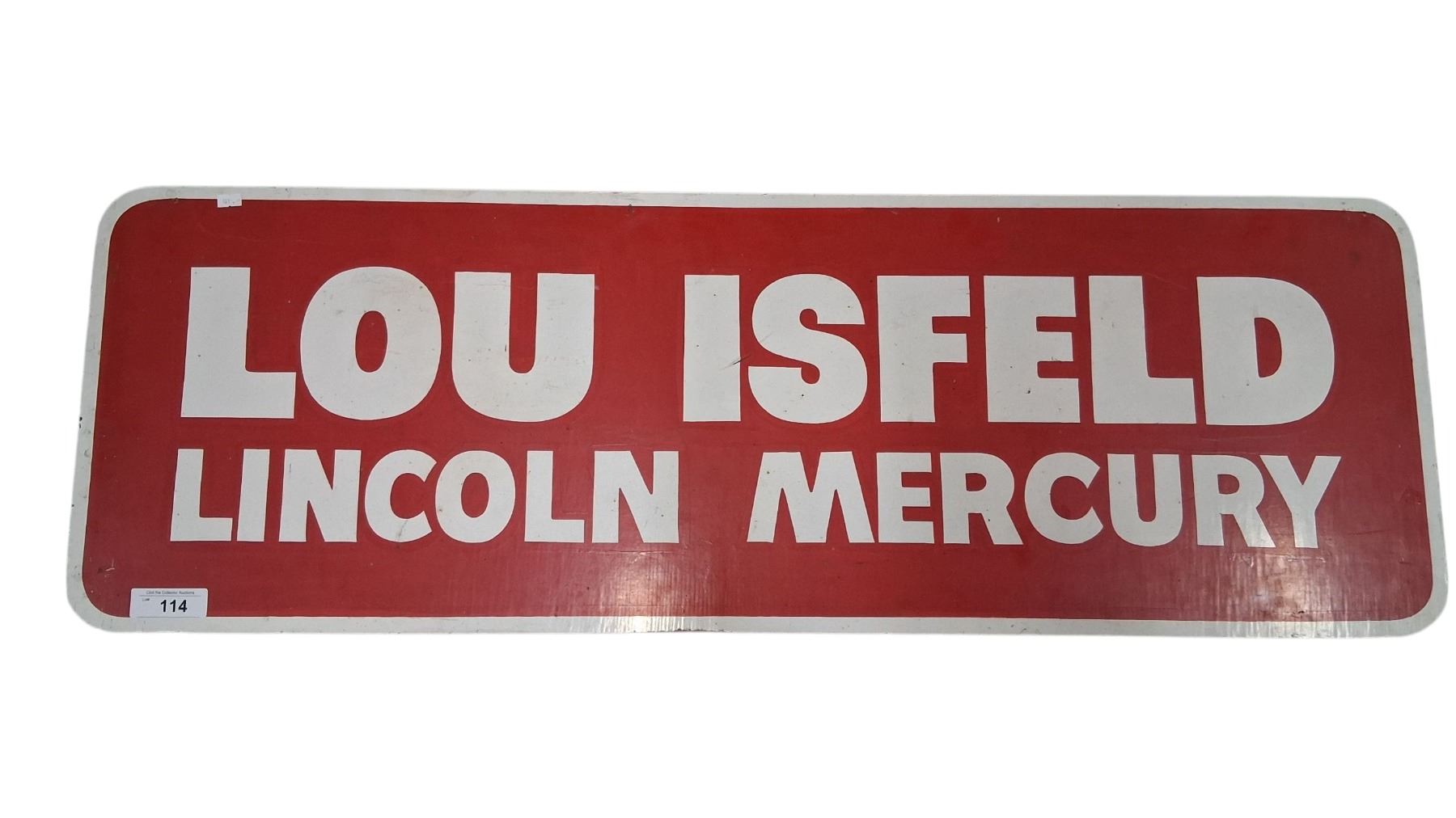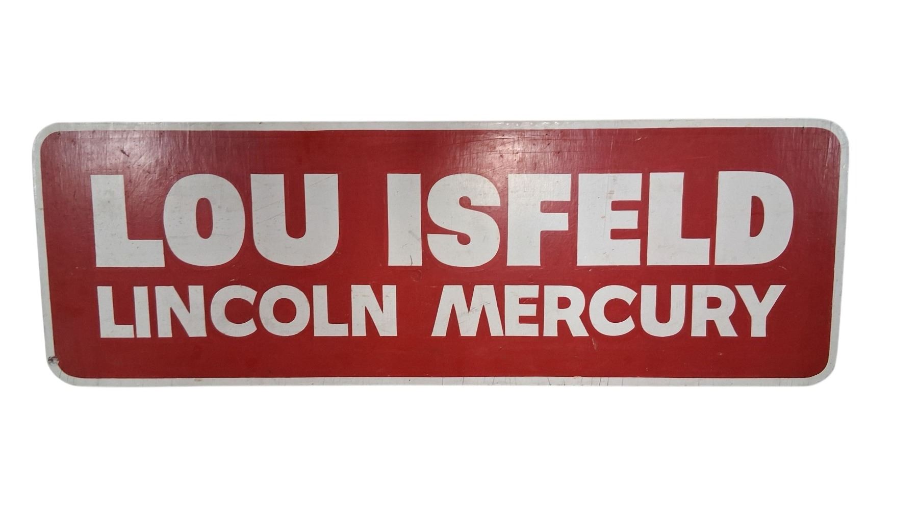 Vintage Lou Isfeld Lincoln Mercury double sided wooden sign with hanging hook eyes 44"x16"