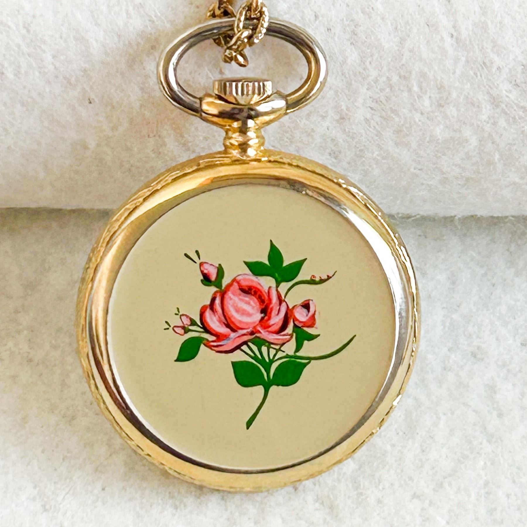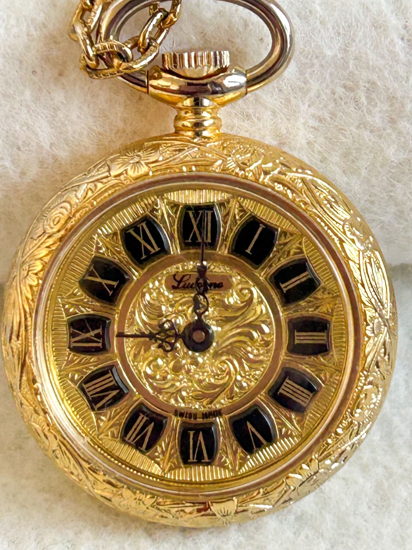 Elegant gold-tone Lucerne Swiss Made pocket watch on chain, featuring ornate engraved detail and a hand-painted enamel floral back. Watch is currently working; beautiful vintage statement piece worn as a necklace.