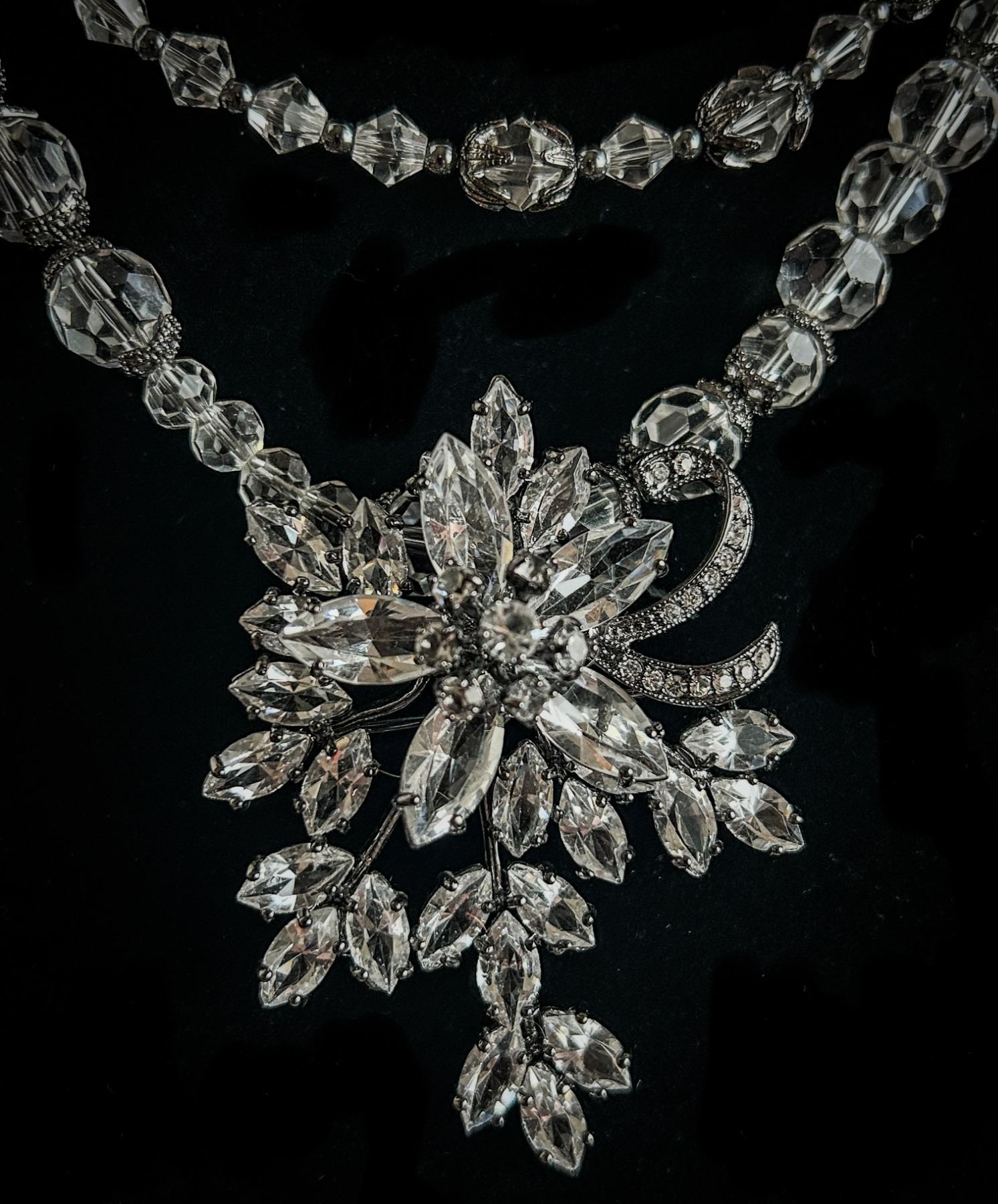 Exquisite signed Margaret Rowe set featuring a sparkling rhinestone brooch that can be worn as a pin or attached as a pendant on the double-strand faceted crystal necklace. Elegant, high-quality vintage costume jewelry, very collectible.
