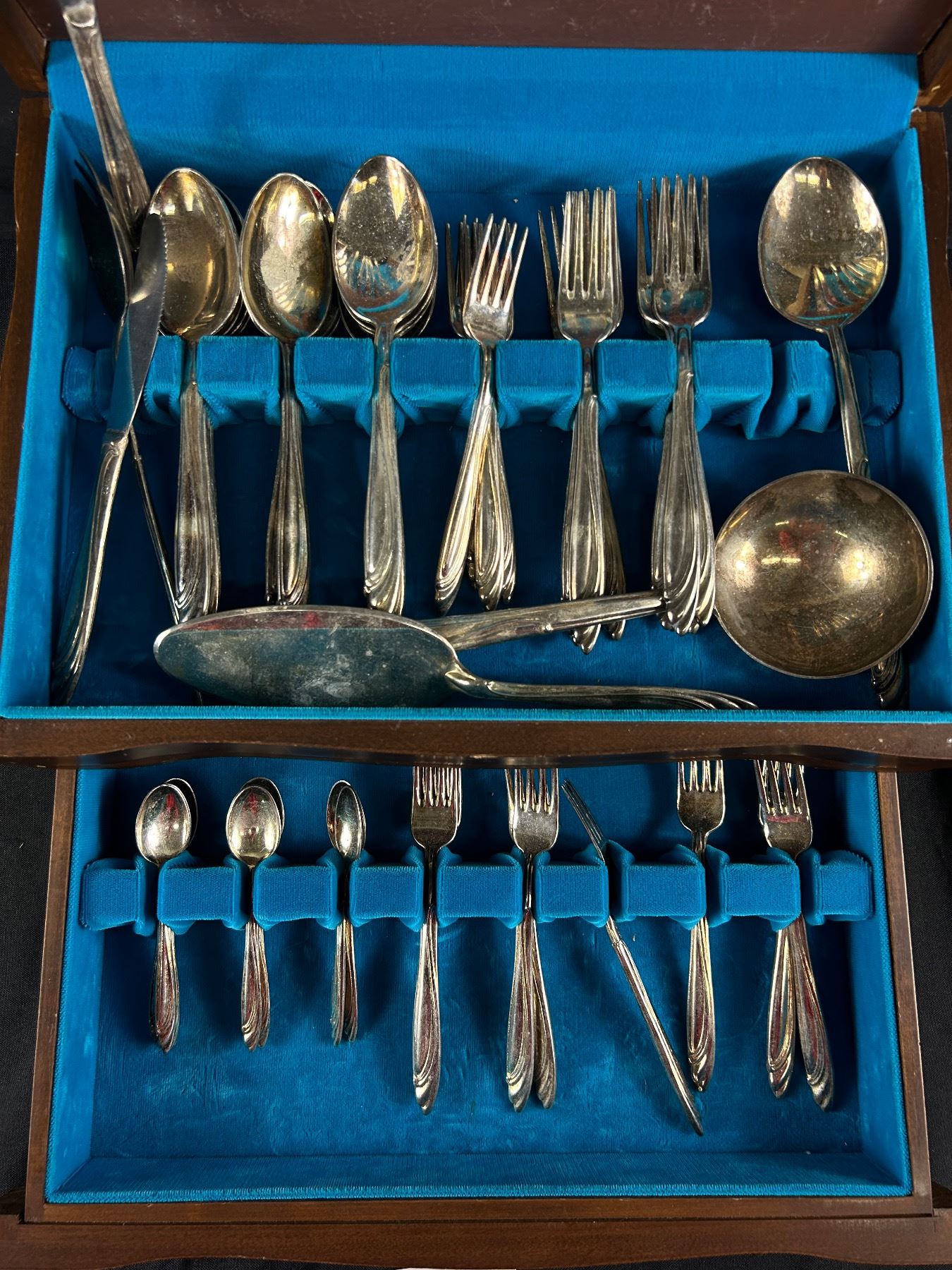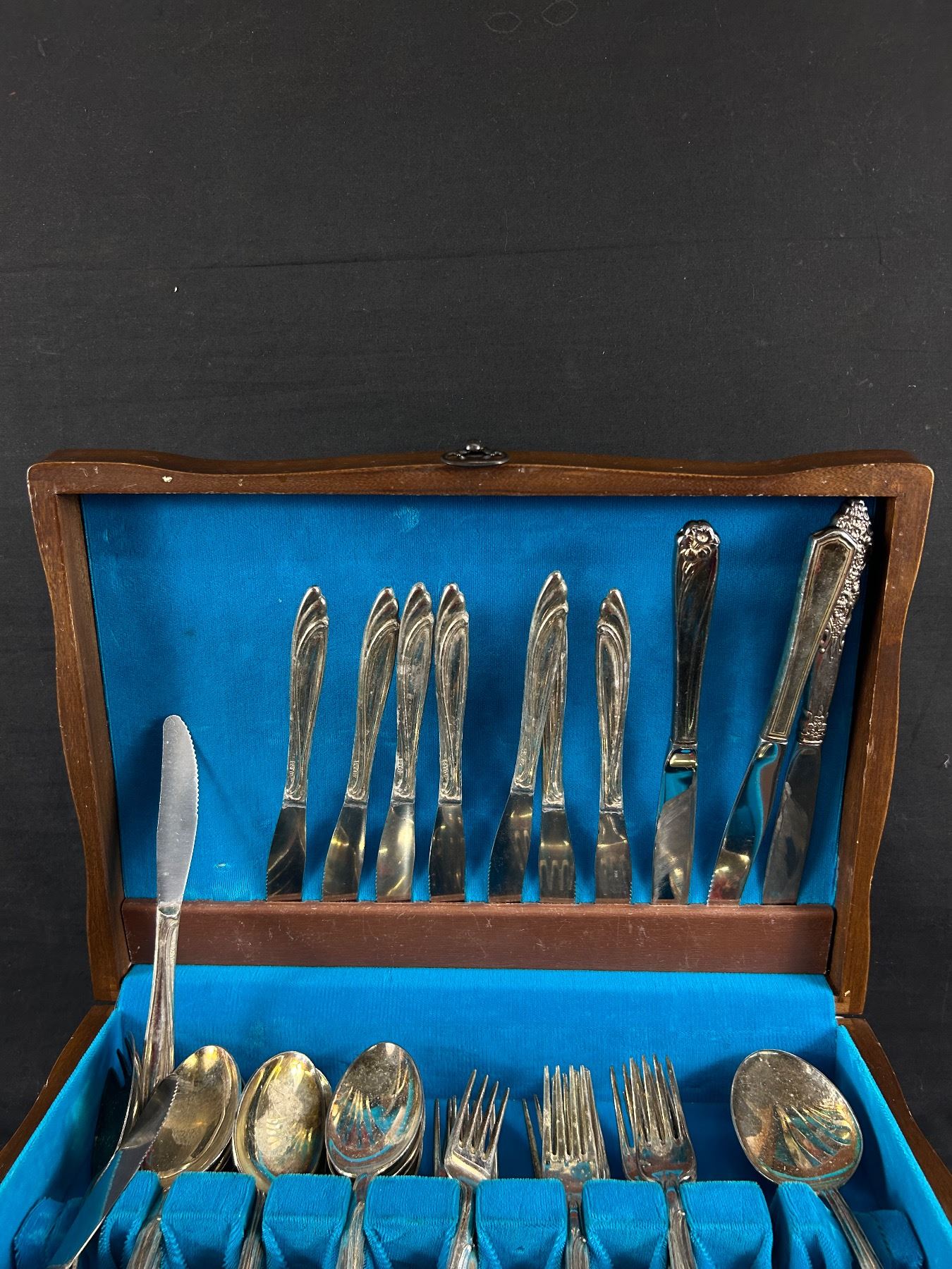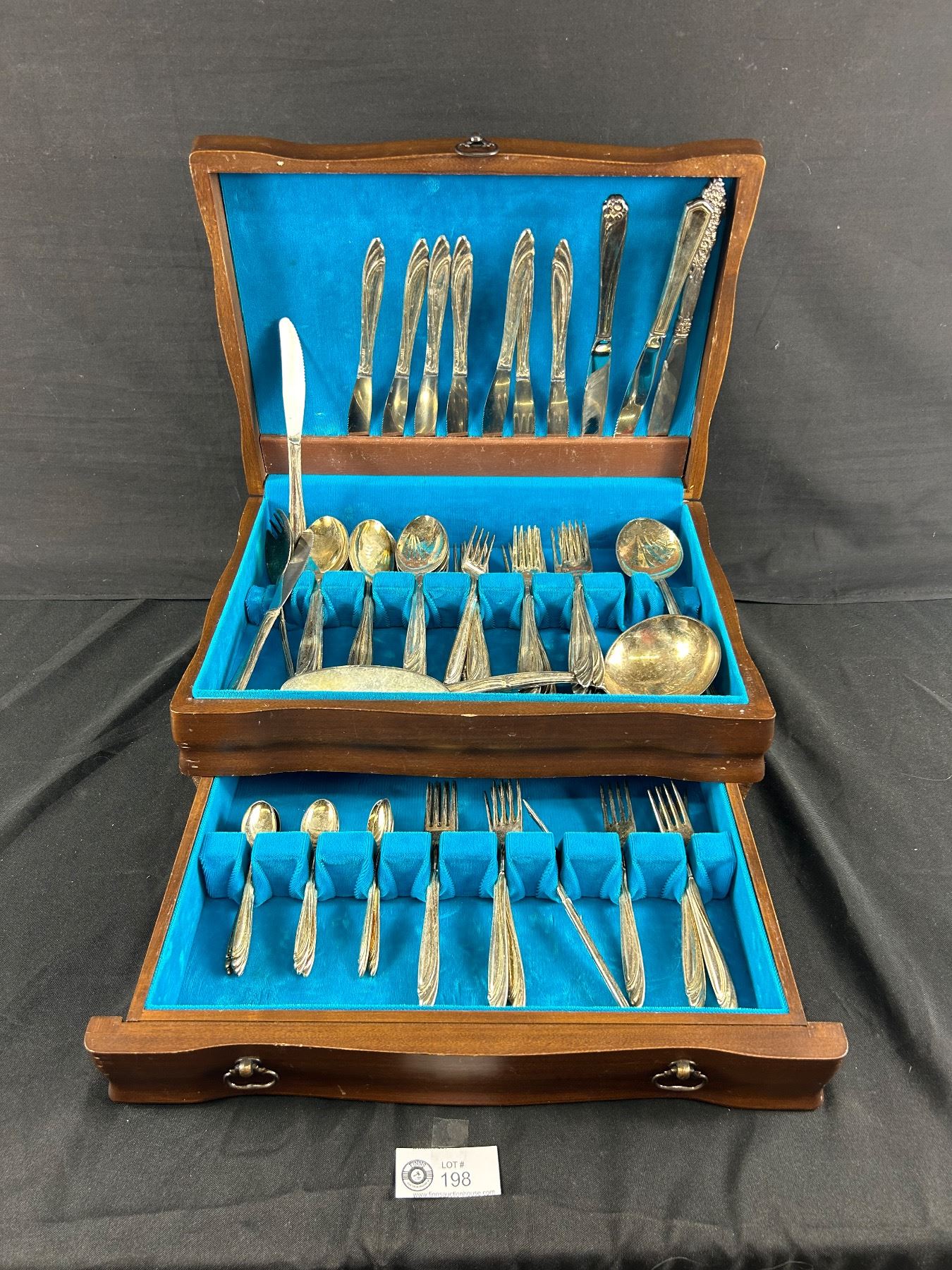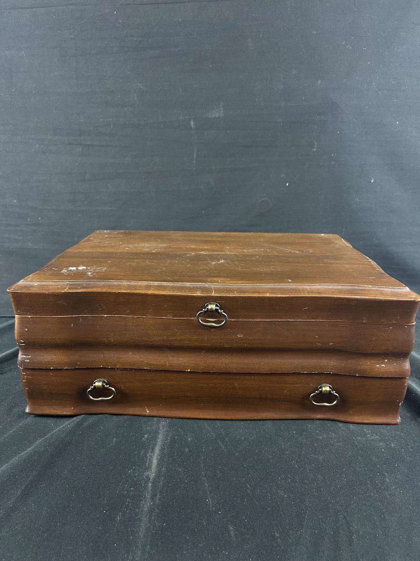 Vintage Marked ARG 800 Flatware In Velvet Linded Box w/ Hinged Lid & Drawer. Approx. 16" x 11" x 6.5"