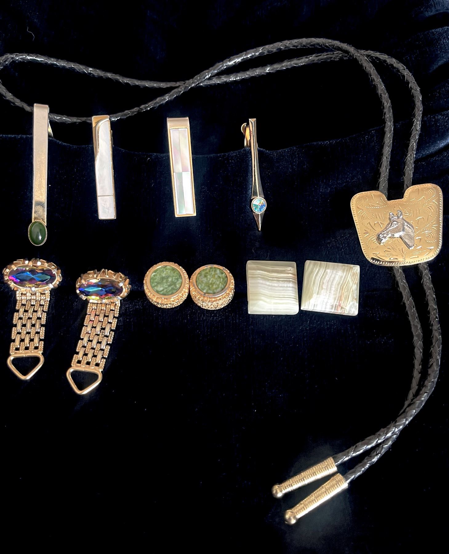 Mixed lot of 60s–80s men’s jewelry. Includes 4 tie bars, 3 cufflink pairs, and a Western bolo tie