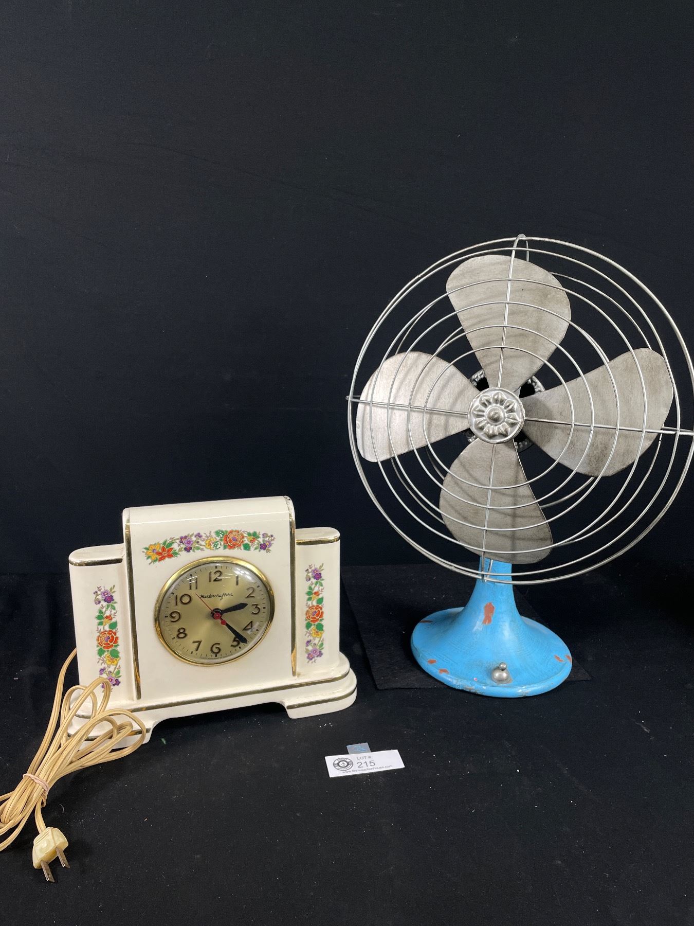 Vintage Metal Children's Toy Fan and 1950's Mastercrafters Porcelain Mantle Electric Clock