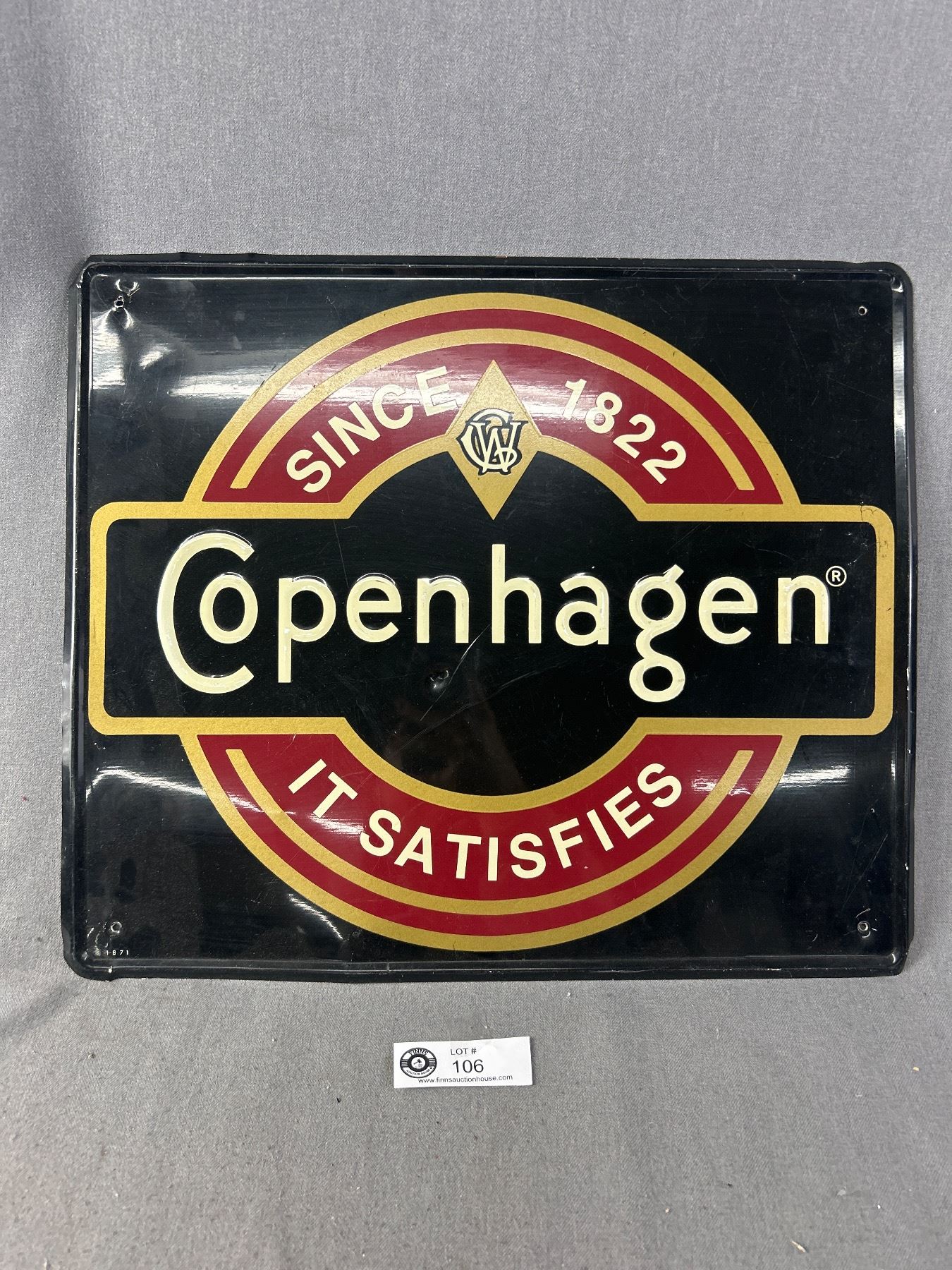 Vintage Metal Copenhagen "It Satisfies" Sign. Approx. 17" x 14"