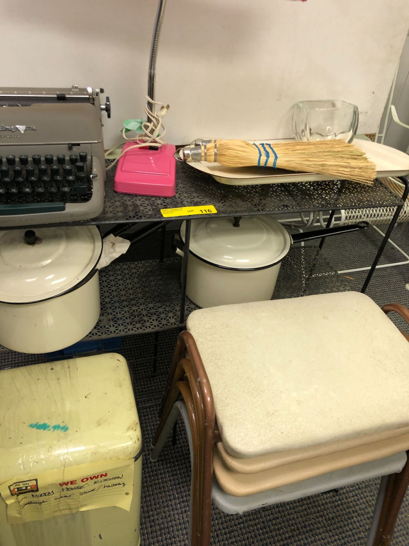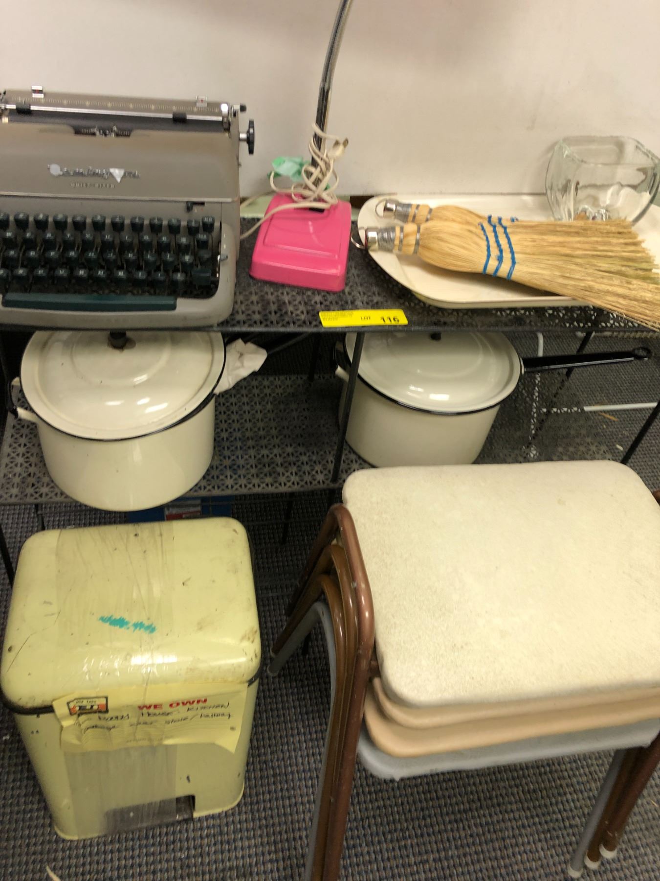 Vintage Metal Shelf with Reminton typewriter, lamp, crock pots, stools and Antique Garbage Bin
