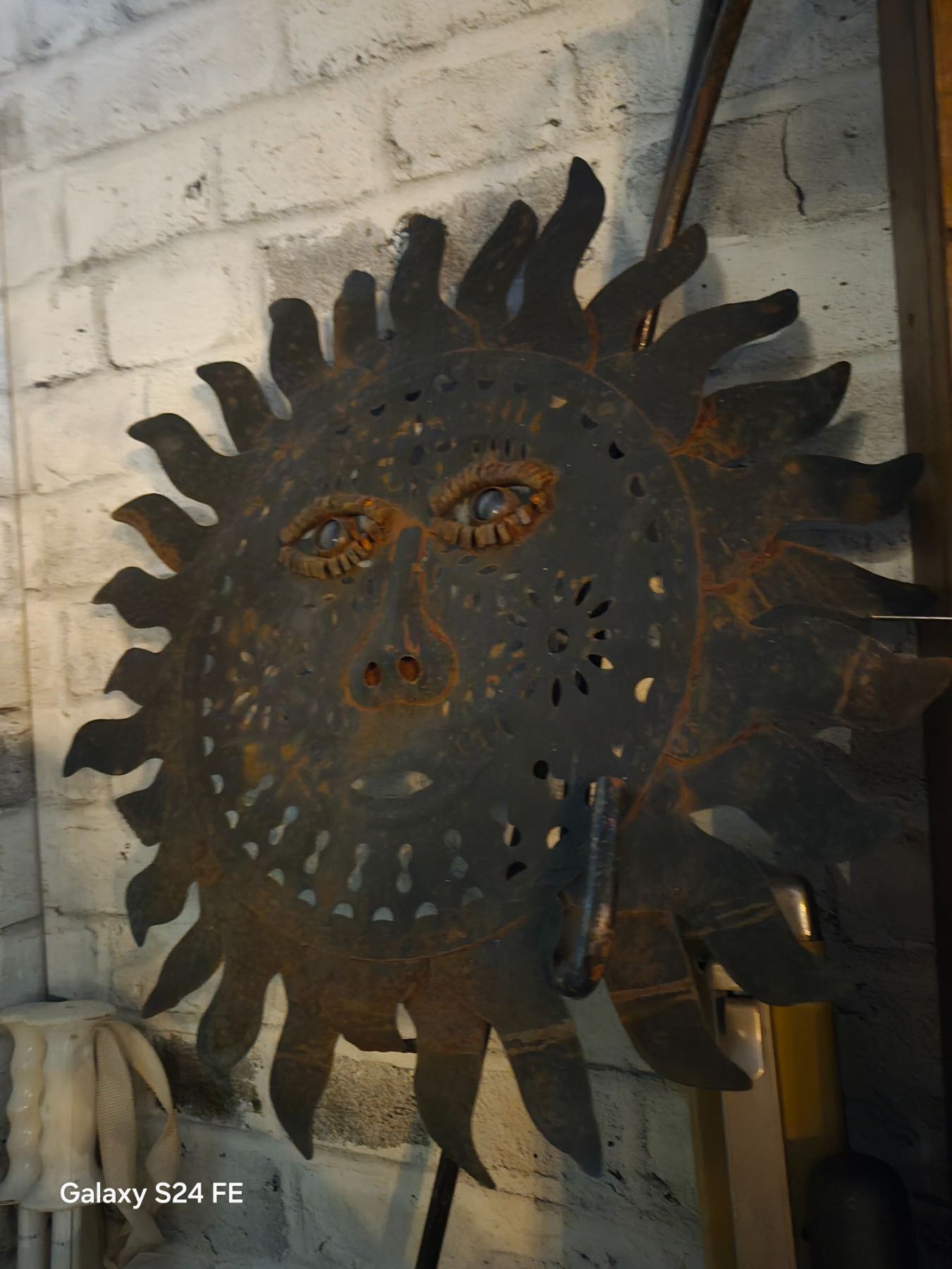 Rustic cutout sun face with hook, approx. 24" diameter. Aged patina for that perfect eclectic vibe.
