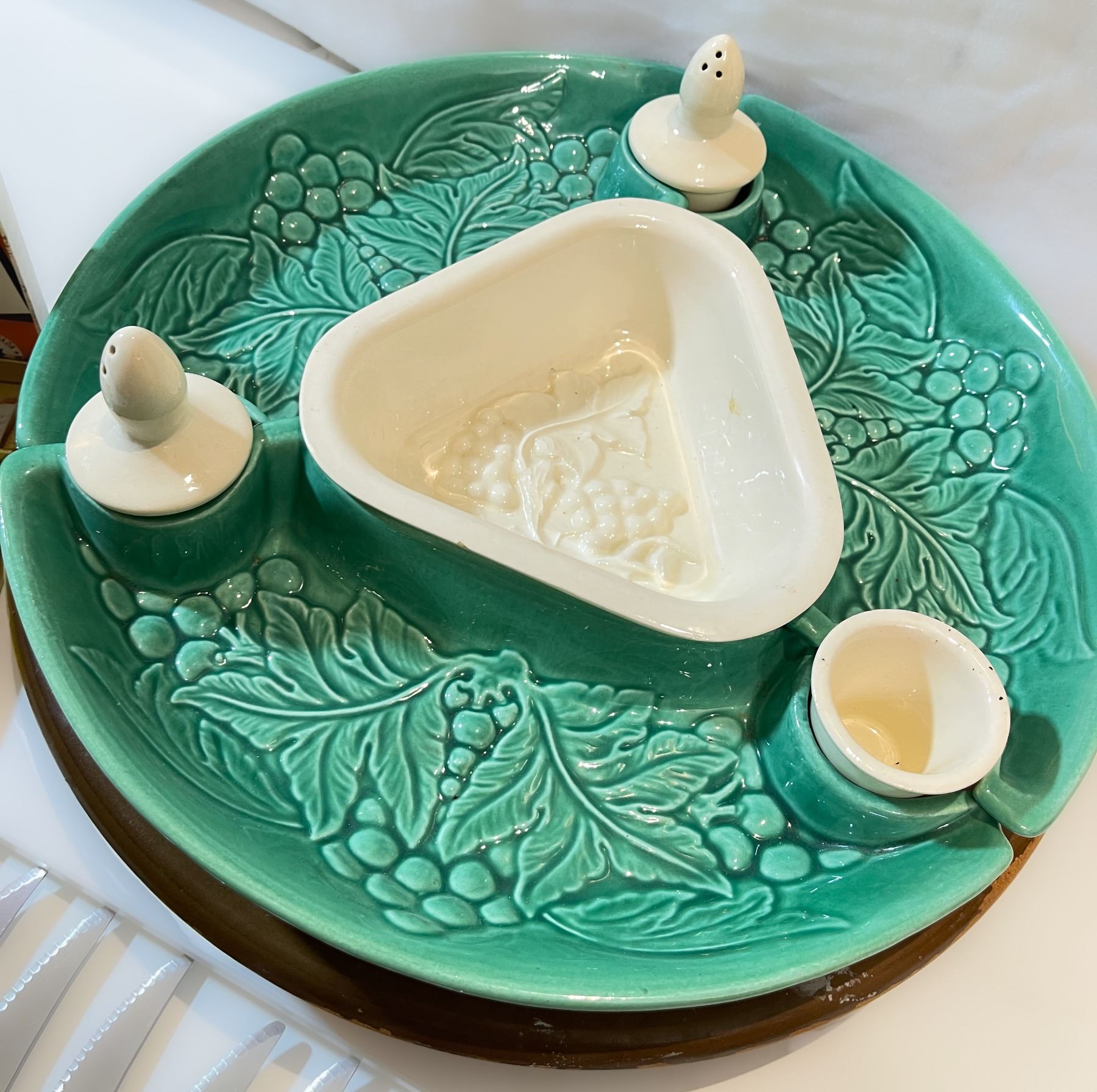 tylish mid-century entertaining set featuring a turquoise and white ceramic lazy Susan, Crown Lynn 1033 gravy boat, and Crown Sheffield cutlery set with rich Bakelite handles. Includes a boxed set of Dinkee Bakelite cocktail knives in original packaging. All pieces show classic retro design and quality craftsmanship, ideal for display or entertaining.