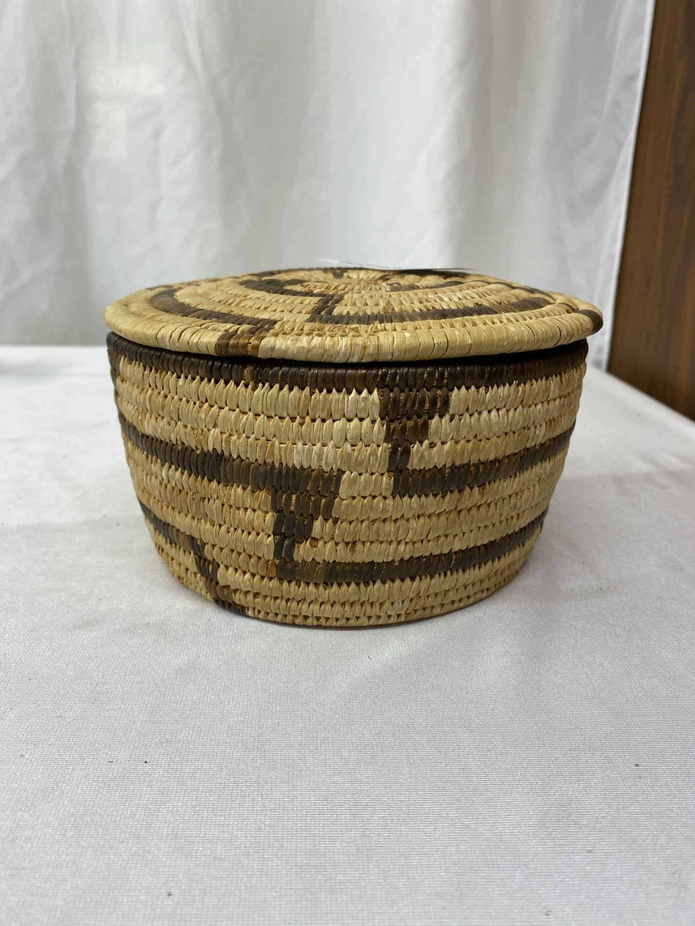 Vintage Mid Century Hand Woven, Papago Indian Lidded Basket In Excellent Condition 7.5x4