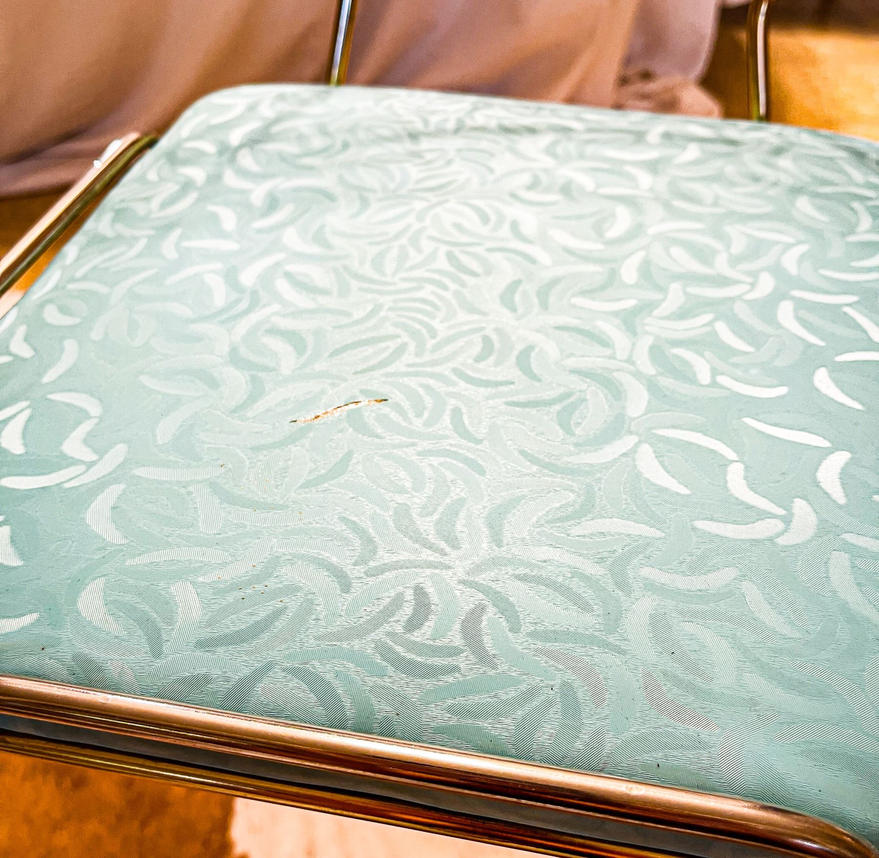 Vintage mid-century vanity chair with sculptural brass-plated frame and turquoise vinyl seat. Features hairpin legs and geometric open-back design. Small tear in vinyl has been sealed. Stylish and lightweight — perfect for vanity, desk, or accent seating.