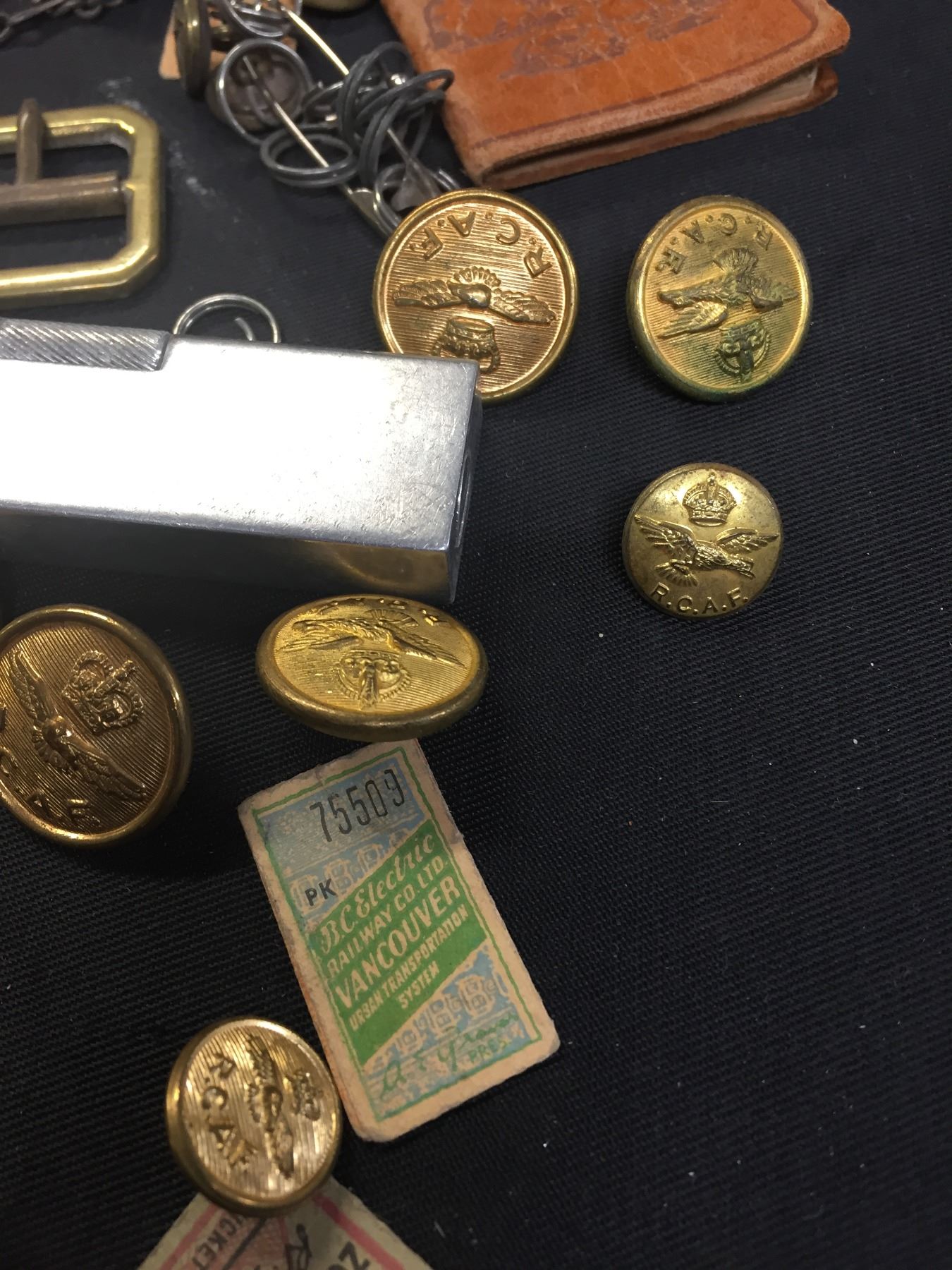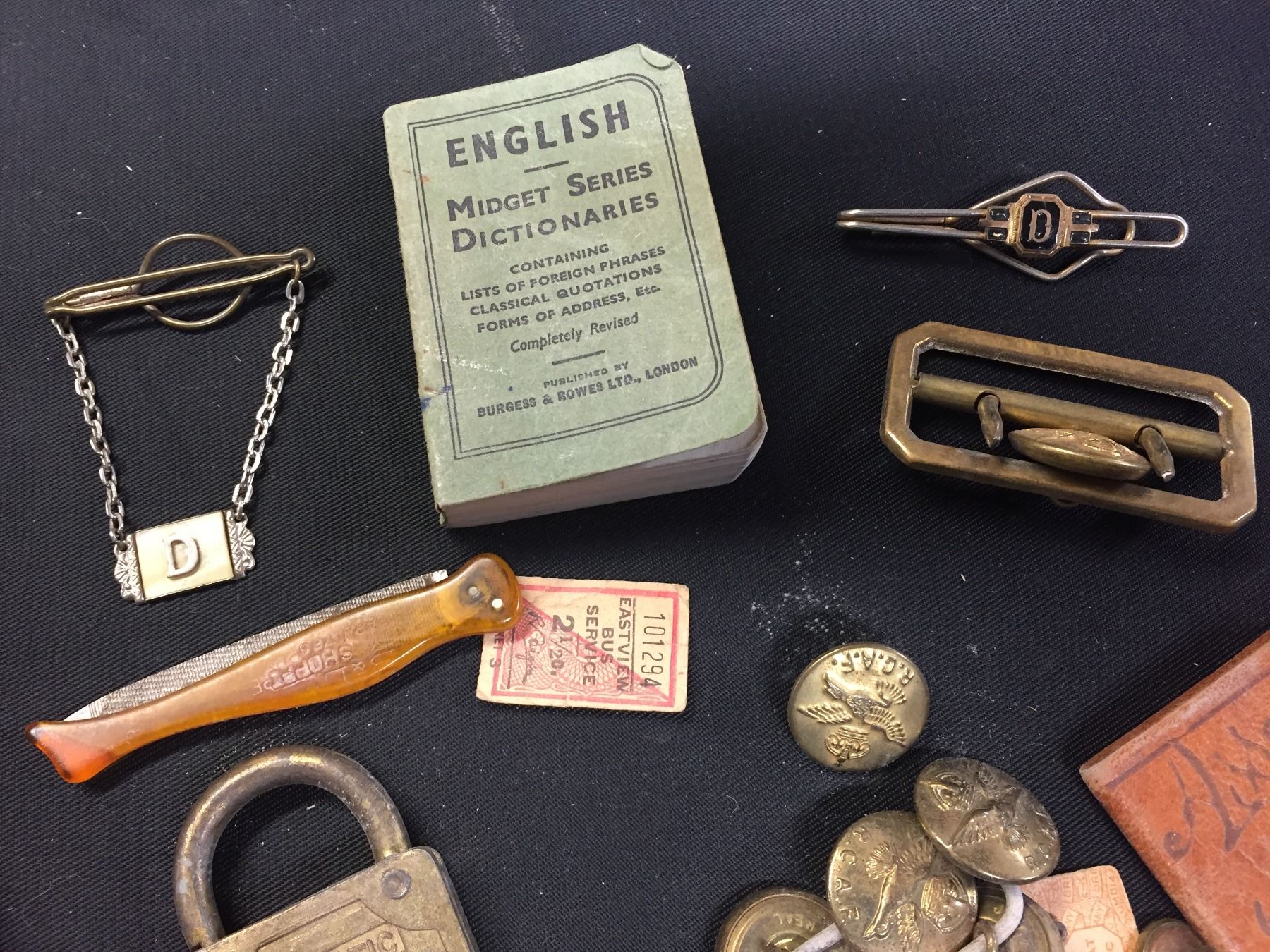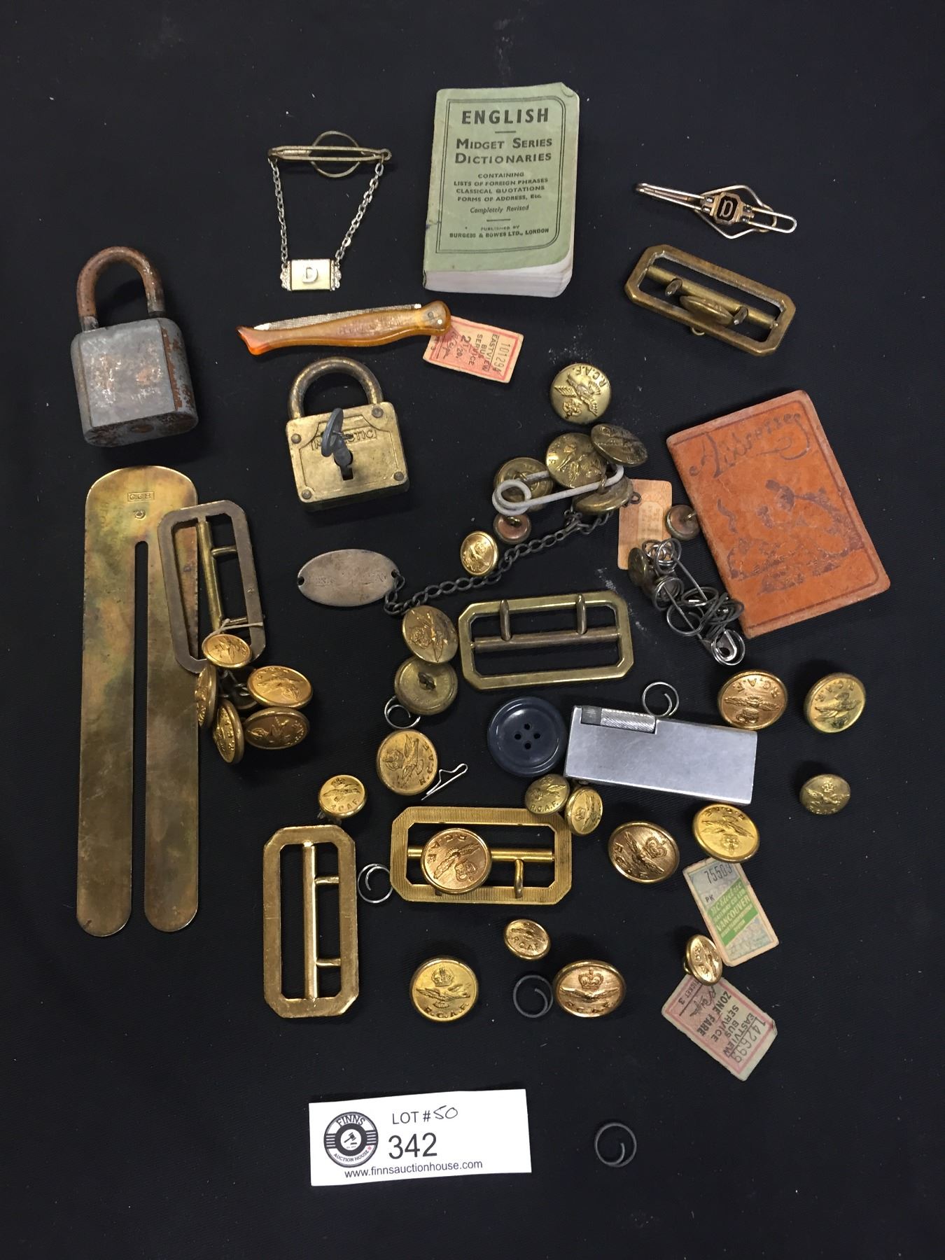Vintage Military Lot of Buttons, Ration Coupons, Locks, Tie Clips Etc