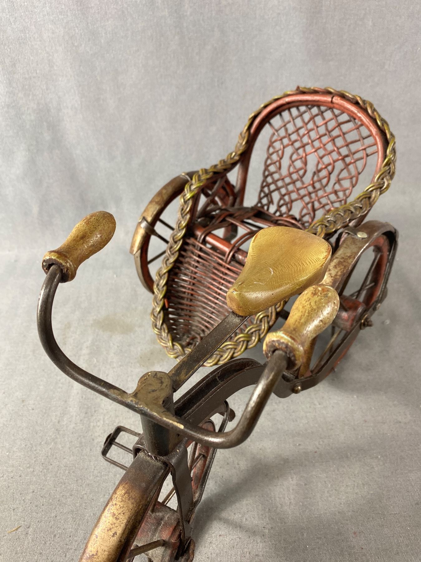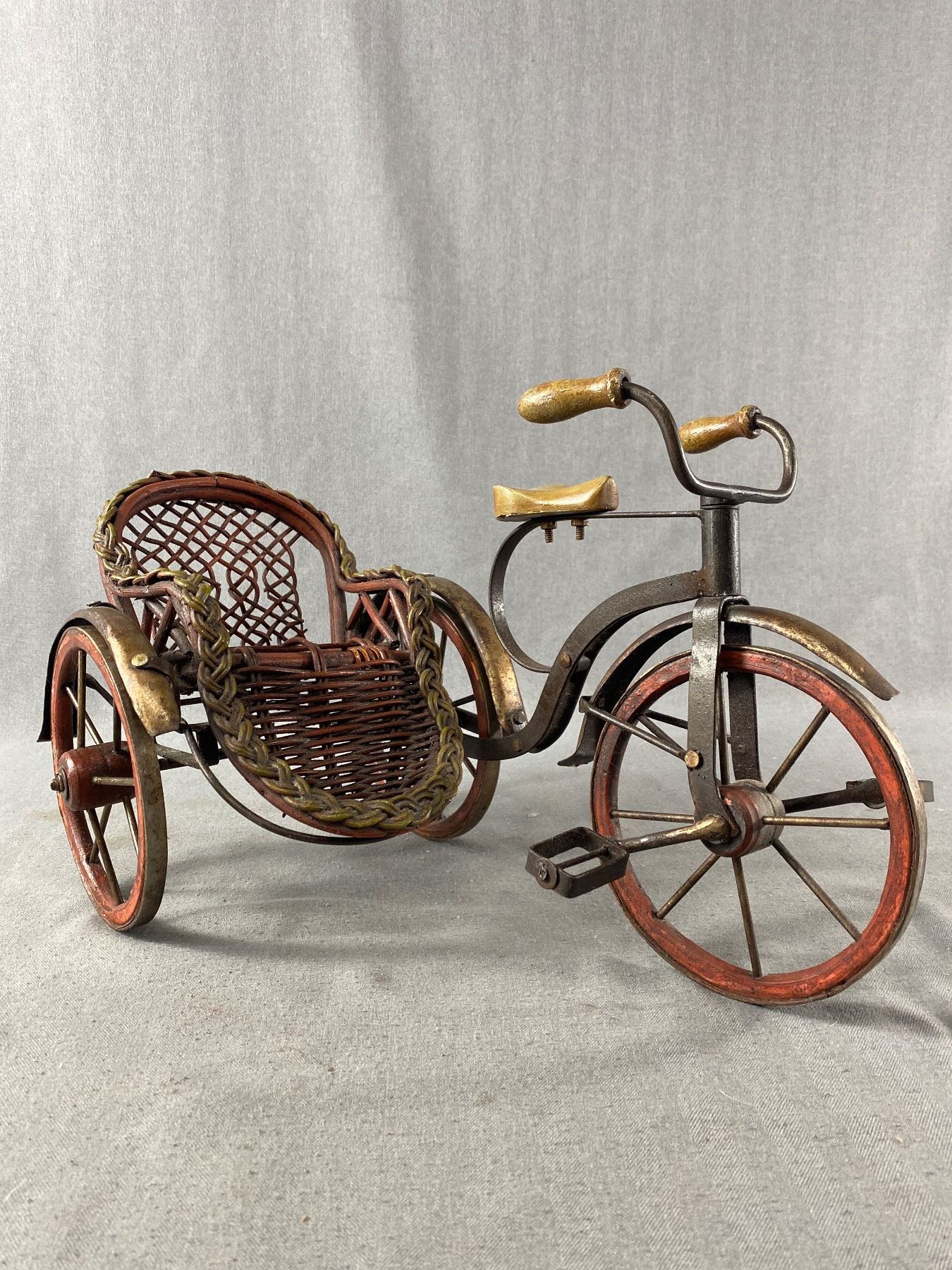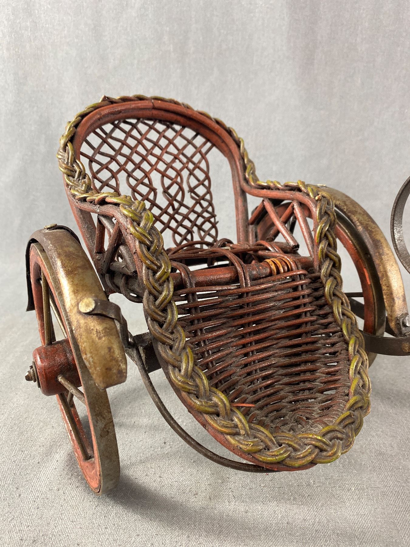 Vintage Miniature Cast Bicycle w/ Rattan Side Car - 17" L x 10" H