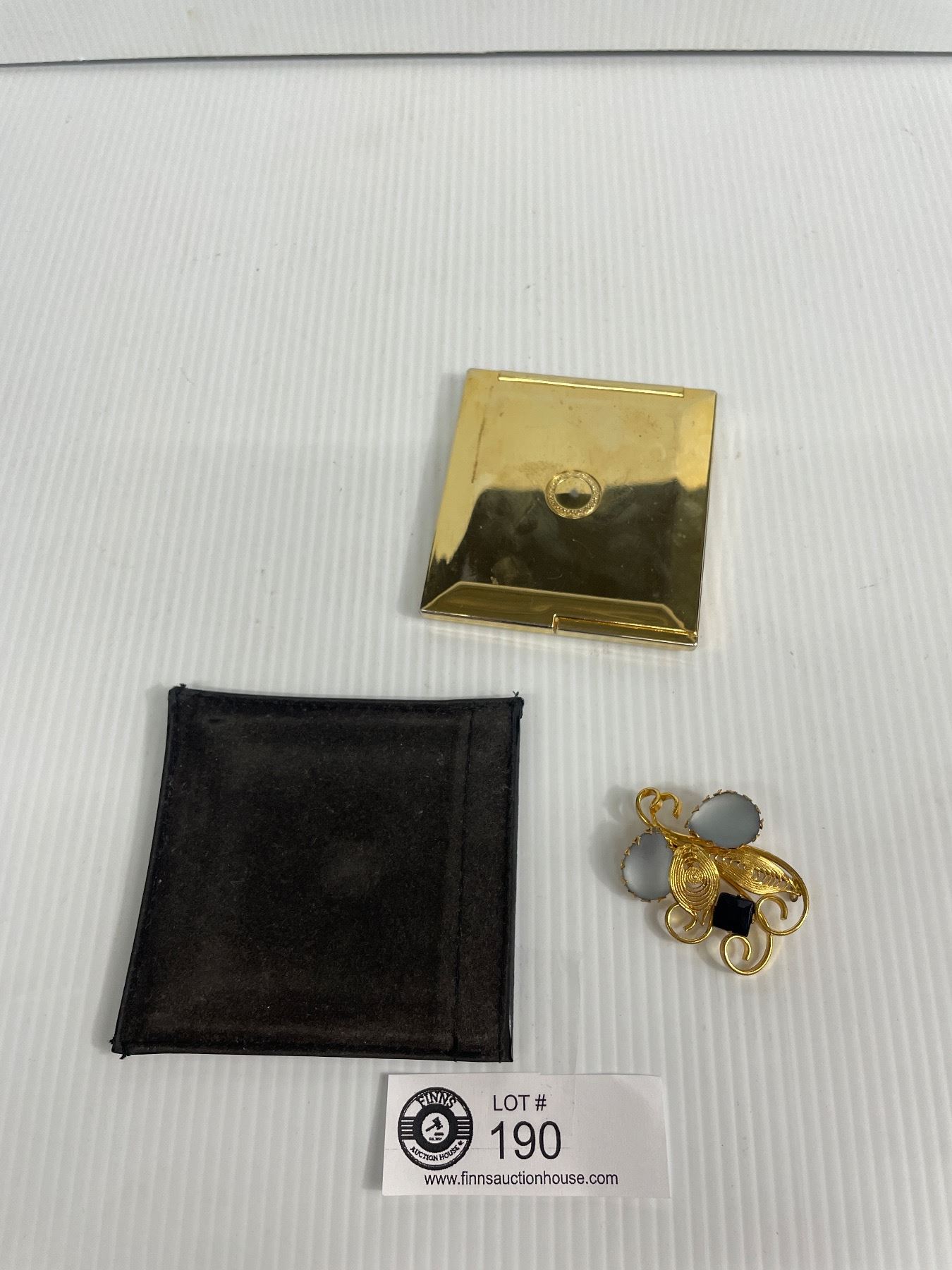 Vintage Mirror Compact & Lovely Brooch w/Blue Stones