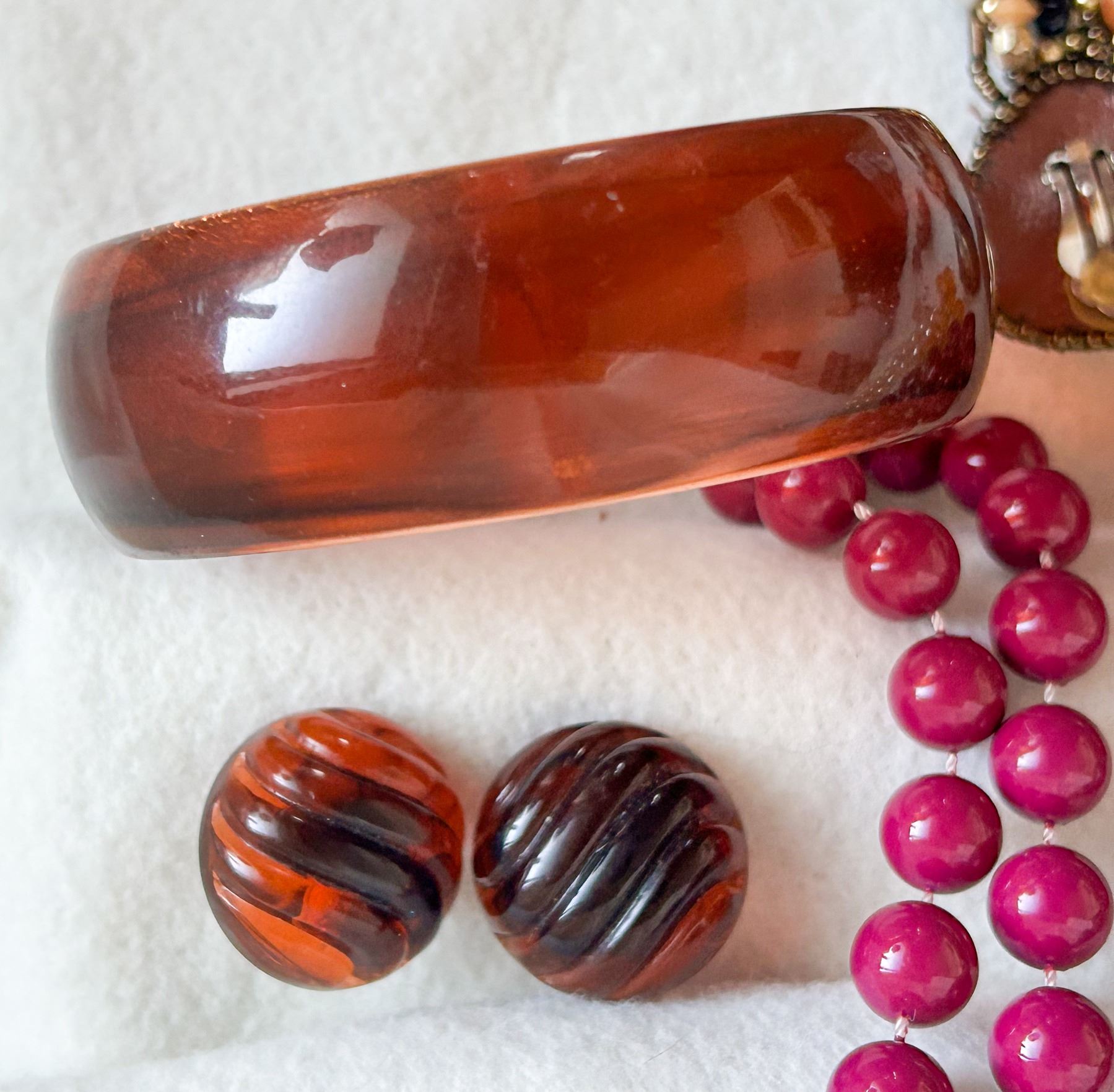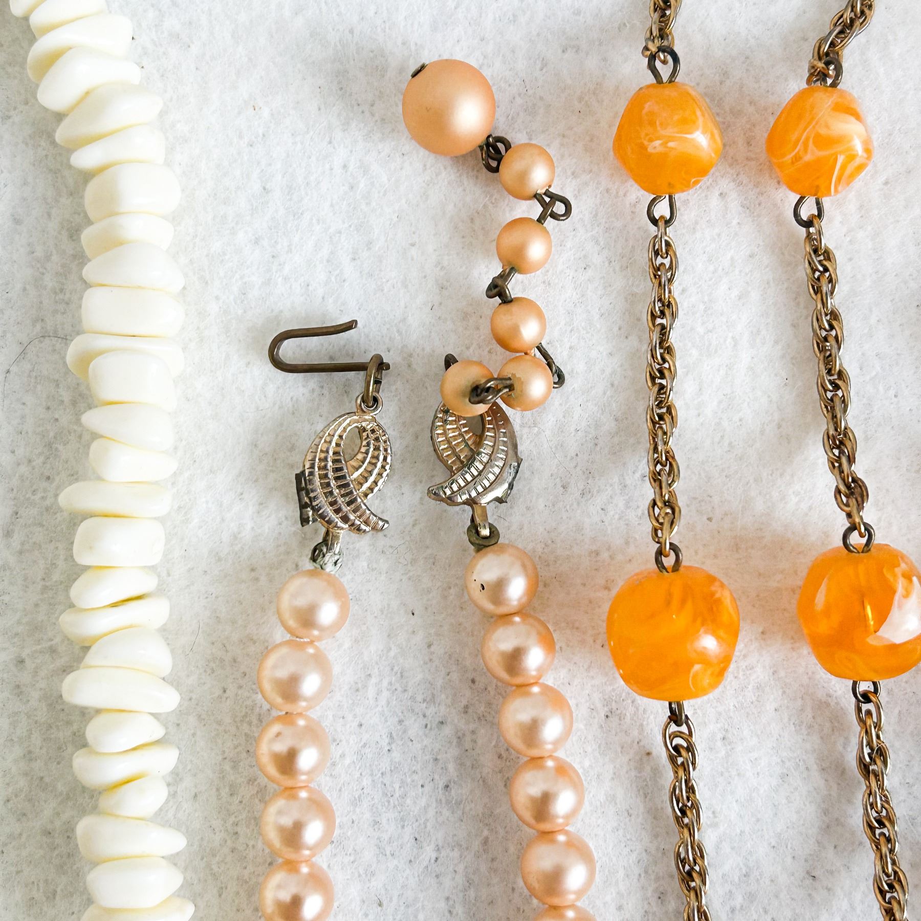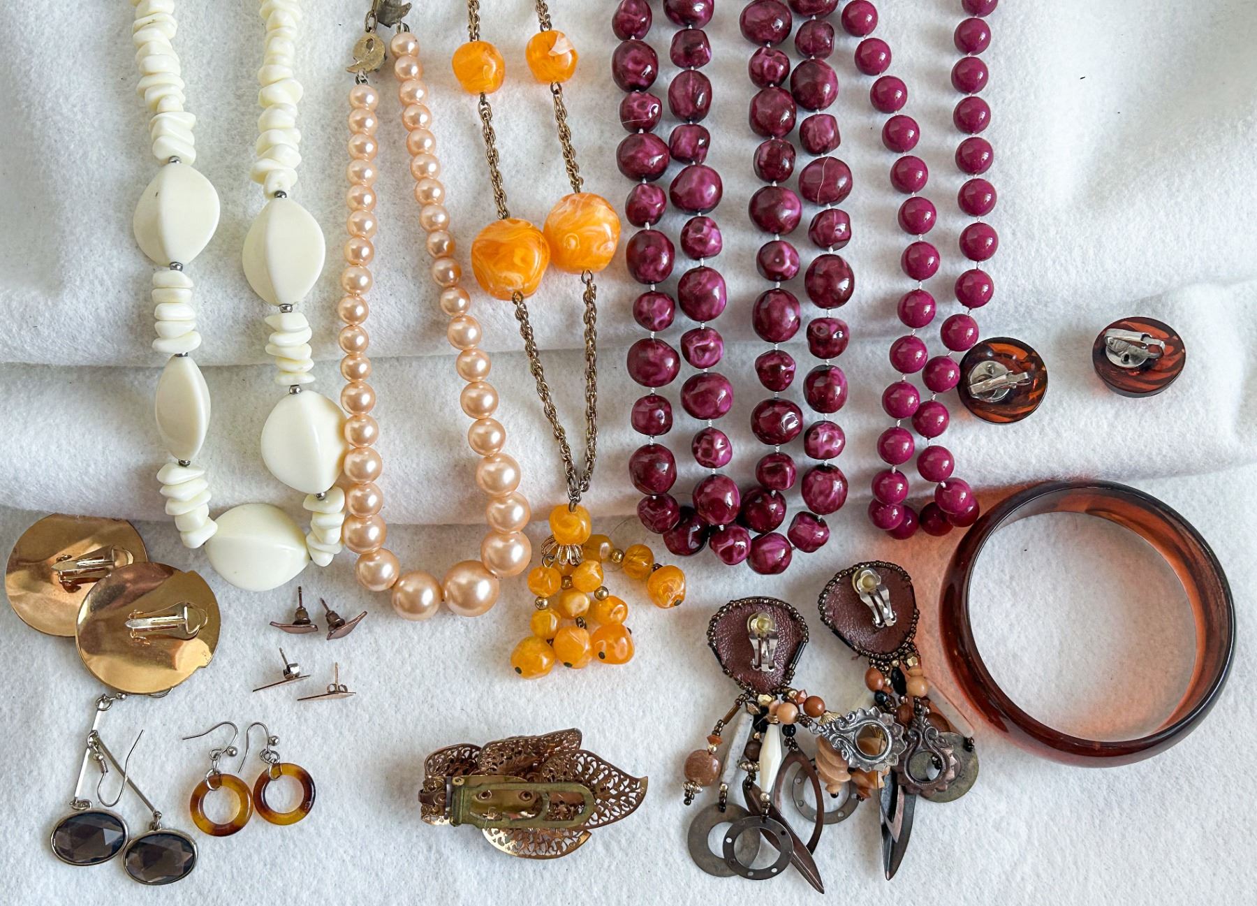 Mixed lot featuring bold statement earrings (2 clip-on), beaded necklaces in white, peach, orange, and deep berry tones, a retro amber lucite bangle, and a detailed metal scarf clip.