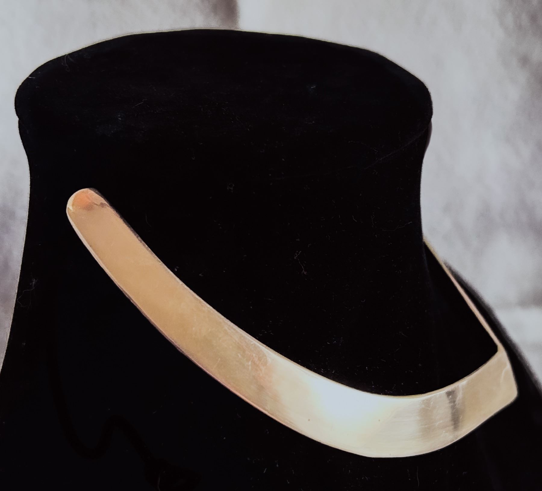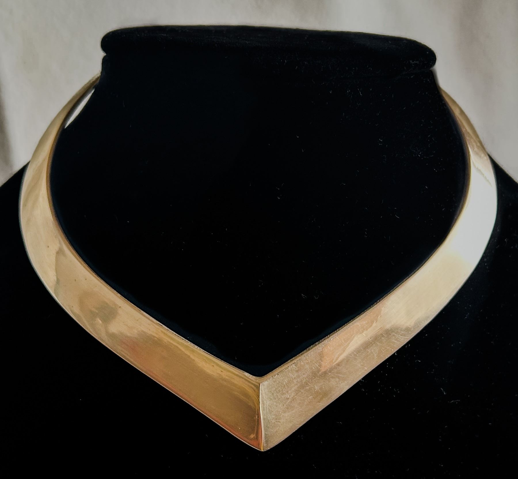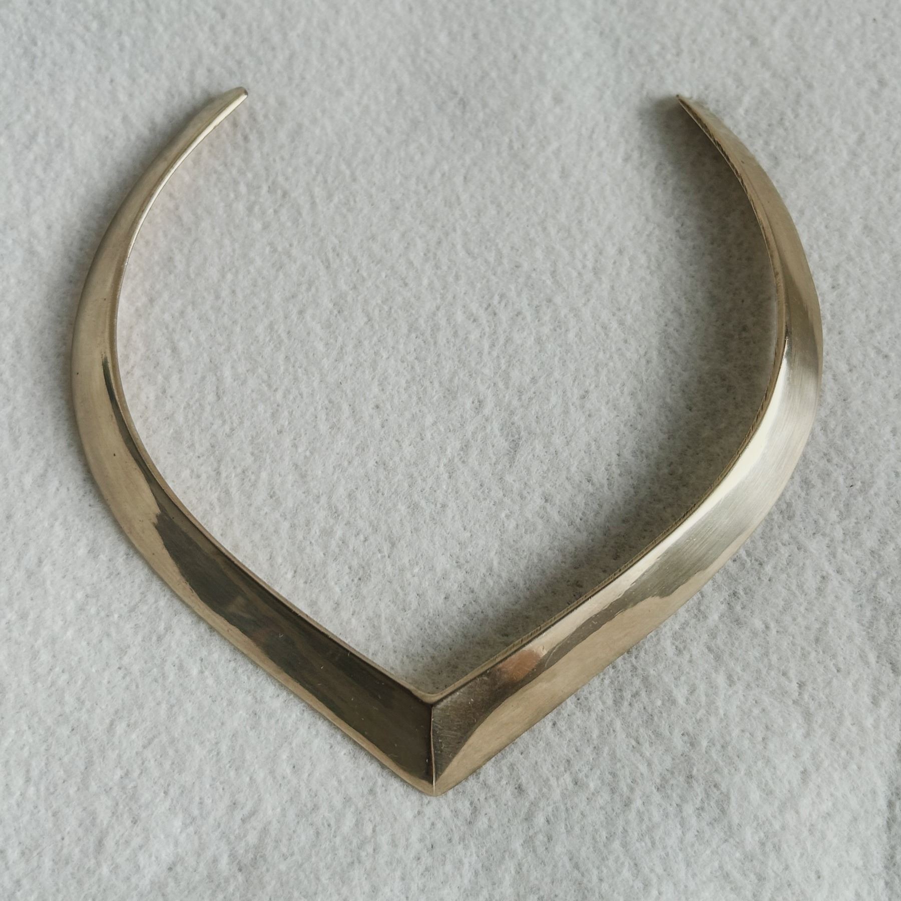 Striking vintage neck cuff in sculptural V-shaped form, crafted from polished brass. Features a bold, minimalist Brutalist/Modernist design with high visual impact. Rigid collar style with an angular silhouette. Unmarked.