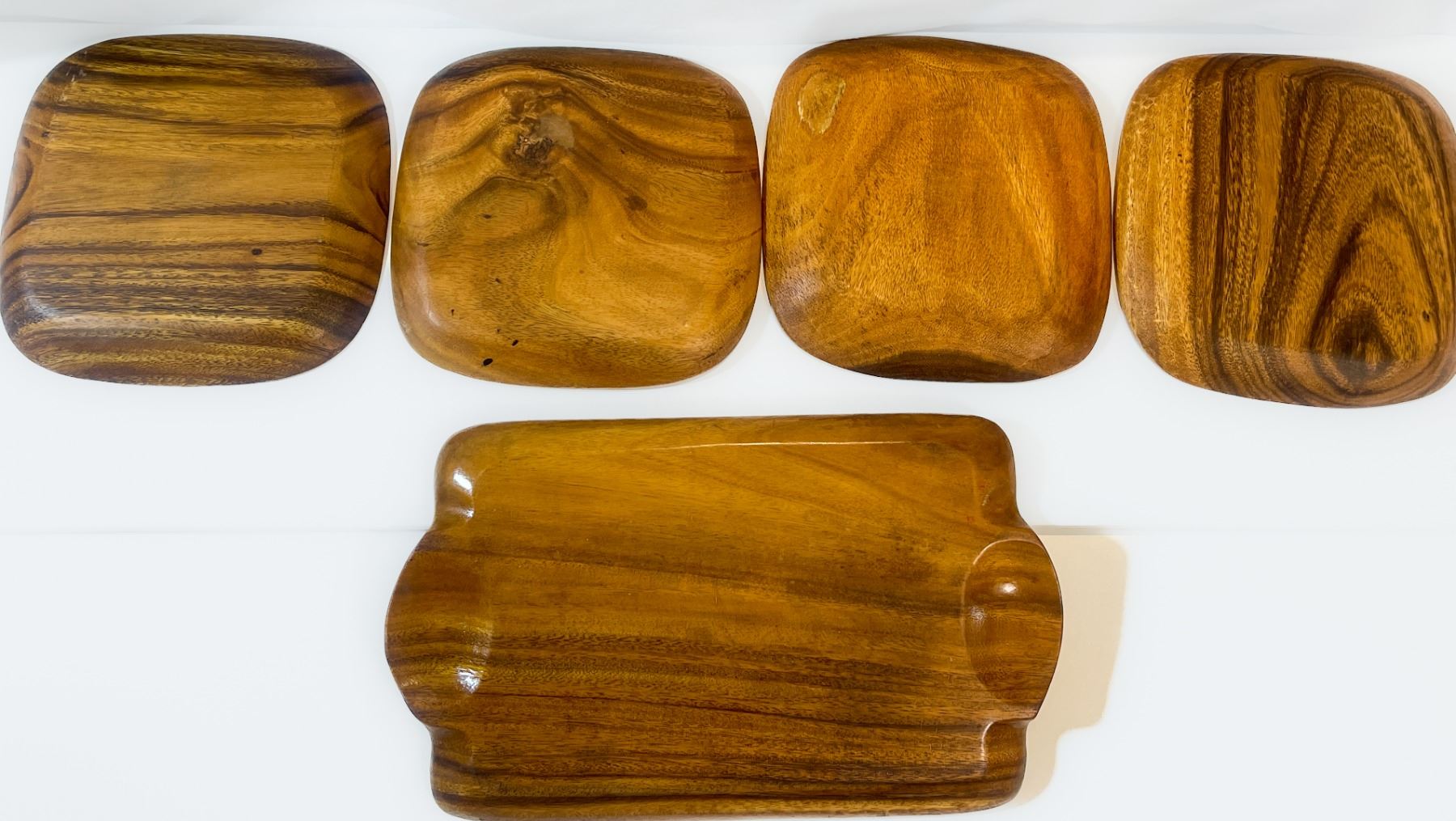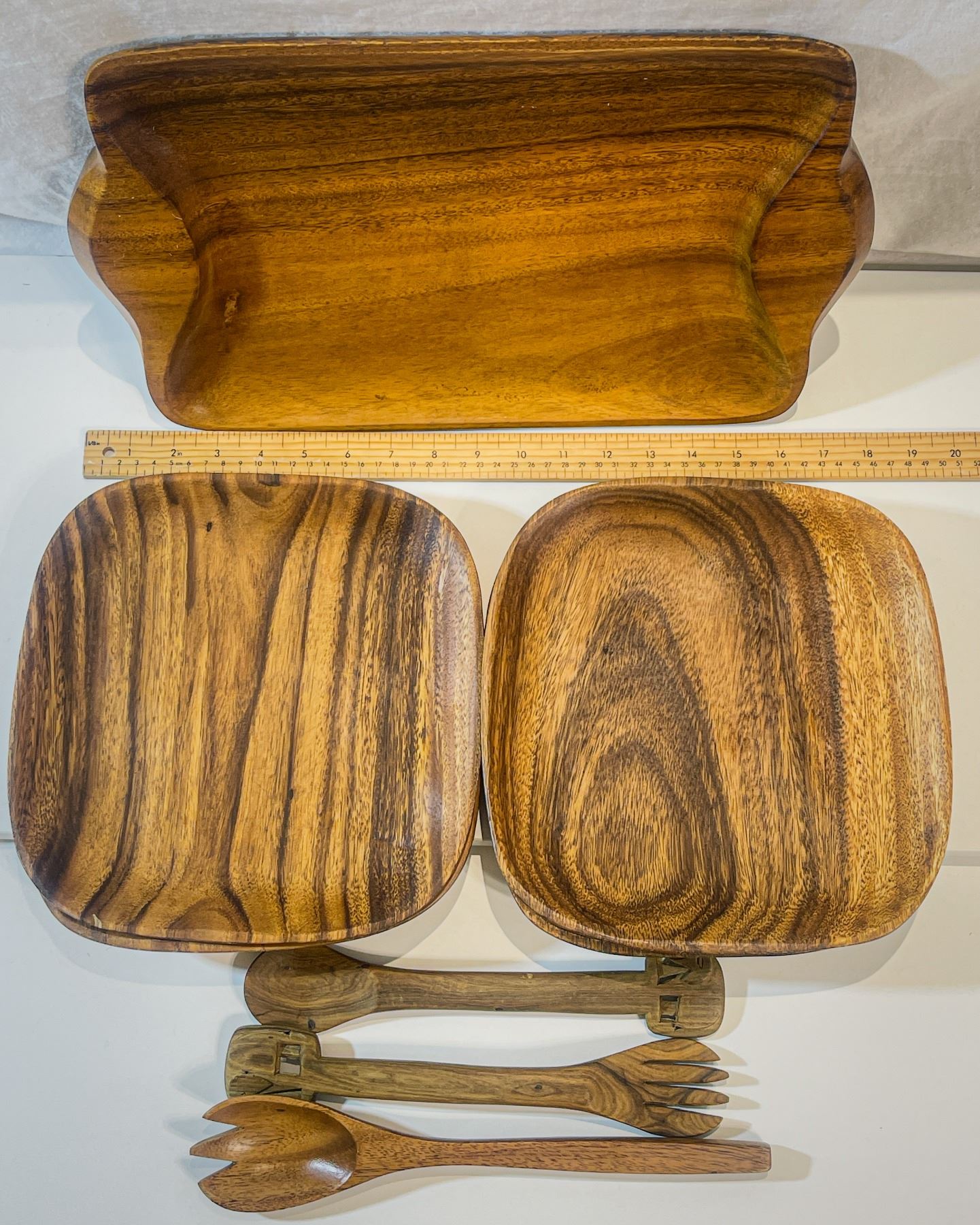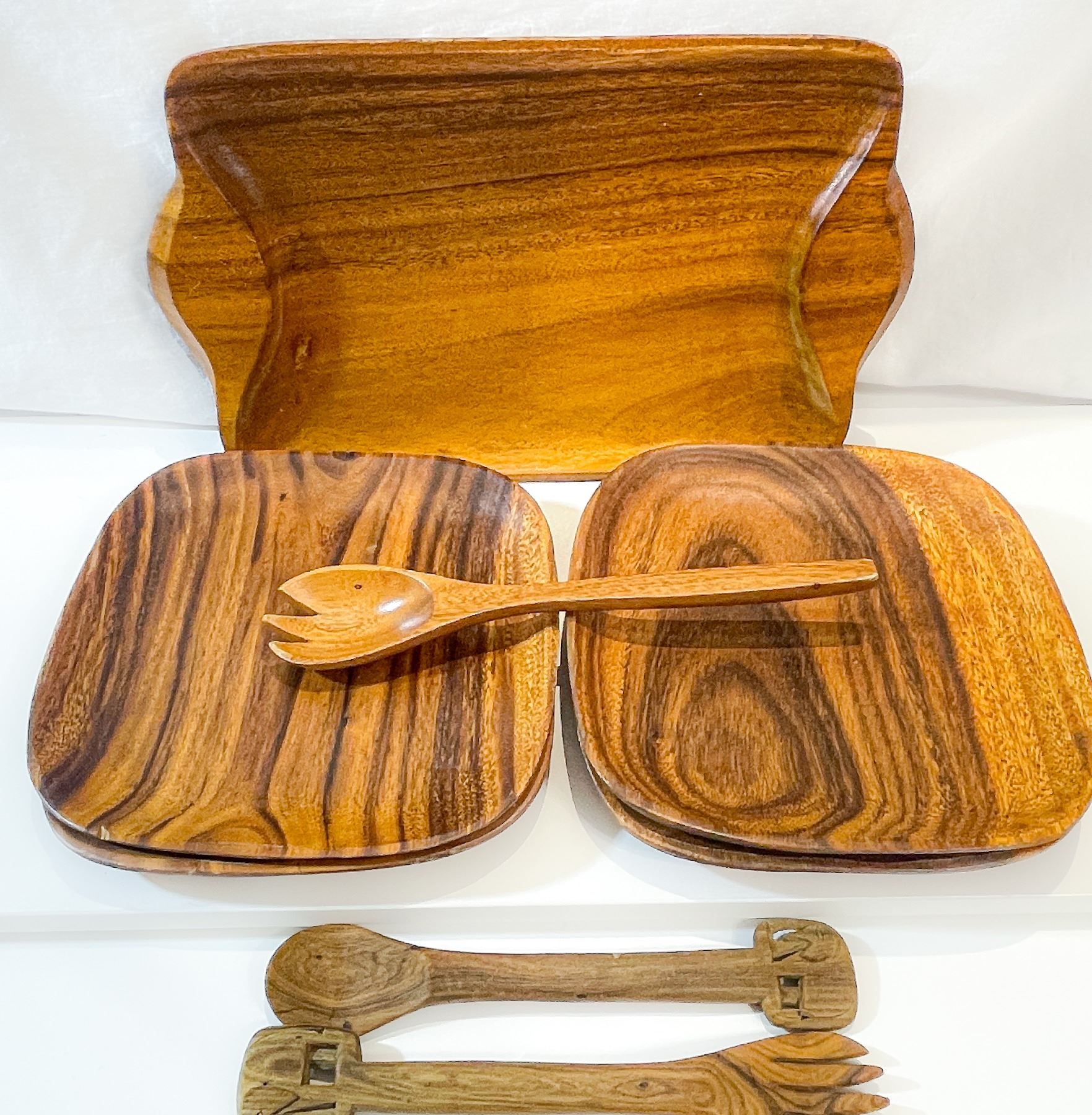 Charming vintage wooden serving set featuring four rectangular Monkey Pod plates/trays and a large teak tray, each showcasing unique wood grain and warm tone variations. Includes a large handled serving platter, two vintage wooden salad forks, and a serving spoon. All pieces are handcrafted, adding natural character and a mid-century tropical flair. Light surface wear consistent with age; ideal for display, entertaining, or tiki-style decor