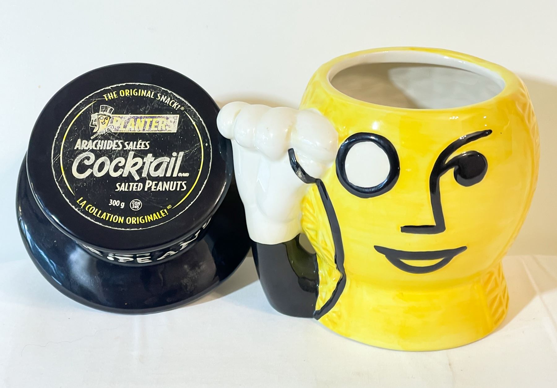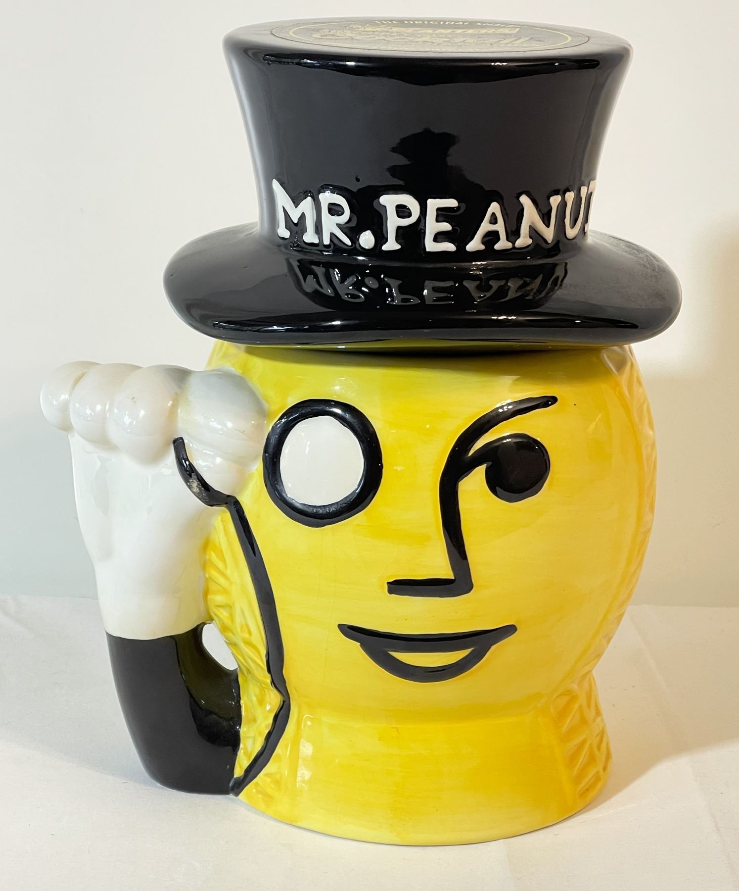 Charming vintage Mr. Peanut ceramic cookie jar featuring the iconic character in yellow with a black top hat, monocle, and raised white-gloved hand handle. The original Planters paper label remains intact on the top of the hat, adding to its collectible appeal. A fun and nostalgic advertising piece in very good vintage condition with light wear consistent with age.