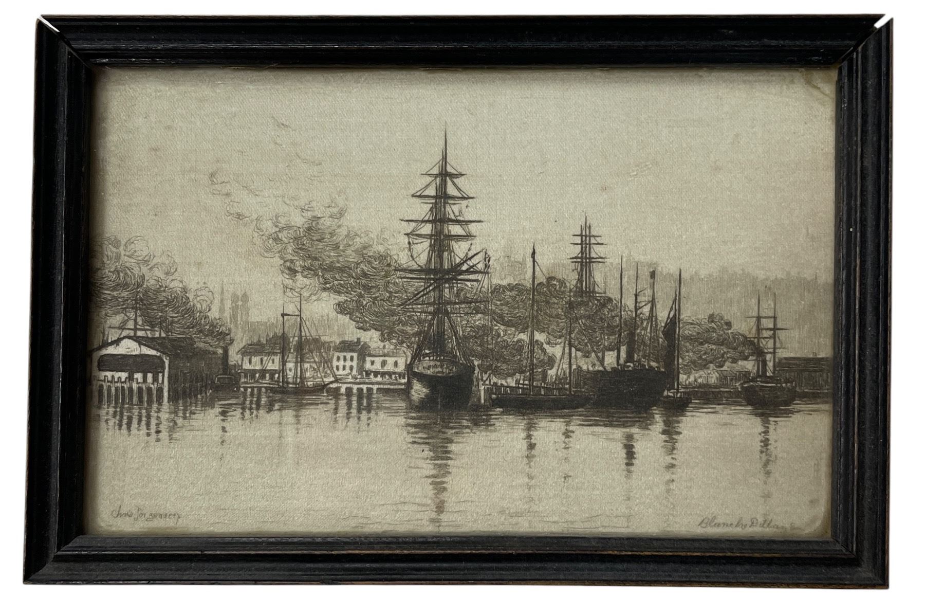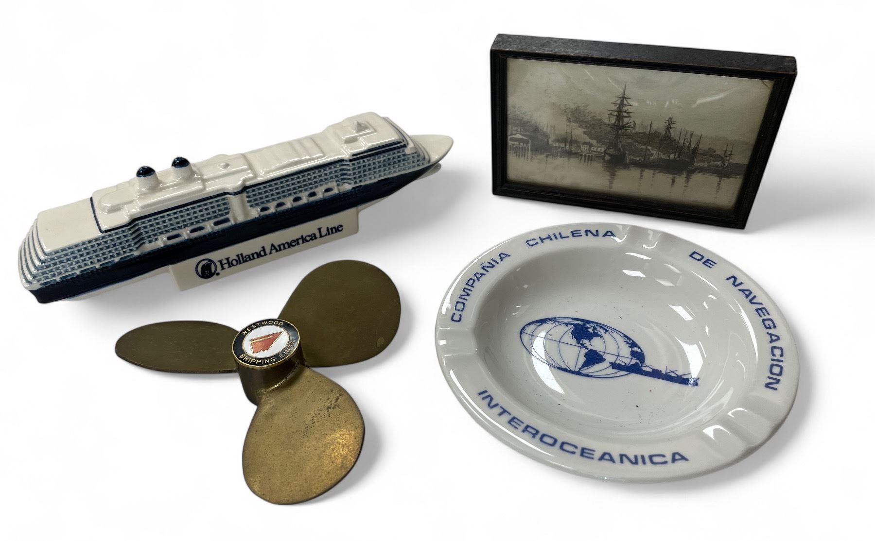 Vintage Nautical Collectibles: Ashtray, Holland Lines Delt Porcelain Boat, Brass Motor, & Framed Silk Screen Print