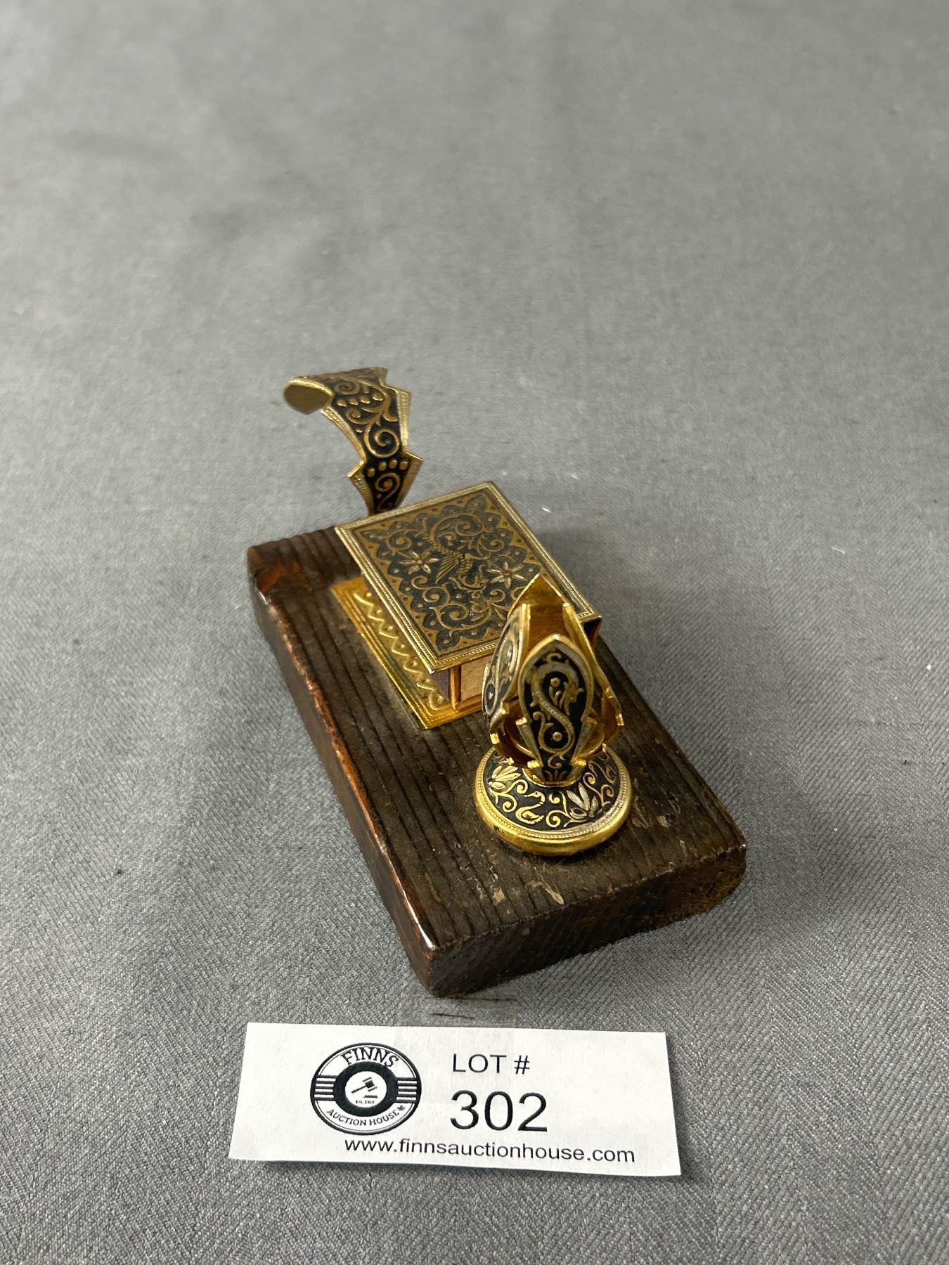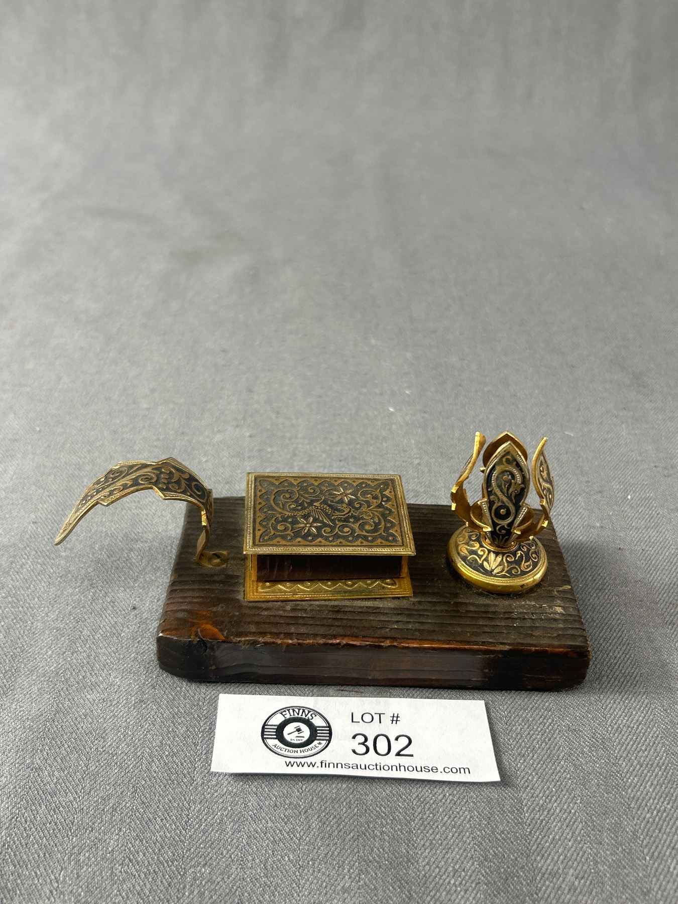 Vintage Nicely Detailed w/ Dragons Match Box & Cigarette Holder On Wood Base