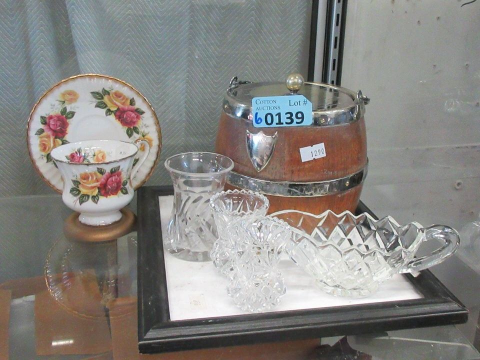Silver banded biscuit barrel is porcelain lined and is 5" tall x 7" diameter. Includes 3" crystal vase, 2 vintage glass pieces and 3 teacups with saucers.