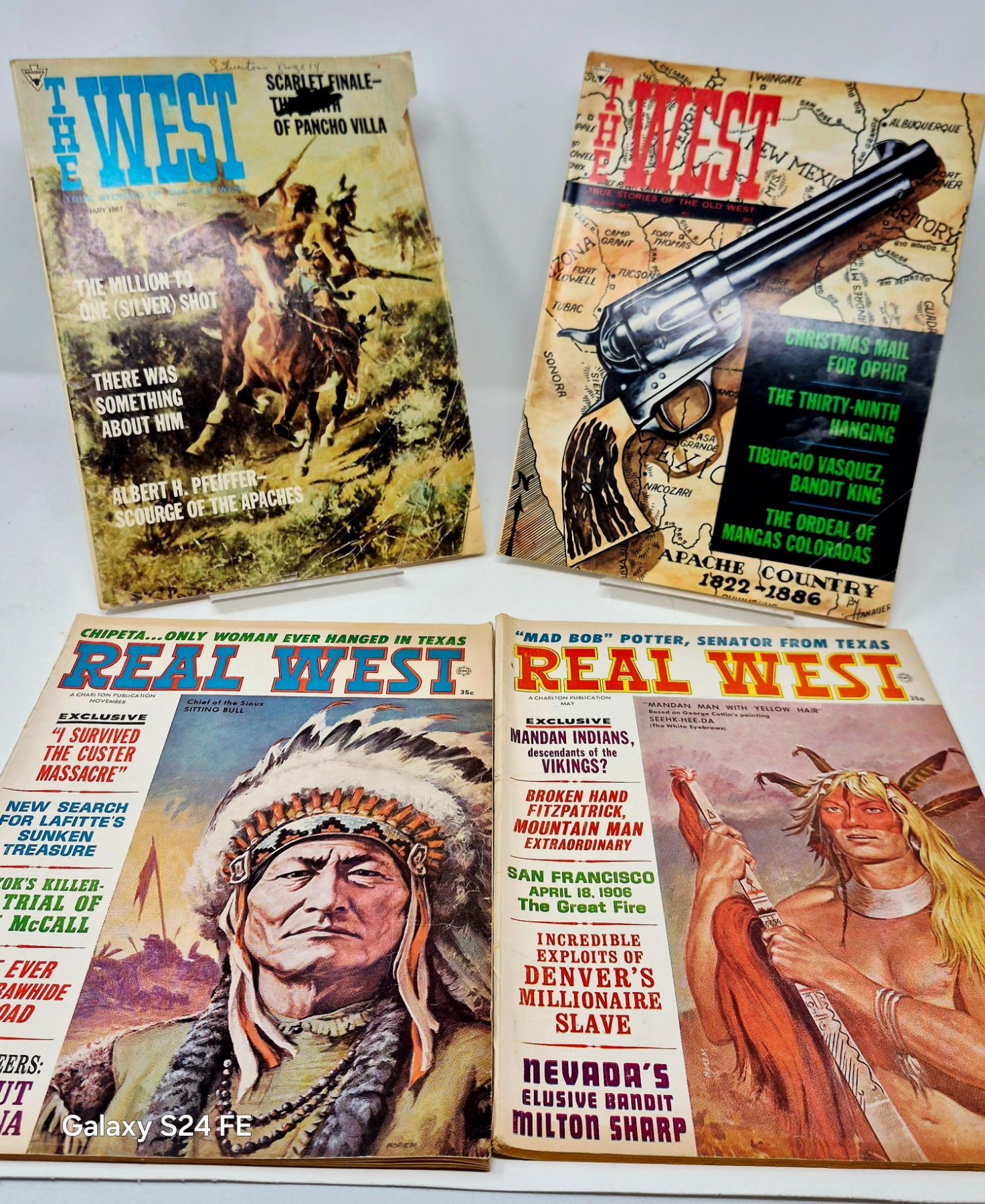 Includes 2 issues of *The West* and 2 issues of *Real West*, featuring vivid frontier tales, lawmen and outlaws, and Native American history. Covers include Sitting Bull, Pancho Villa, and famous hangings. Great condition for age, perfect for Western collectors or history buffs.