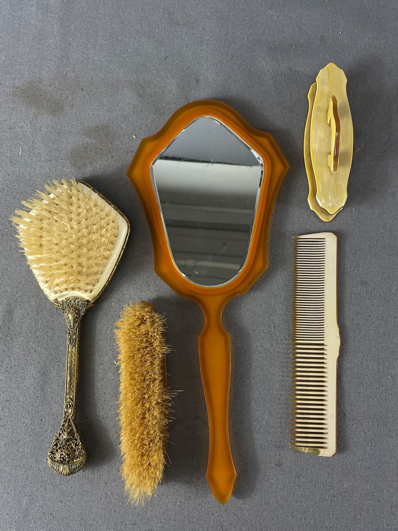 Vintage Pearltone? Laquer Grooming Set Plus Ornate Metal Handle & Embroidered HairBrush