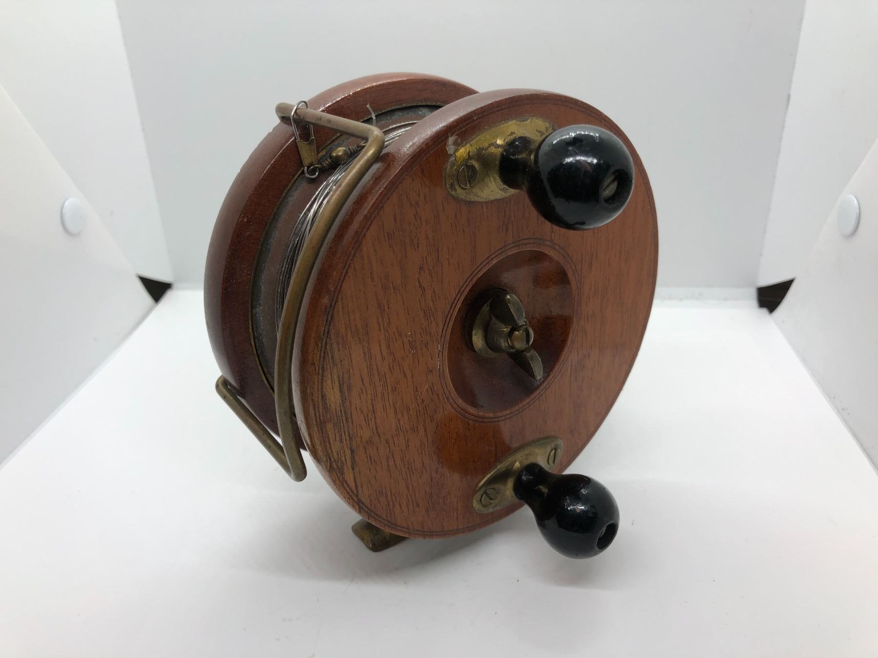 Vintage Peetz wood & brass 5in model 1500 trolling reel w/ original box