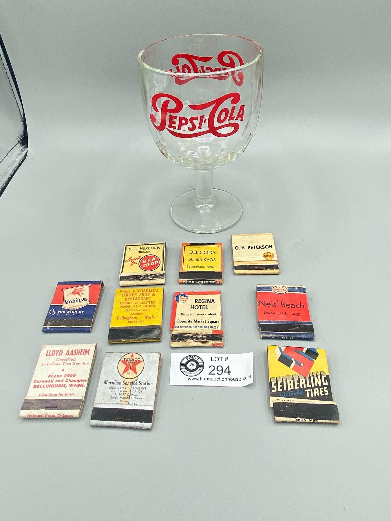 Vintage Pepsi Glass Filled With Automotive Matchbooks
